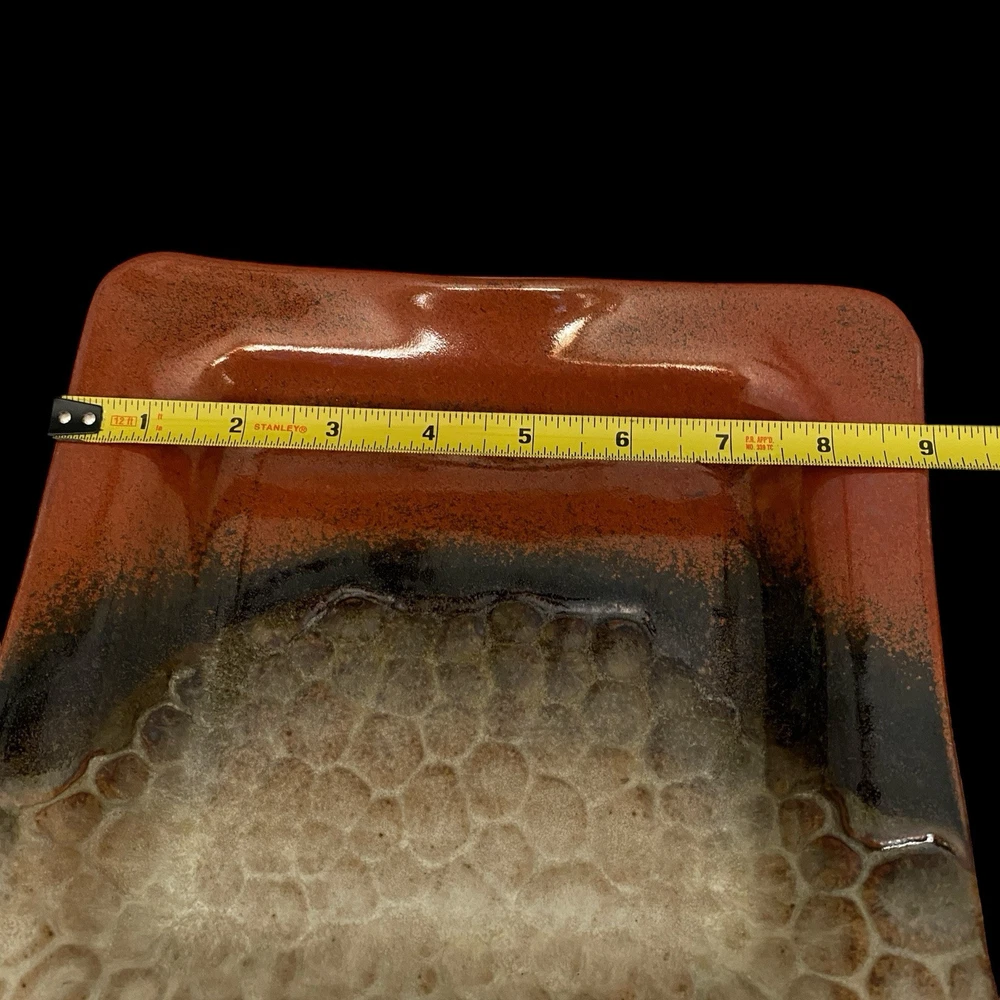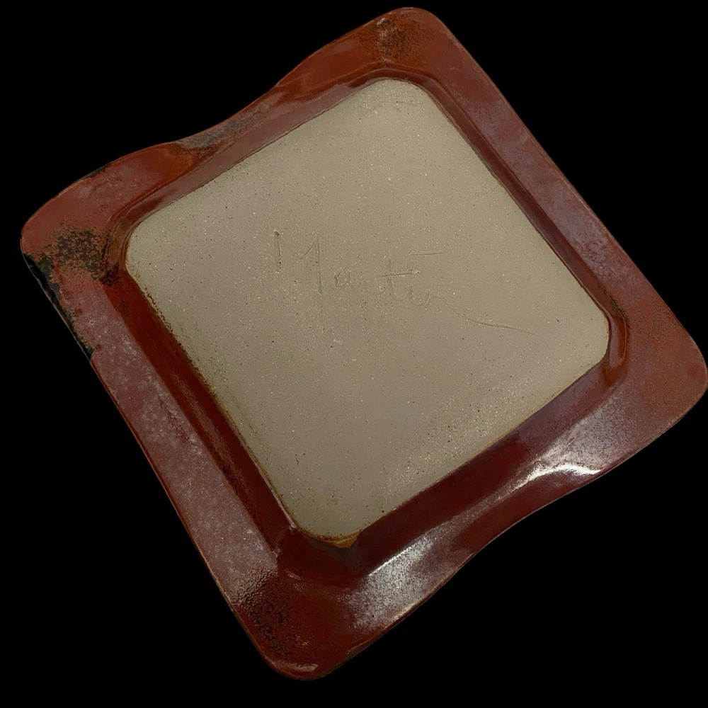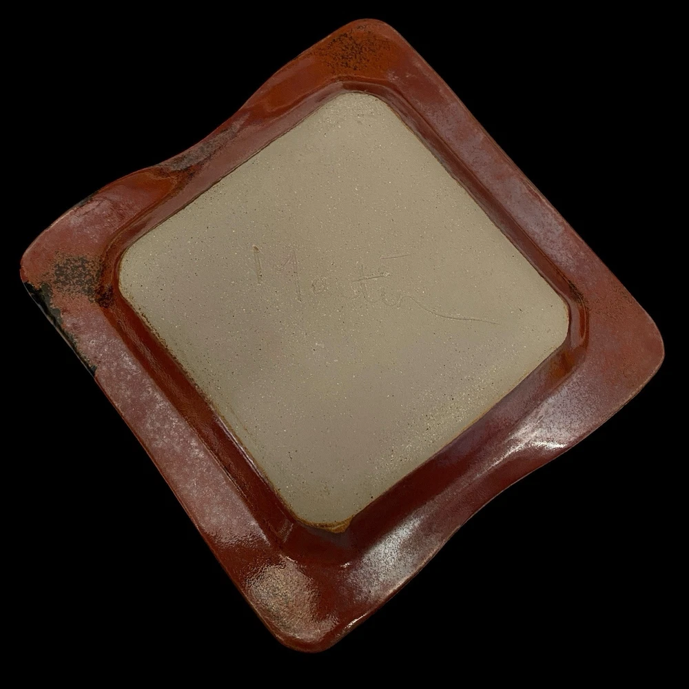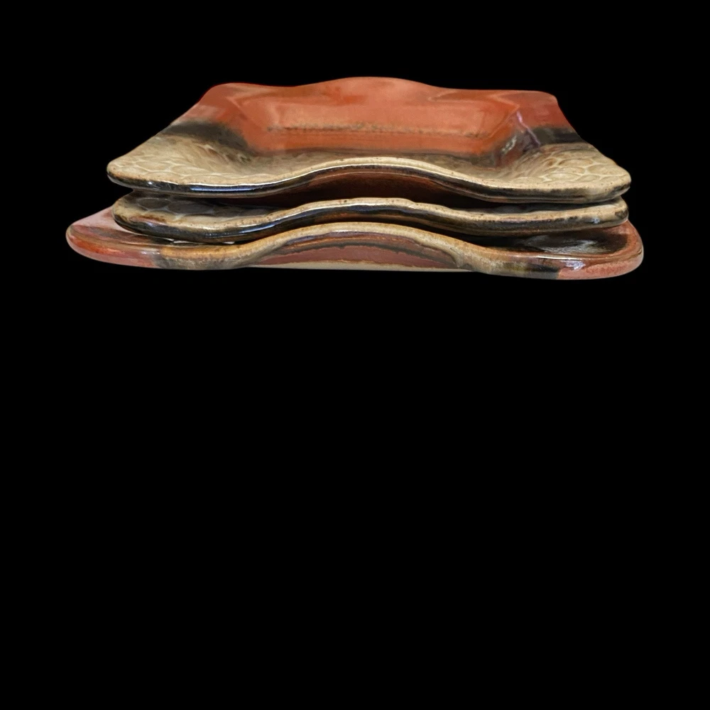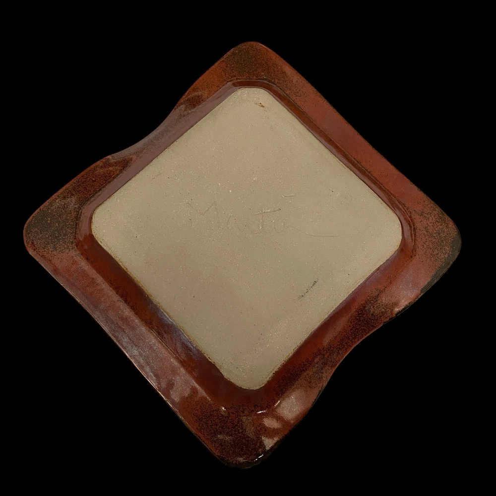 This Studio Pottery Art Plate Set of 3 is a vintage handmade collection by artist Martin. The square plate set is crafted from ceramic in a mid-century modern style. They feature a multicolor hand-painted design and are stackable, dishwasher safe, and decorative. Each plate is signed by the artist and showcases a glossy and matte cobblestone finish, making them a unique addition to any table setting. The largest plate measures approximately 10” and the 2 smaller plates measure approximately 9”. Signed Martin on the bottom. The 3 plates weigh over 8 pounds. They are in very good condition. No chips, cracks or crazing. See photos they are part of the description.