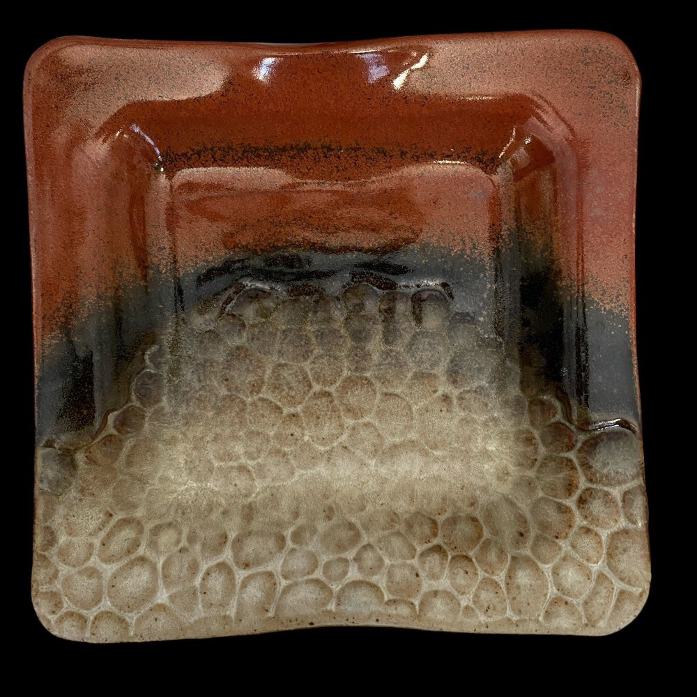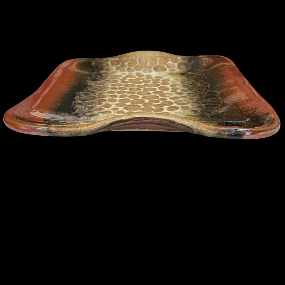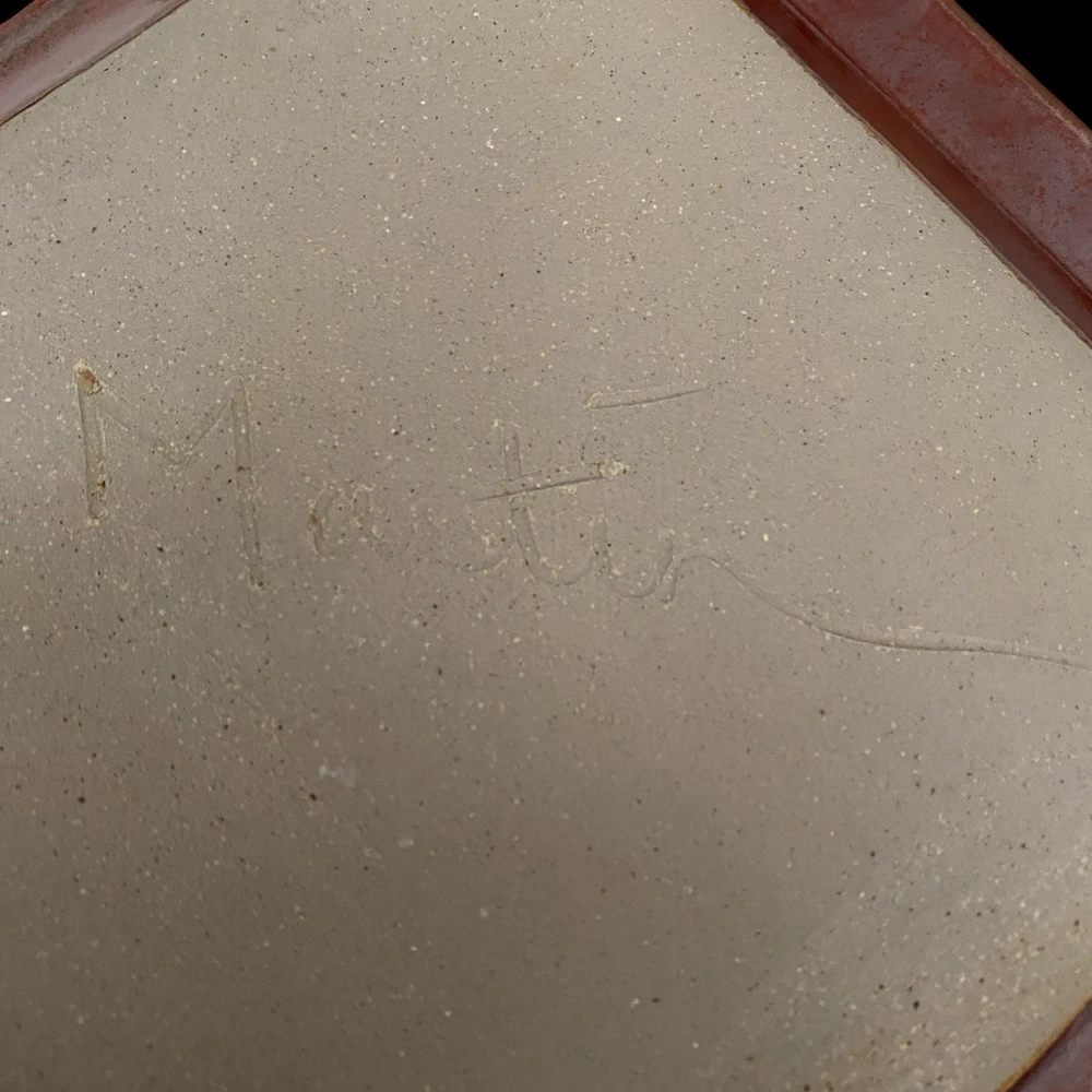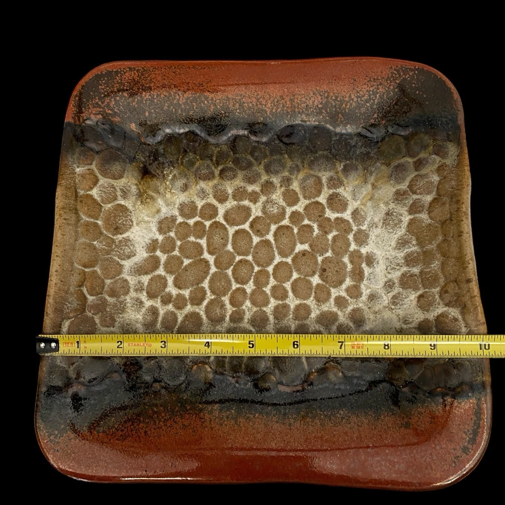 This Studio Pottery Art Plate Set of 3 is a vintage handmade collection by artist Martin. The square plate set is crafted from ceramic in a mid-century modern style. They feature a multicolor hand-painted design and are stackable, dishwasher safe, and decorative. Each plate is signed by the artist and showcases a glossy and matte cobblestone finish, making them a unique addition to any table setting. The largest plate measures approximately 10” and the 2 smaller plates measure approximately 9”. Signed Martin on the bottom. The 3 plates weigh over 8 pounds. They are in very good condition. No chips, cracks or crazing. See photos they are part of the description.