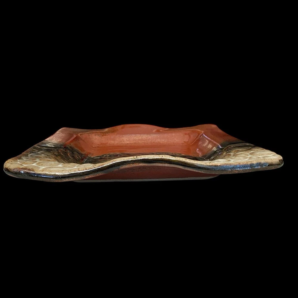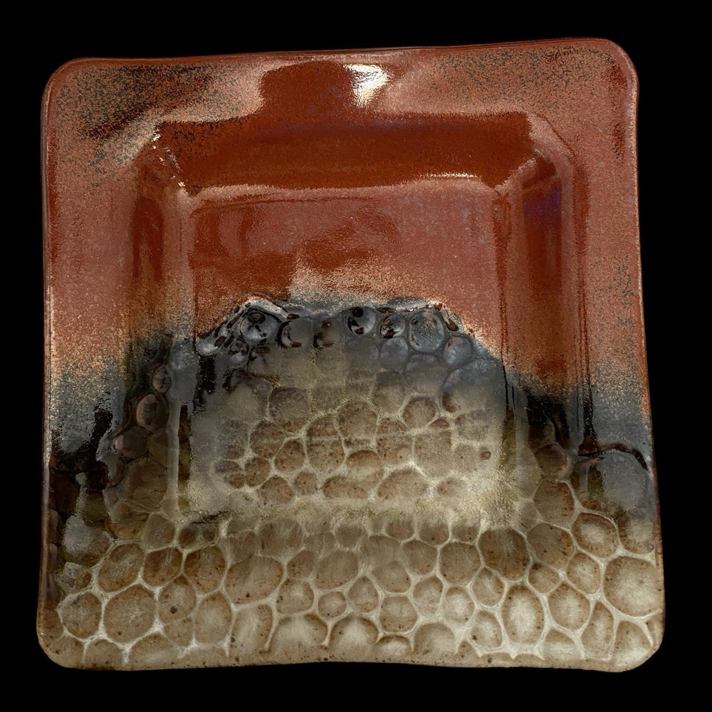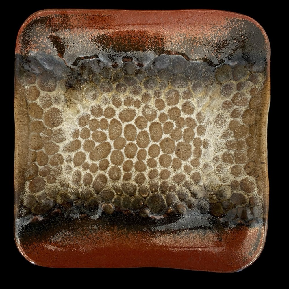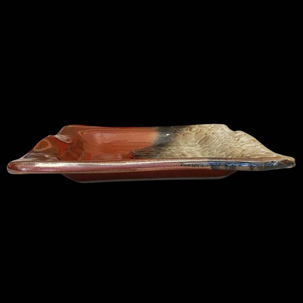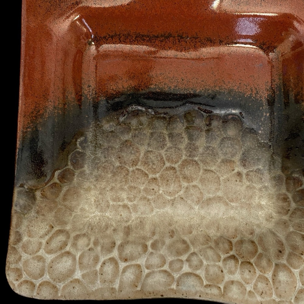 This Studio Pottery Art Plate Set of 3 is a vintage handmade collection by artist Martin. The square plate set is crafted from ceramic in a mid-century modern style. They feature a multicolor hand-painted design and are stackable, dishwasher safe, and decorative. Each plate is signed by the artist and showcases a glossy and matte cobblestone finish, making them a unique addition to any table setting. The largest plate measures approximately 10” and the 2 smaller plates measure approximately 9”. Signed Martin on the bottom. The 3 plates weigh over 8 pounds. They are in very good condition. No chips, cracks or crazing. See photos they are part of the description.