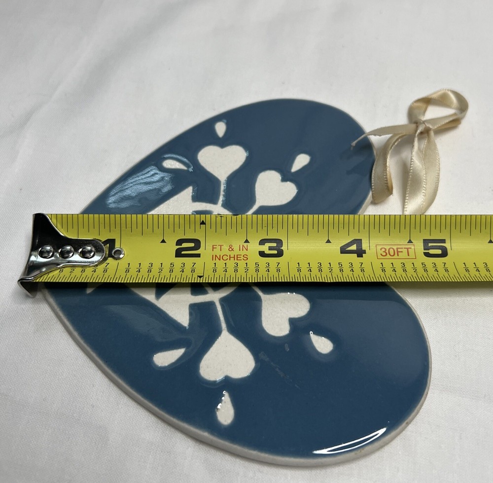 Studio Pottery Blue Heart Shaped Ornament Folk Art Pattern Glazed Tile Hanging. Condition is Used. Shipped with USPS Ground Advantage....