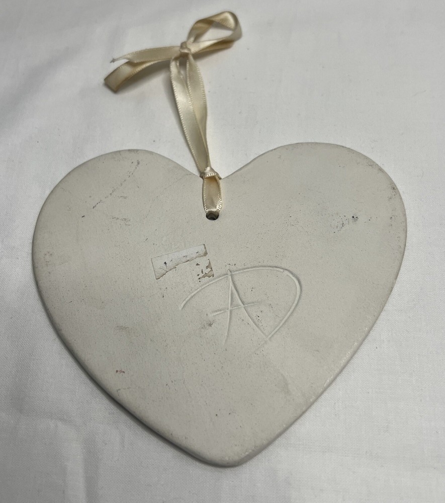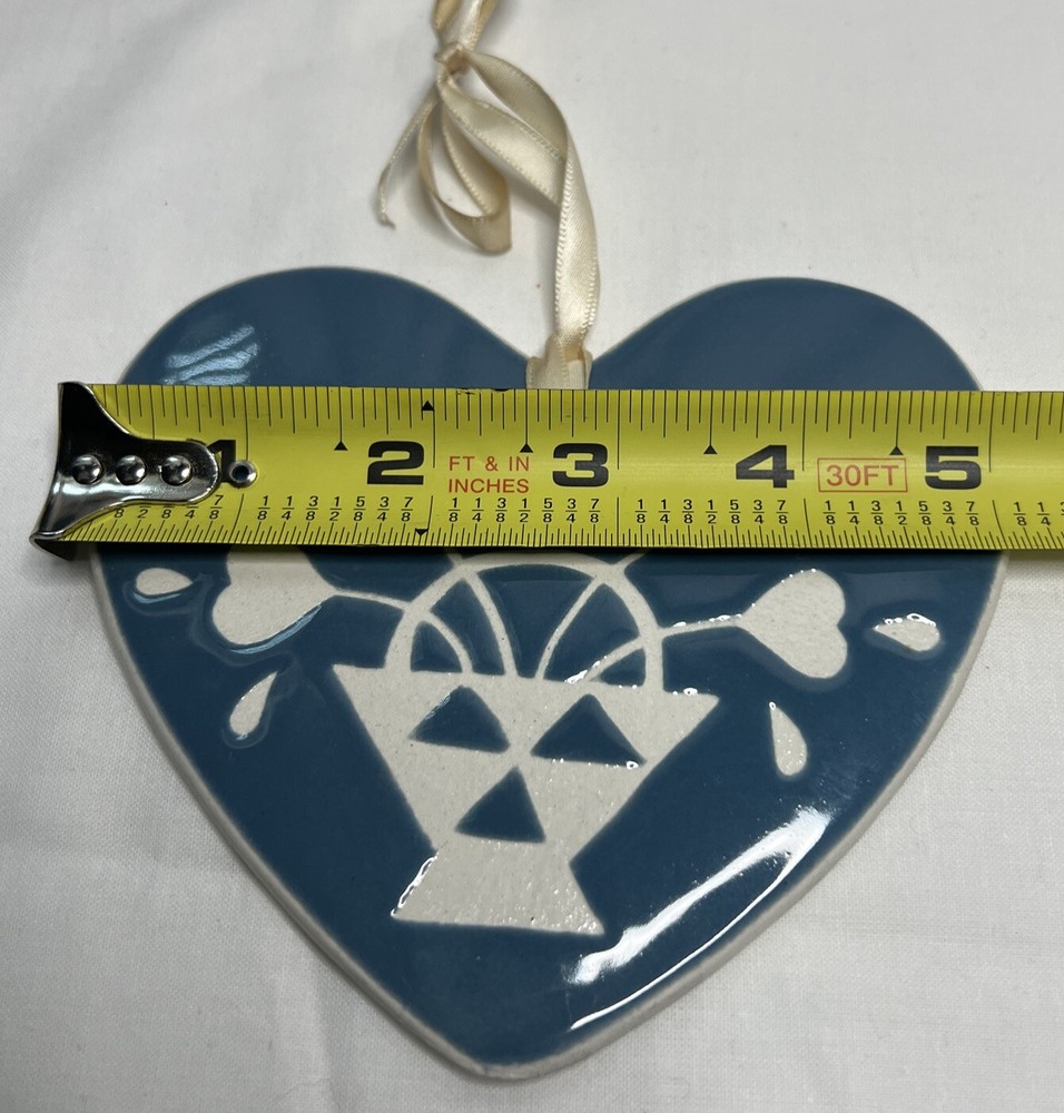 Studio Pottery Blue Heart Shaped Ornament Folk Art Pattern Glazed Tile Hanging. Condition is Used. Shipped with USPS Ground Advantage.