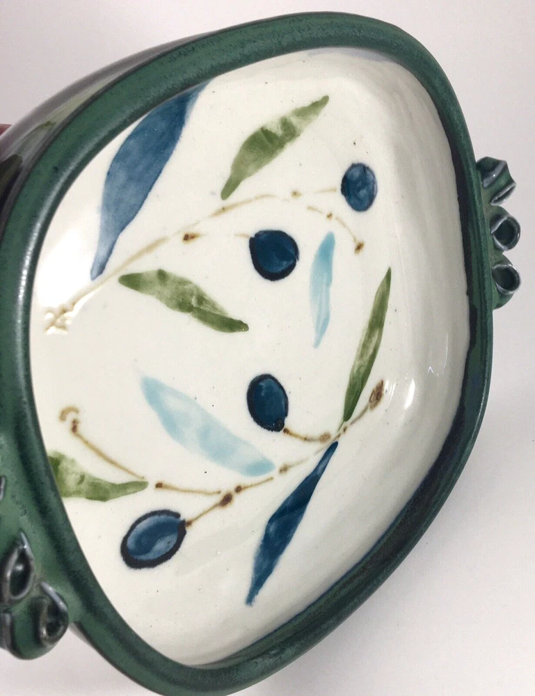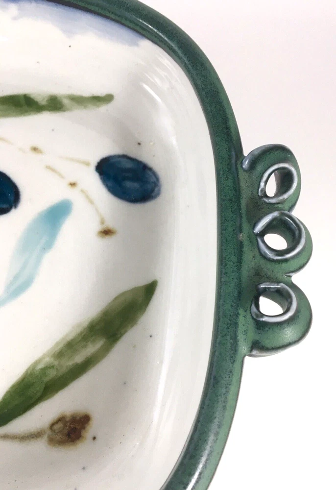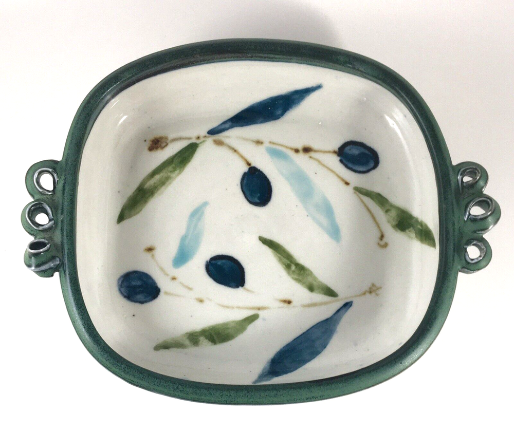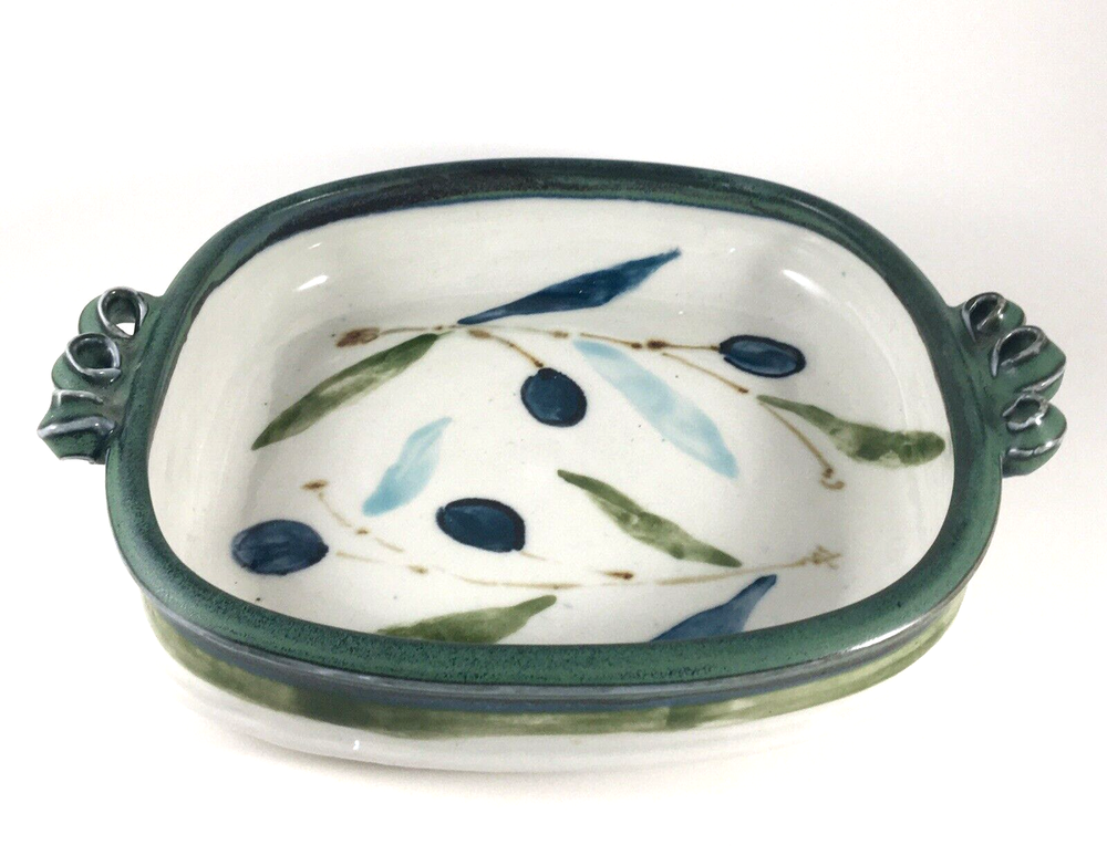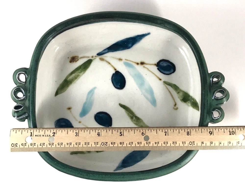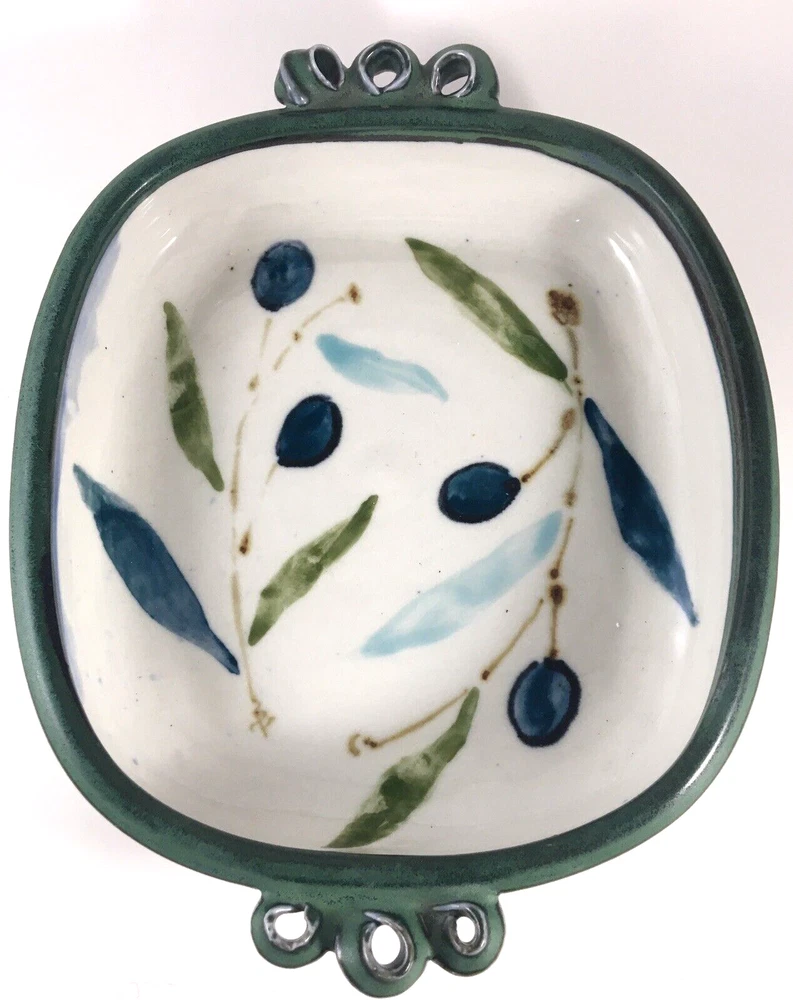 Studio Pottery 8" Square Casserole, Baking or Serving Dish, Olive Branch Pattern, 32oz, Signed, Mystery Artist This 8" square, handmade, studio pottery serving, casserole or baking dish has a beautiful blue and green olive branch design, 2 intricate, curled handles and 4 acrylic pads on the bottom. May be best used as a serving dish due to the pads on the bottom as the pads may not be ovenproof. Pad removal or oven use will be left to the winner's discretion. Incised on the unglazed bottom is what looks like "VY" or Vlick." Can't confirm. Unknown mystery artist. Date and o rigin unknown. Possibly vintage from Southwest, USA Probably hand formed slab pottery, porcelain or white clay. No signs of being wheel turned. Square shape with rounded corners; flared at rim and base; has 2 intricate handles; slightly concave base. Glossy, white glaze inside and out; colorful dark teal blue olives on brown branches with green and blue leaves in center; the outside edge is a glossy green; the rim and both handles are a matte green with black accents; the bottom is unglazed. The design is slightly incised and tactile, so the inside surface is not completely flat. Holds 32 ounces or 4 cups to the brim. Measures about 8" square and 1 3/4" high, is 2" high at the handles, and 10" wide handle to handle. Weighs 2 pound, 3 ounces before packaging. Very good condition with no chips, cracks, crazing or surface wear to note. Appears unused. Condition: See specifics above. Most of our items are estate finds and are in good to excellent used condition. Vintage, pre-owned items will not usually be in mint condition, but may show signs of age, use, or wear from being pre-owned and loved for many years. We try to describe any and all condition issues but may miss some. A defect not noted does not constitute an item "not as described." No Returns: Winner accepts item description/condition as stated, that all sales are final, and that items are sold "as found" and "as is," with no returns. Please note, we do our best to qualify, research, describe, and photograph all aspects of our listings, but we are not experts in this field. Be sure to check photos carefully and ask any questions before bidding to assure your satisfaction with the item/s. Shipping: Buyer pays actual USPS Priority shipping costs as per eBay's shipping calculator on the auction page. Priority includes free insurance and tracking. No handling fees. Shipping will be higher the further you are from our NV zip 89005. Fragile items are always extra-carefully packaged for shipping. Recycled shipping materials are often used as a way to help protect our environment. Payment: Your registered eBay address must match, or be updated to, your preferred shipping address. Buy-it-Now purchases require immediate payment. eBay may charge sales tax depending on your state's laws. For beautiful studio pottery, dinnerware, art glass, collectibles and more, be sure to see our eBay store, Pottery Prints and Porcelain. Thank you for looking!