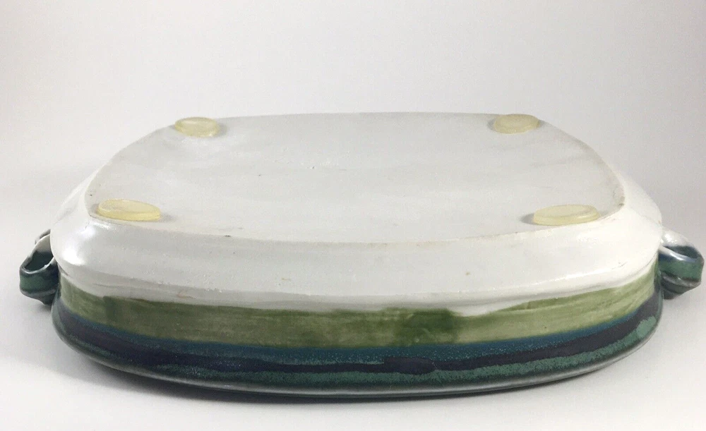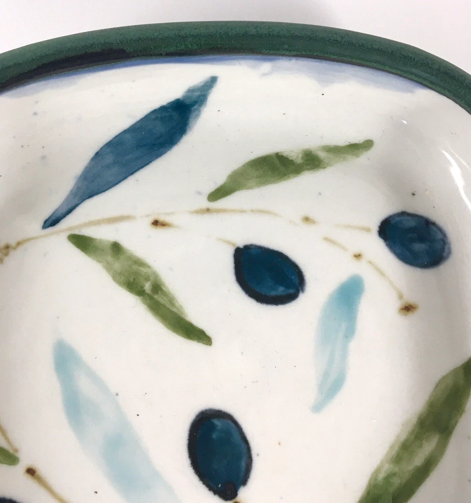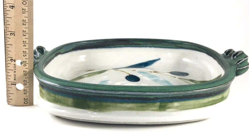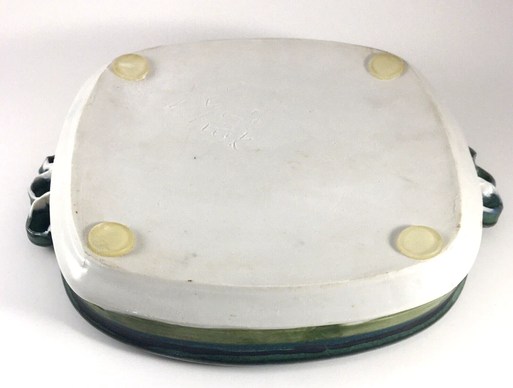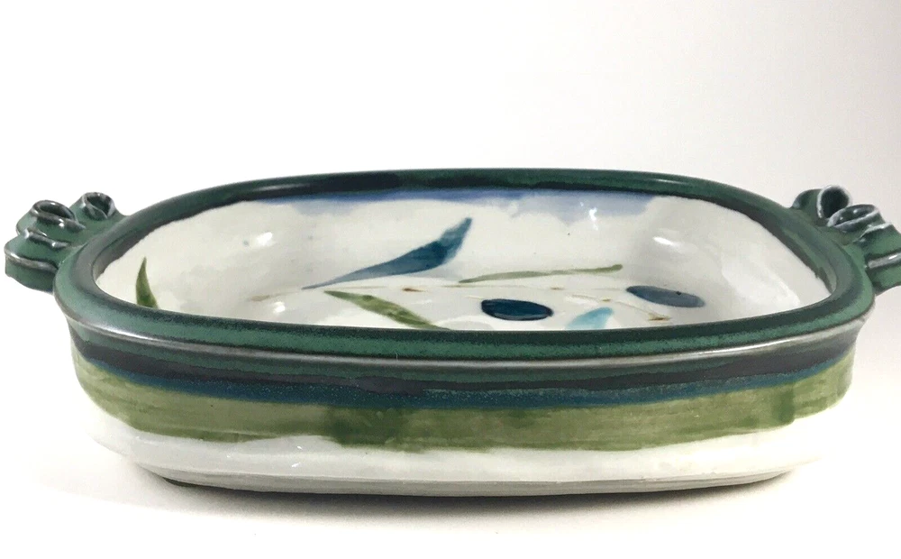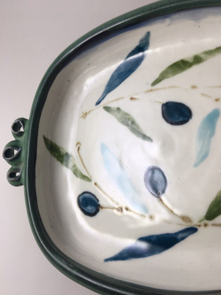 Studio Pottery 8" Square Casserole, Baking or Serving Dish, Olive Branch Pattern, 32oz, Signed, Mystery Artist This 8" square, handmade, studio pottery serving, casserole or baking dish has a beautiful blue and green olive branch design, 2 intricate, curled handles and 4 acrylic pads on the bottom. May be best used as a serving dish due to the pads on the bottom as the pads may not be ovenproof. Pad removal or oven use will be left to the winner's discretion. Incised on the unglazed bottom is what looks like "VY" or Vlick." Can't confirm. Unknown mystery artist. Date and o rigin unknown. Possibly vintage from Southwest, USA Probably hand formed slab pottery, porcelain or white clay. No signs of being wheel turned. Square shape with rounded corners; flared at rim and base; has 2 intricate handles; slightly concave base. Glossy, white glaze inside and out; colorful dark teal blue olives on brown branches with green and blue leaves in center; the outside edge is a glossy green; the rim and both handles are a matte green with black accents; the bottom is unglazed. The design is slightly incised and tactile, so the inside surface is not completely flat. Holds 32 ounces or 4 cups to the brim. Measures about 8" square and 1 3/4" high, is 2" high at the handles, and 10" wide handle to handle. Weighs 2 pound, 3 ounces before packaging. Very good condition with no chips, cracks, crazing or surface wear to note. Appears unused. Condition: See specifics above. Most of our items are estate finds and are in good to excellent used condition. Vintage, pre-owned items will not usually be in mint condition, but may show signs of age, use, or wear from being pre-owned and loved for many years. We try to describe any and all condition issues but may miss some. A defect not noted does not constitute an item "not as described." No Returns: Winner accepts item description/condition as stated, that all sales are final, and that items are sold "as found" and "as is," with no returns. Please note, we do our best to qualify, research, describe, and photograph all aspects of our listings, but we are not experts in this field. Be sure to check photos carefully and ask any questions before bidding to assure your satisfaction with the item/s. Shipping: Buyer pays actual USPS Priority shipping costs as per eBay's shipping calculator on the auction page. Priority includes free insurance and tracking. No handling fees. Shipping will be higher the further you are from our NV zip 89005. Fragile items are always extra-carefully packaged for shipping. Recycled shipping materials are often used as a way to help protect our environment. Payment: Your registered eBay address must match, or be updated to, your preferred shipping address. Buy-it-Now purchases require immediate payment. eBay may charge sales tax depending on your state's laws. For beautiful studio pottery, dinnerware, art glass, collectibles and more, be sure to see our eBay store, Pottery Prints and Porcelain. Thank you for looking!