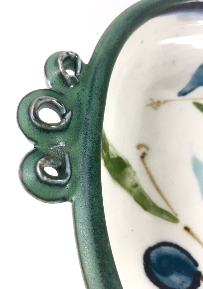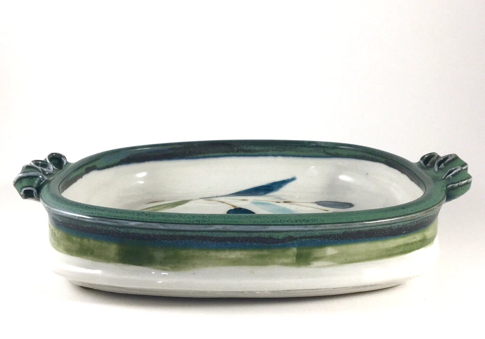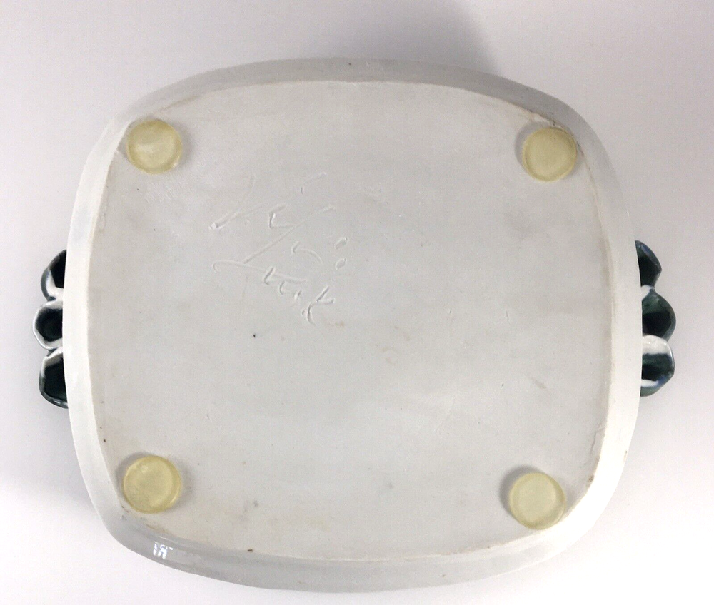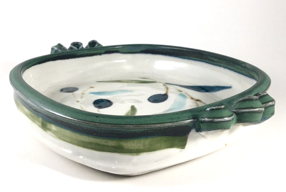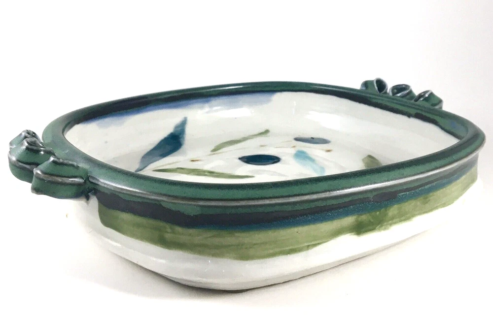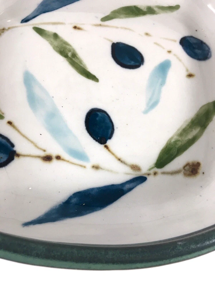 Studio Pottery 8" Square Casserole, Baking or Serving Dish, Olive Branch Pattern, 32oz, Signed, Mystery Artist This 8" square, handmade, studio pottery serving, casserole or baking dish has a beautiful blue and green olive branch design, 2 intricate, curled handles and 4 acrylic pads on the bottom. May be best used as a serving dish due to the pads on the bottom as the pads may not be ovenproof. Pad removal or oven use will be left to the winner's discretion. Incised on the unglazed bottom is what looks like "VY" or Vlick." Can't confirm. Unknown mystery artist. Date and o rigin unknown. Possibly vintage from Southwest, USA Probably hand formed slab pottery, porcelain or white clay. No signs of being wheel turned. Square shape with rounded corners; flared at rim and base; has 2 intricate handles; slightly concave base. Glossy, white glaze inside and out; colorful dark teal blue olives on brown branches with green and blue leaves in center; the outside edge is a glossy green; the rim and both handles are a matte green with black accents; the bottom is unglazed. The design is slightly incised and tactile, so the inside surface is not completely flat. Holds 32 ounces or 4 cups to the brim. Measures about 8" square and 1 3/4" high, is 2" high at the handles, and 10" wide handle to handle. Weighs 2 pound, 3 ounces before packaging. Very good condition with no chips, cracks, crazing or surface wear to note. Appears unused. Condition: See specifics above. Most of our items are estate finds and are in good to excellent used condition. Vintage, pre-owned items will not usually be in mint condition, but may show signs of age, use, or wear from being pre-owned and loved for many years. We try to describe any and all condition issues but may miss some. A defect not noted does not constitute an item "not as described." No Returns: Winner accepts item description/condition as stated, that all sales are final, and that items are sold "as found" and "as is," with no returns. Please note, we do our best to qualify, research, describe, and photograph all aspects of our listings, but we are not experts in this field. Be sure to check photos carefully and ask any questions before bidding to assure your satisfaction with the item/s. Shipping: Buyer pays actual USPS Priority shipping costs as per eBay's shipping calculator on the auction page. Priority includes free insurance and tracking. No handling fees. Shipping will be higher the further you are from our NV zip 89005. Fragile items are always extra-carefully packaged for shipping. Recycled shipping materials are often used as a way to help protect our environment. Payment: Your registered eBay address must match, or be updated to, your preferred shipping address. Buy-it-Now purchases require immediate payment. eBay may charge sales tax depending on your state's laws. For beautiful studio pottery, dinnerware, art glass, collectibles and more, be sure to see our eBay store, Pottery Prints and Porcelain. Thank you for looking!