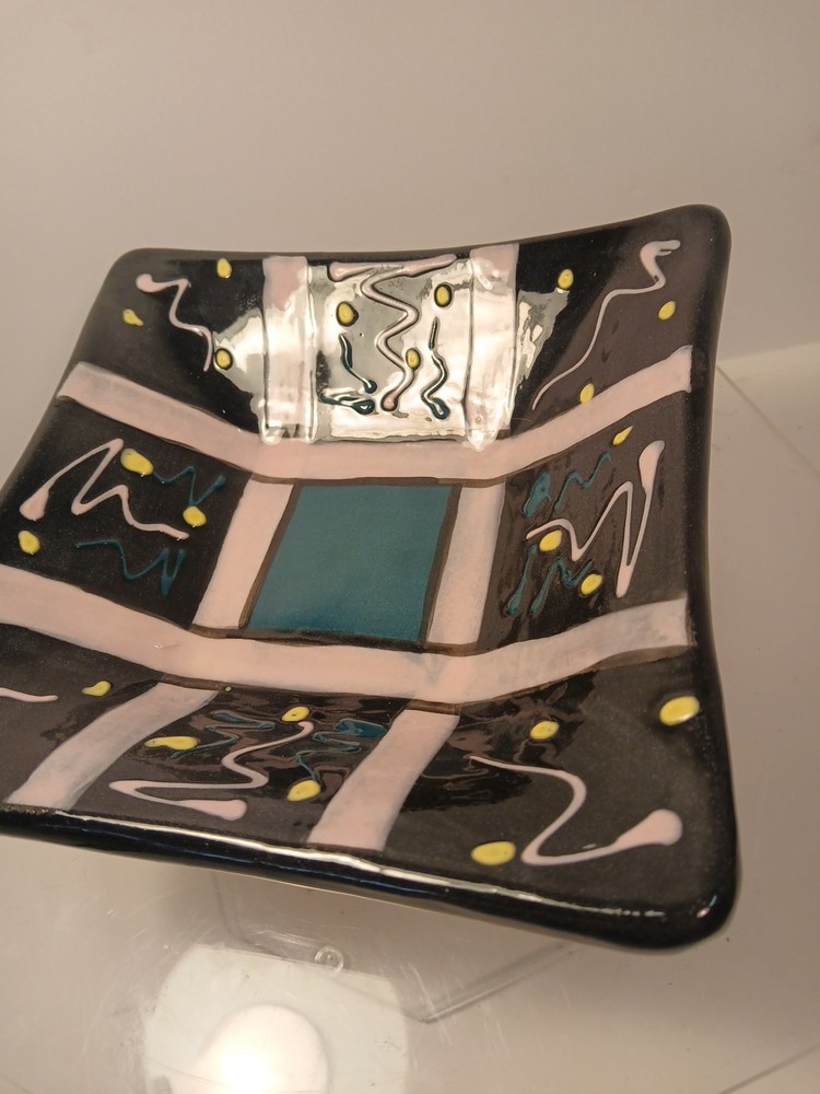 This is a studio handmade ceramic square bowl/dish. Artist signed , features a multicolor design and measures approximately 7" Square. 2 " H excellent condition....