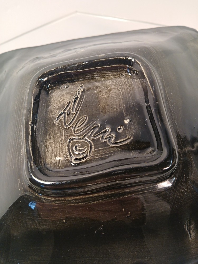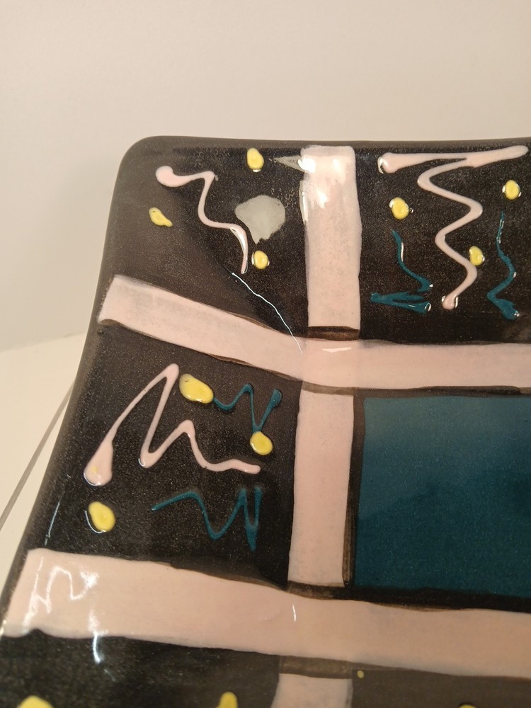 This is a studio handmade ceramic square bowl/dish. Artist signed , features a multicolor design and measures approximately 7" Square. 2 " H excellent condition.