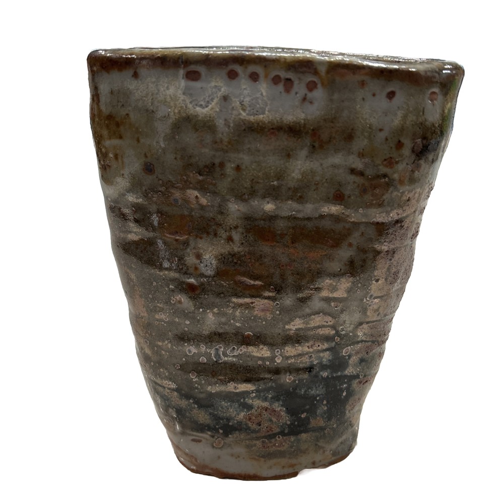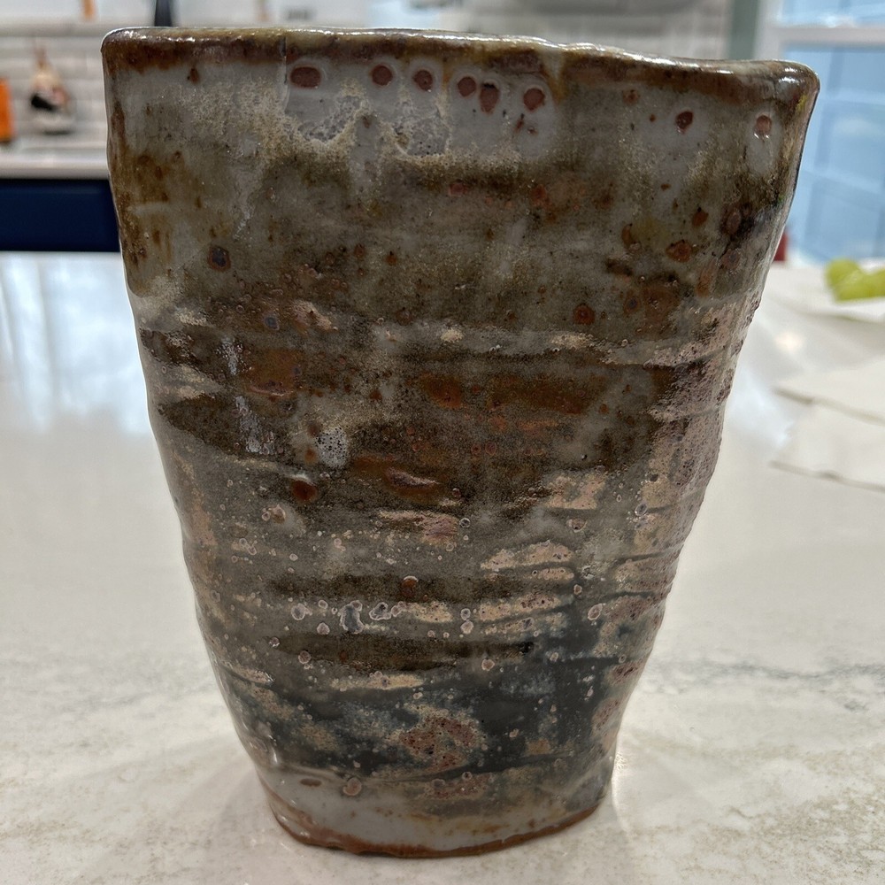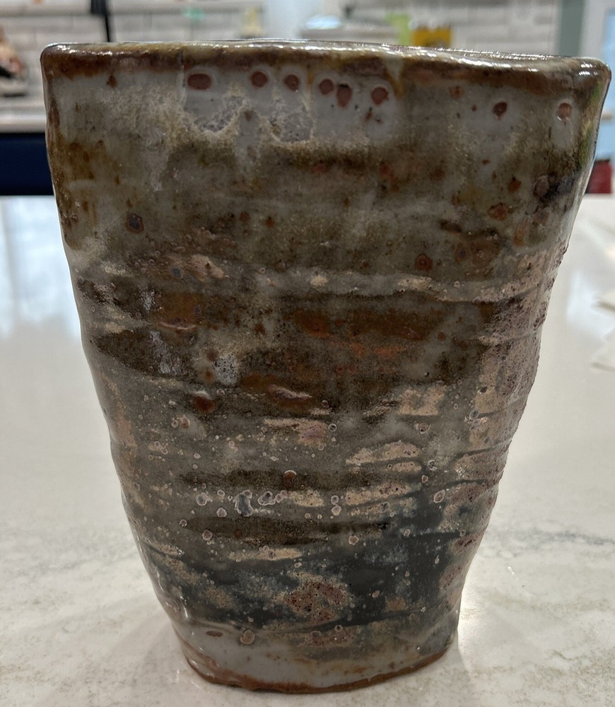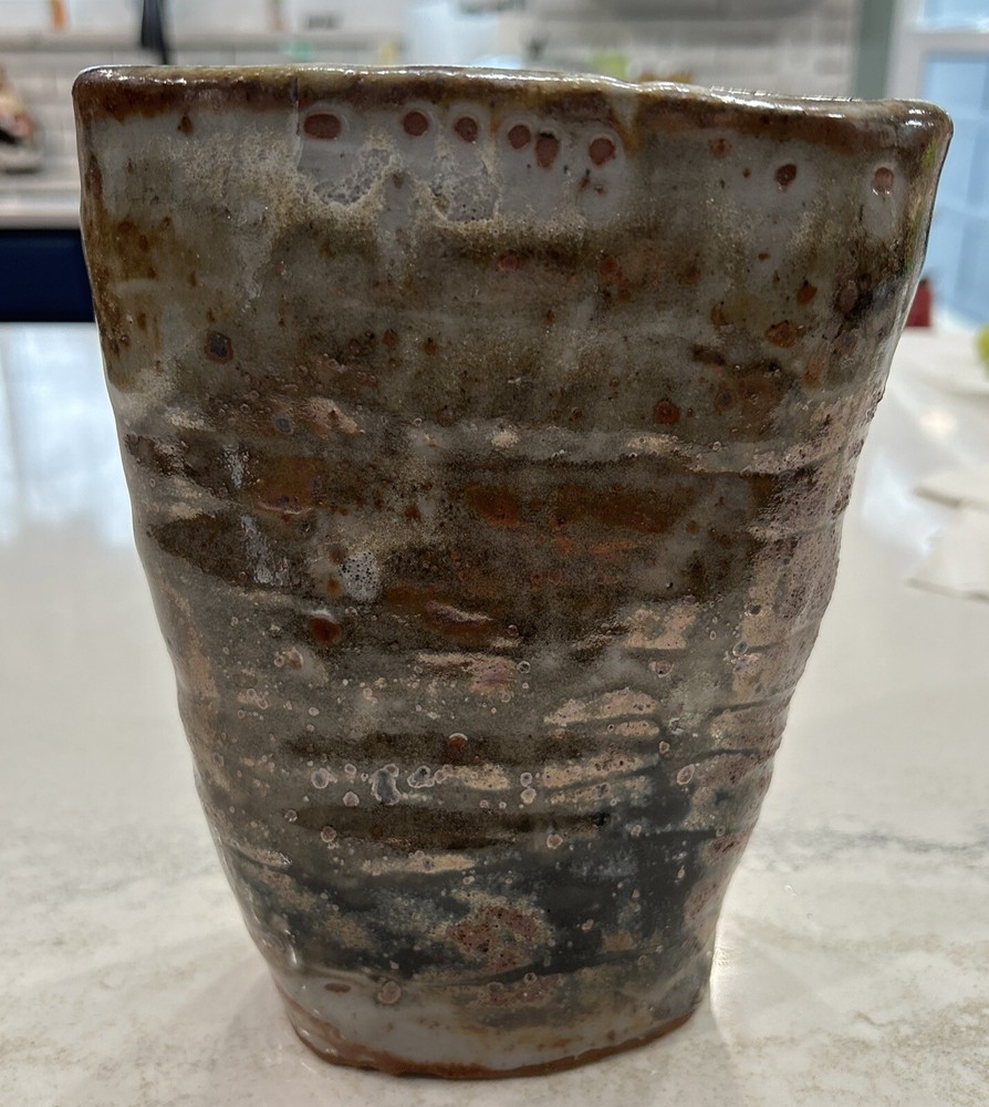 This beautiful elliptical shaped handmade vase is a unique addition to any collection. The glazed stoneware is neutral in color and features intricate pottery work that showcases the artist's skill. The signature adds to the authenticity of the piece. Perfect for displaying flowers or as a standalone decorative item, this pottery vase is a must-have for pottery enthusiasts or anyone looking for a one-of-a-kind piece. Chip on bottom towards signage. Does not affect appearance.