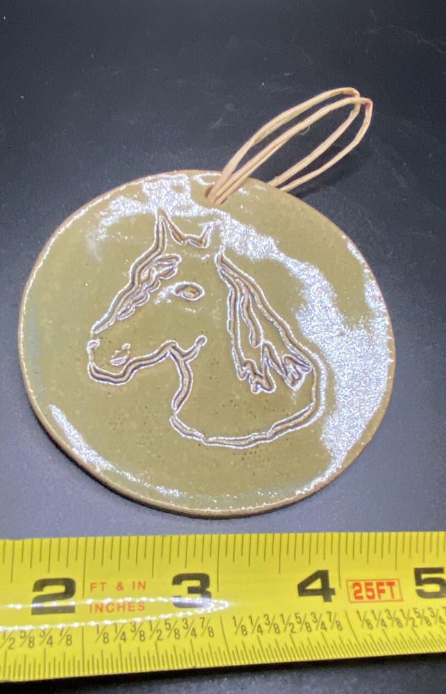 Studio Pottery Flat Round Disk Shaped Horse head ornament Condition is "Used". Shipped with USPS Priority Mail....