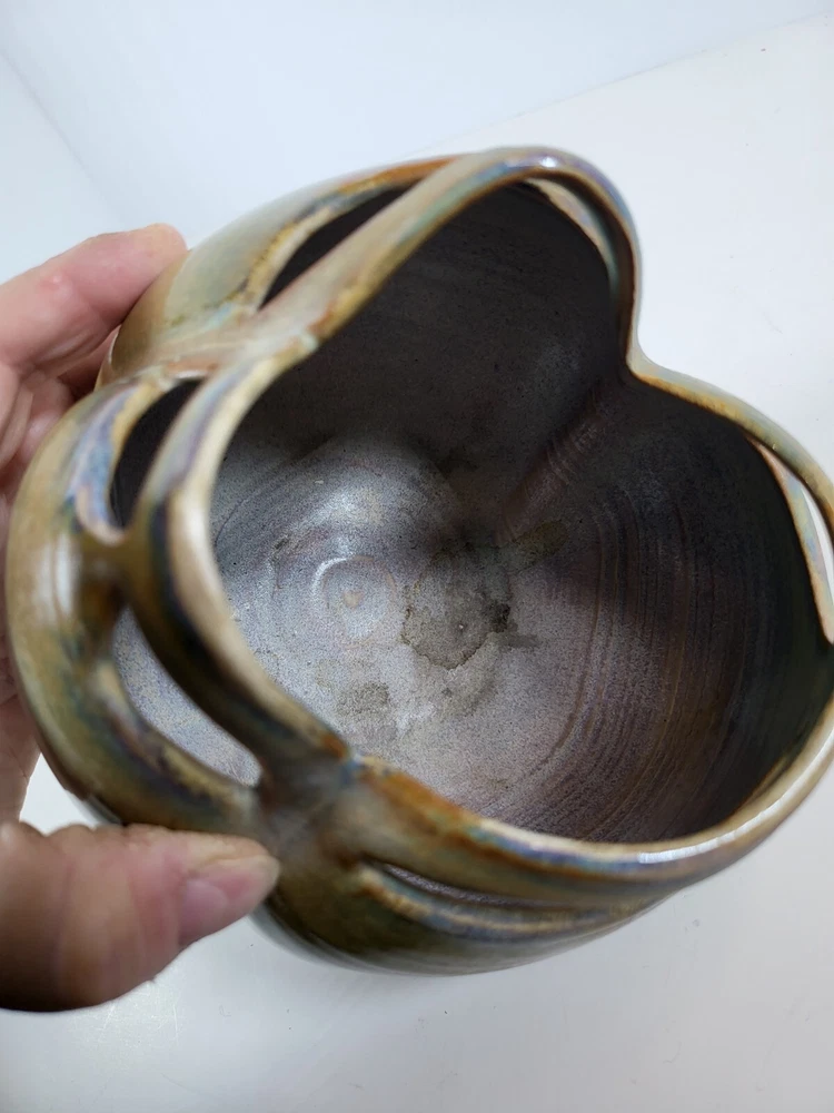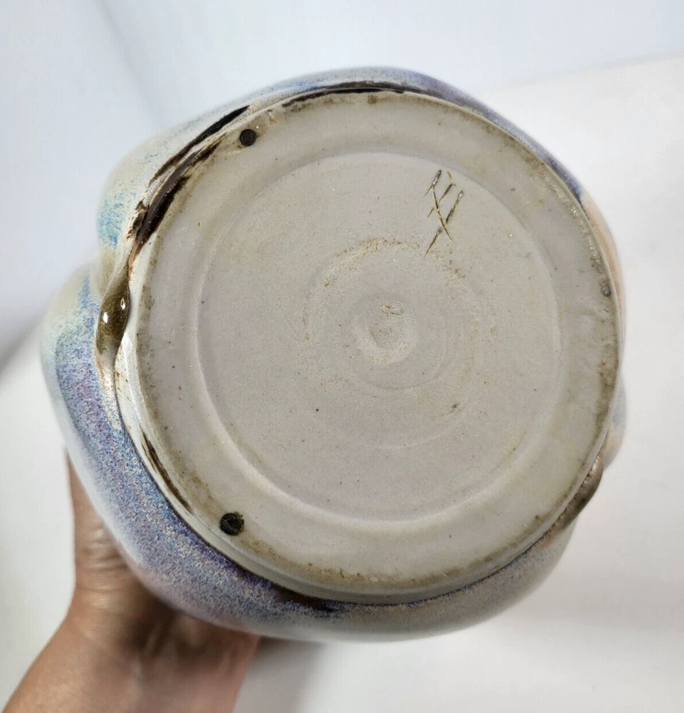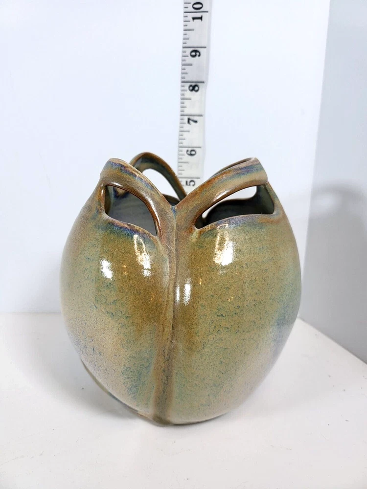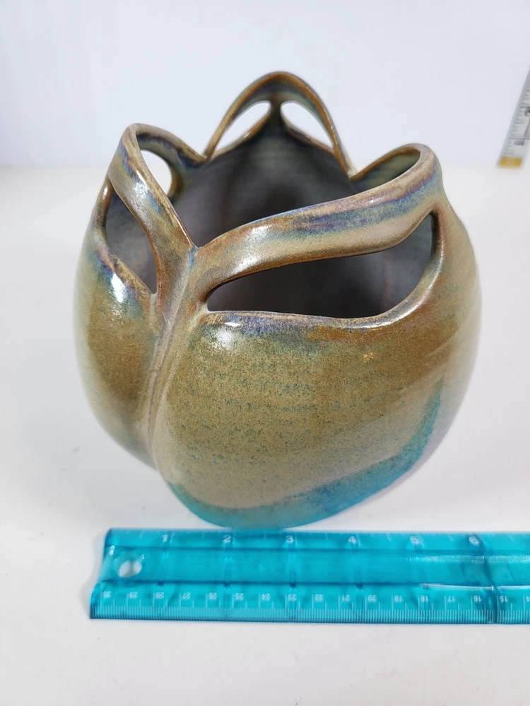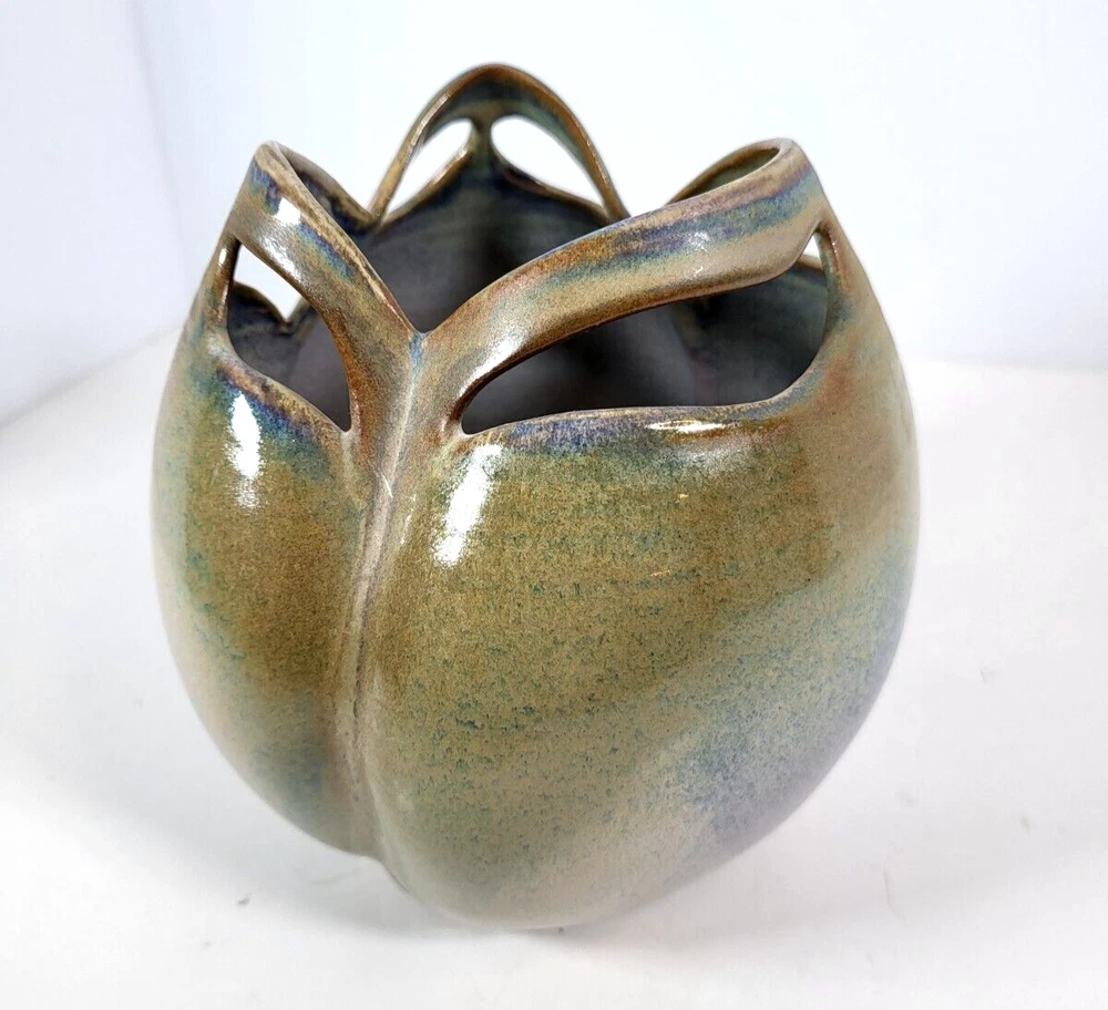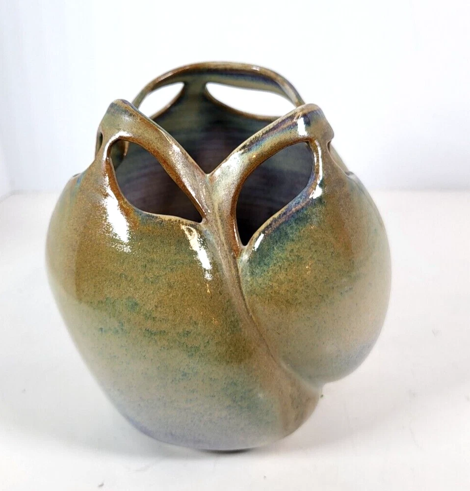 Studio Pottery Floral Flower Shaped Vase Cut Out Design Signed Browns Blues Gold...