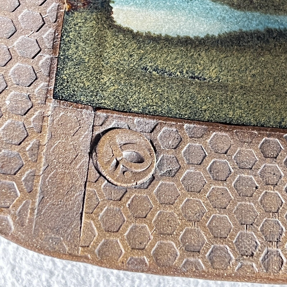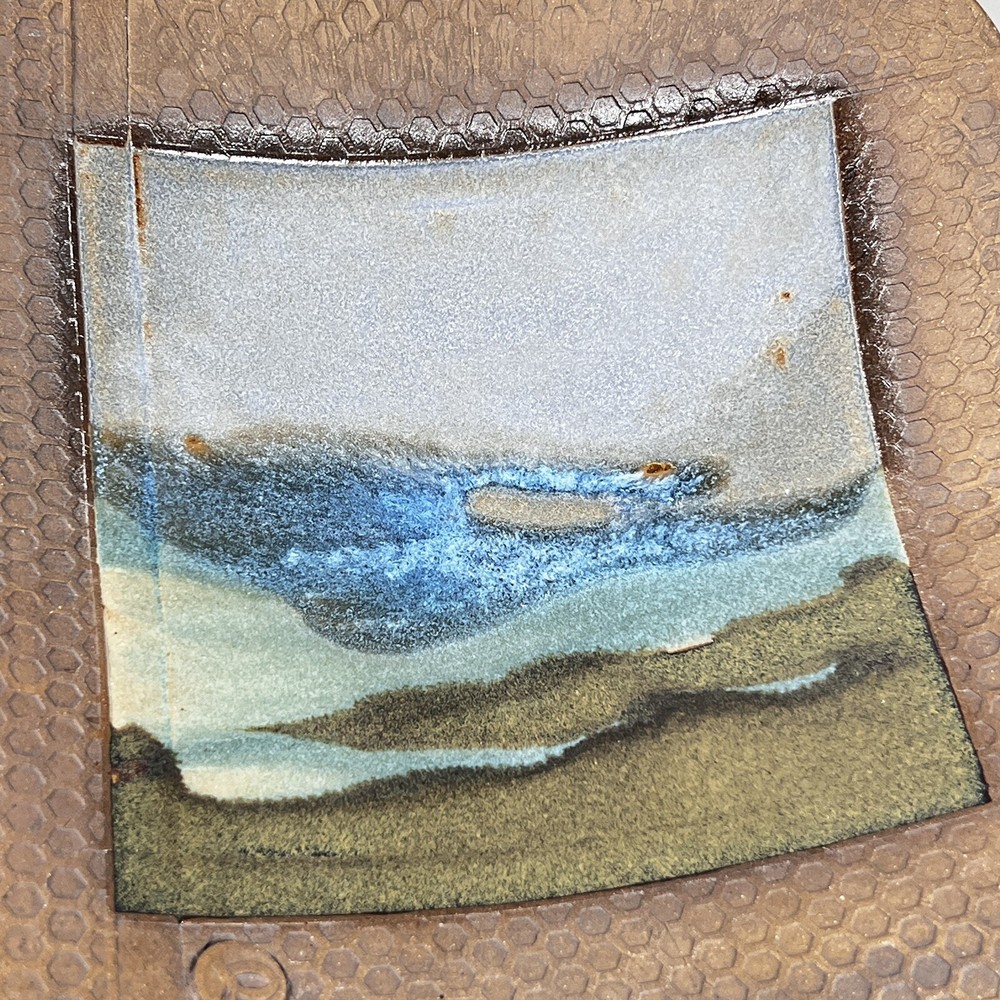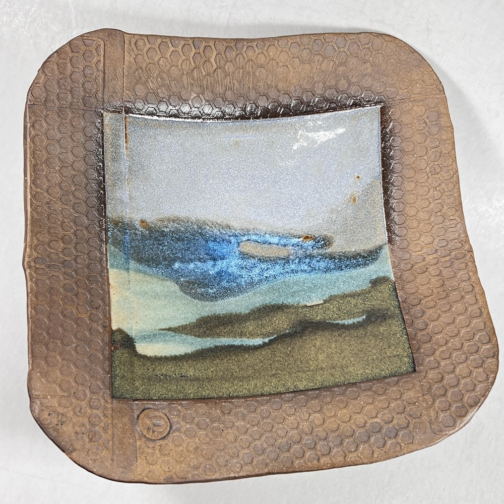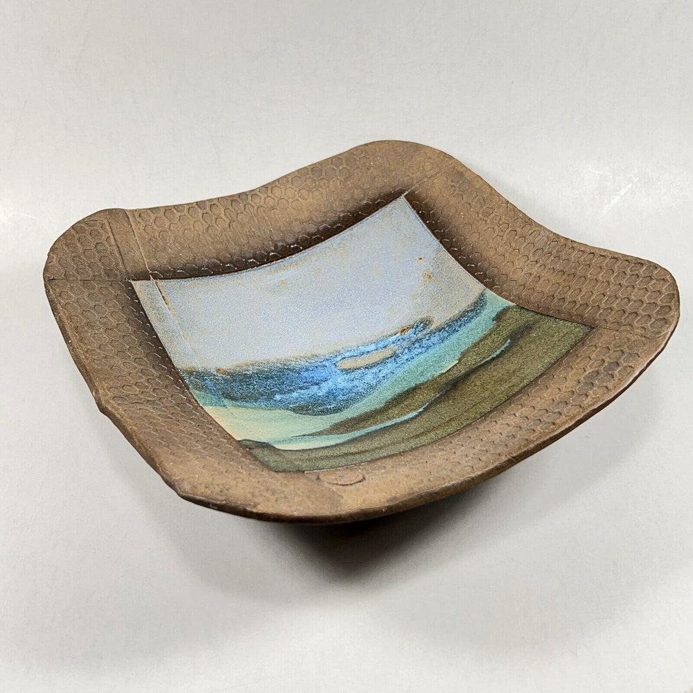 Studio art pottery footed console bowl, handmade by a local potter in Fort Collins or Loveland Colorado. Square shaped with the corners pointing up. The outer edge is unglazed and stamped with a honeycomb design. The interior is glazed and looks to me like a landscape of the mountains and the sky. Measures about 10" across and 3" tall. Condition: I found no chips, cracks, or other damage. Beautiful piece! See photos. Shipping: Your choice in shipping - USPS, FedEx, UPS. Please click on the shipping details tab above for rates. You can choose your preferred shipping at checkout. I will happily combine shipping on multiple listings when possible. Other notes: Please remember that due to the differences in monitors, colors may vary. If you have questions, please contact me. Please visit my store to see all my other items! Studio Pottery Footed Console Bowl Mountain Glaze Colorado Art Pottery
