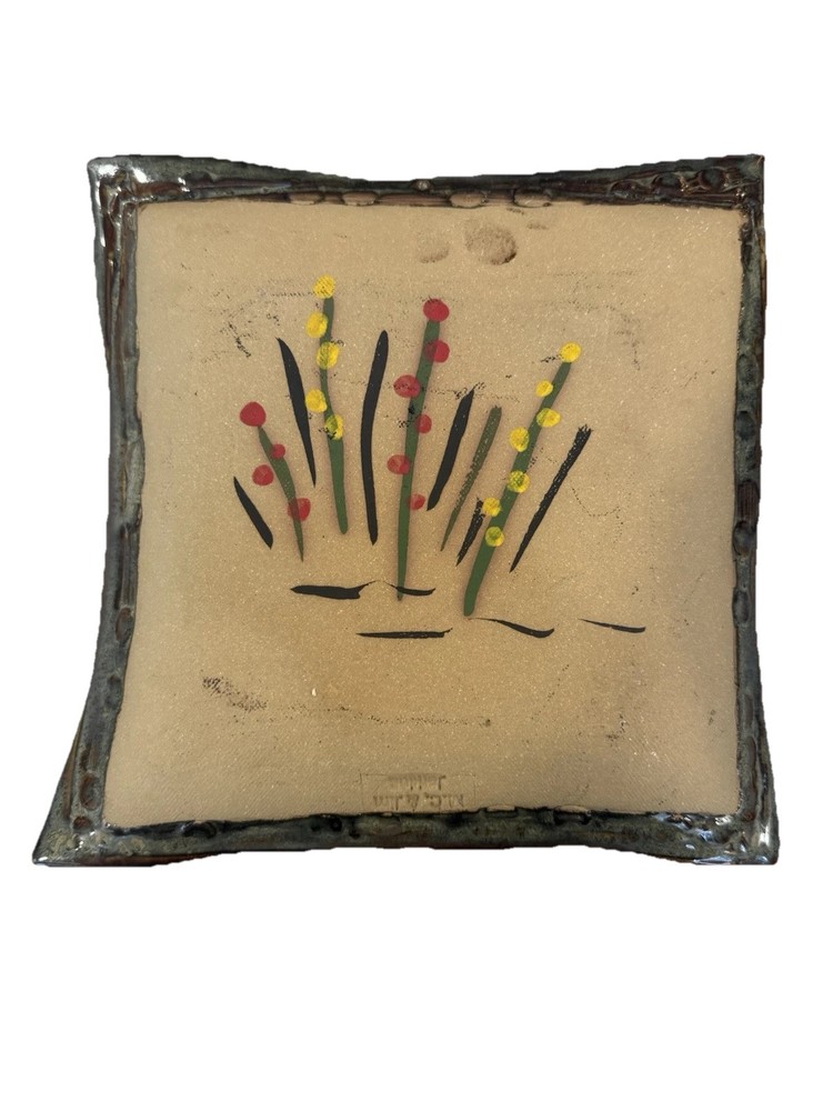 This is a handmade 9” square decorative plate created by M C & Jim Jerkins in the United States, featuring a multi-color glaze on pottery. The plate is designed in an art pottery style, showcasing the unique production technique of pottery. Perfect for display or serving, this piece adds a touch of artisanal charm to any space with its one-of-a-kind design.