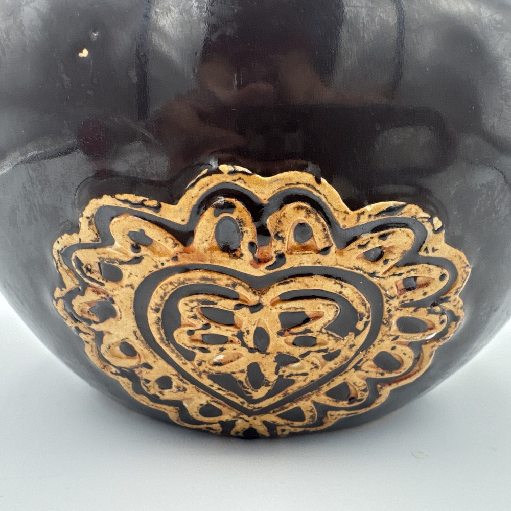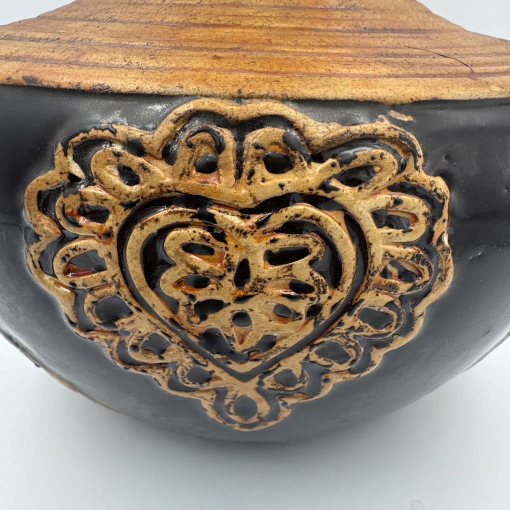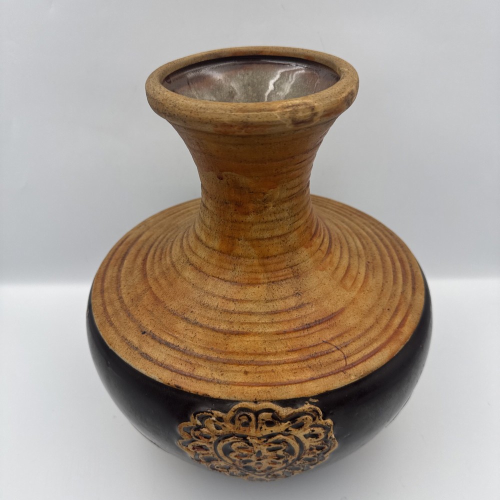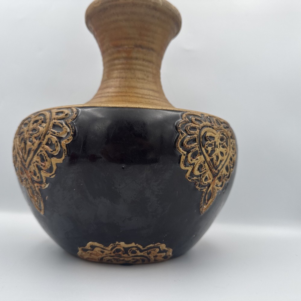 This is a studio pottery vase that is shaped like a decorative and functional piece. It is made using traditional pottery techniques and has a mid-century modern design. The vase is unmarked but is likely handmade. It is suitable for displaying flowers or as a standalone decorative item.