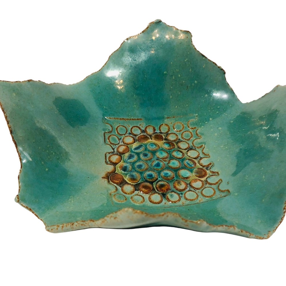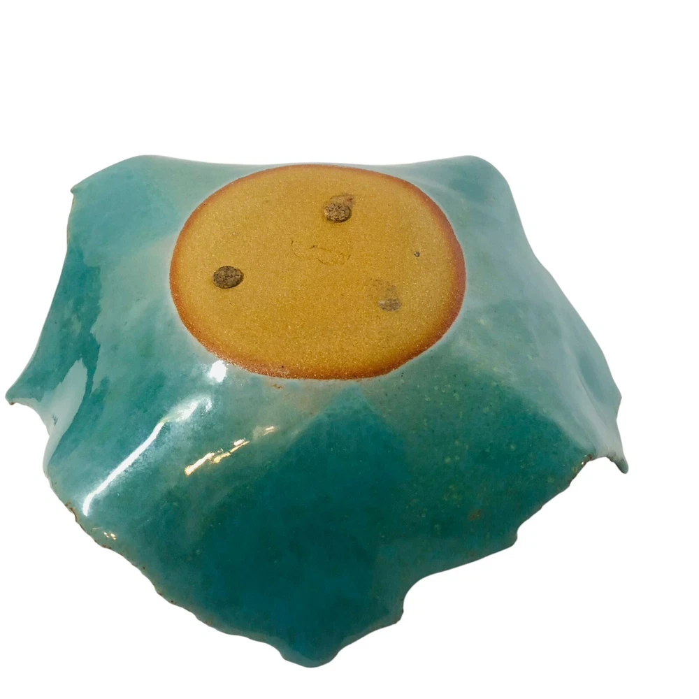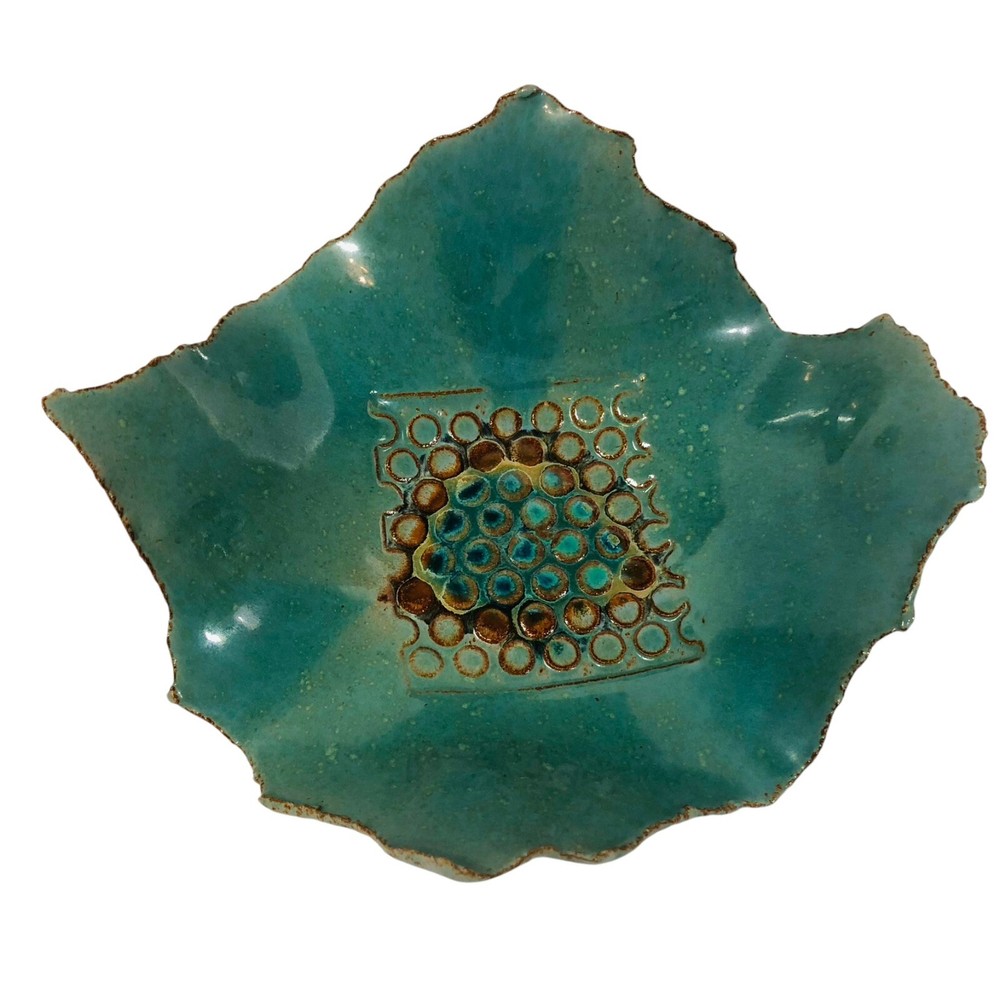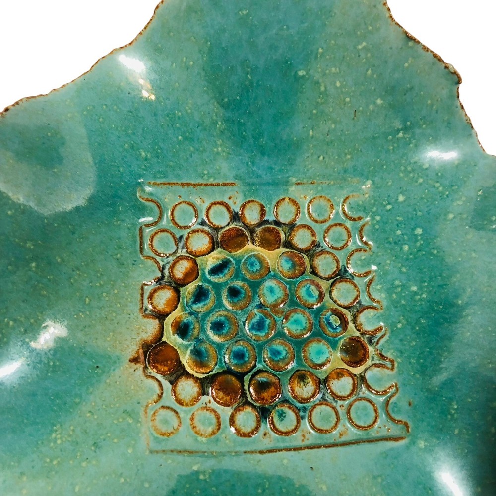 Studio Pottery - Marked - Green Brown Square Bowl with Circle Design in Center with Rough Edges Bottom marking - Design appears to be 2 rainbow shapes overlapping or a really short and thick "M" Dimensions - Length - 10" Width - 9" Height 3.5" Preowned - in Good used condition. No chips or cracks found. Please review photos as they are part of the description.