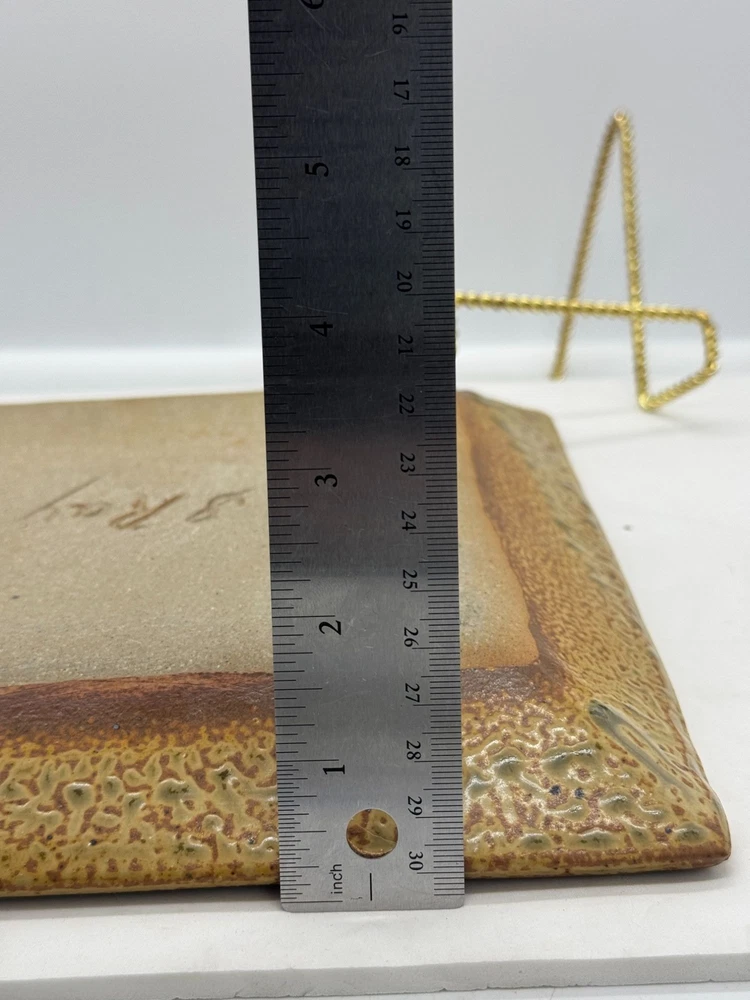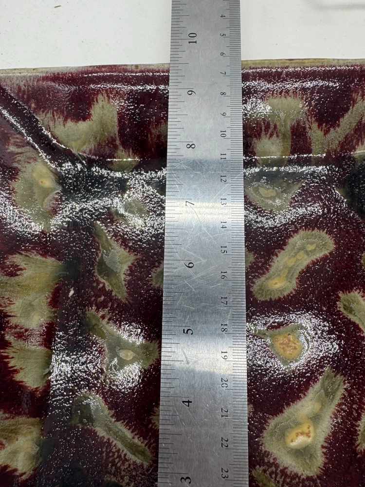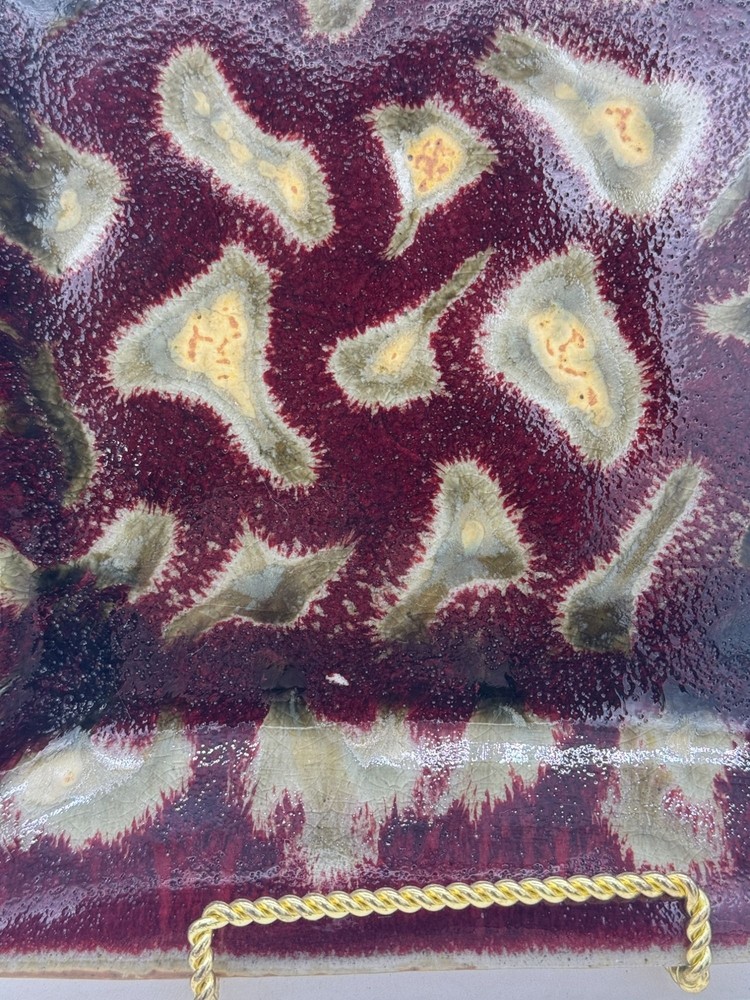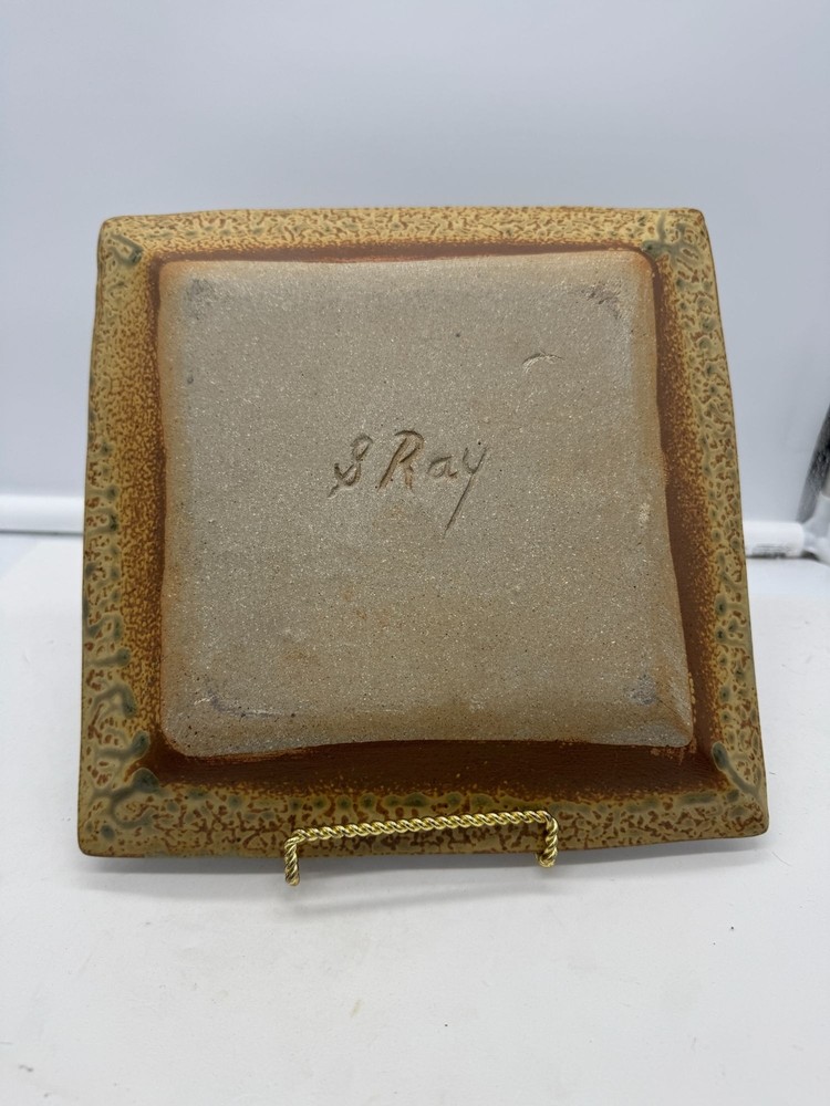 Studio Pottery Square Plate Platter Serving Tray Signed S Ray Interesting pattern, deep maroon or oxblood red glaze with green and yellow accents. Measures 9 1/2 inches square. Heavy, quality piece signed on the back. No chips, one small spot that was a glaze skip.