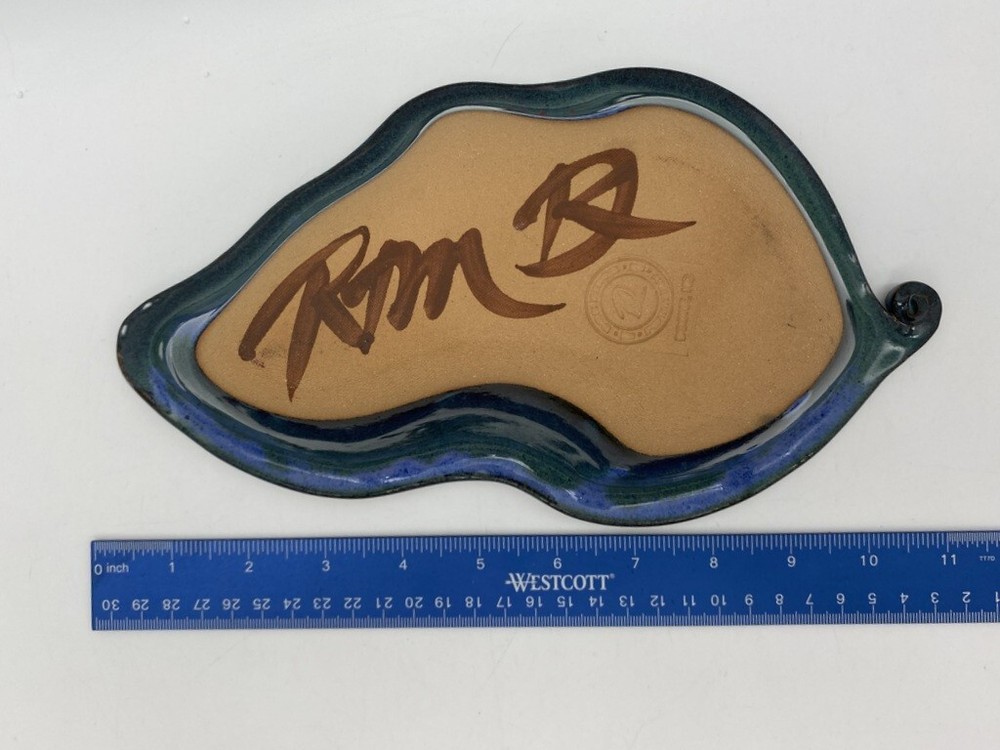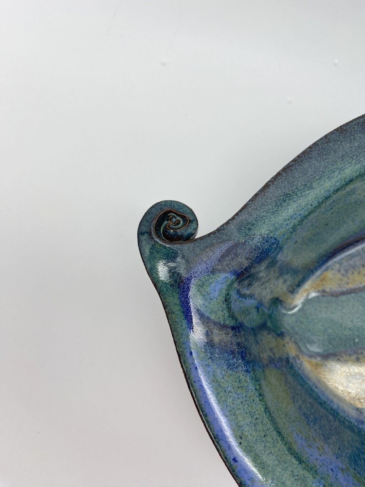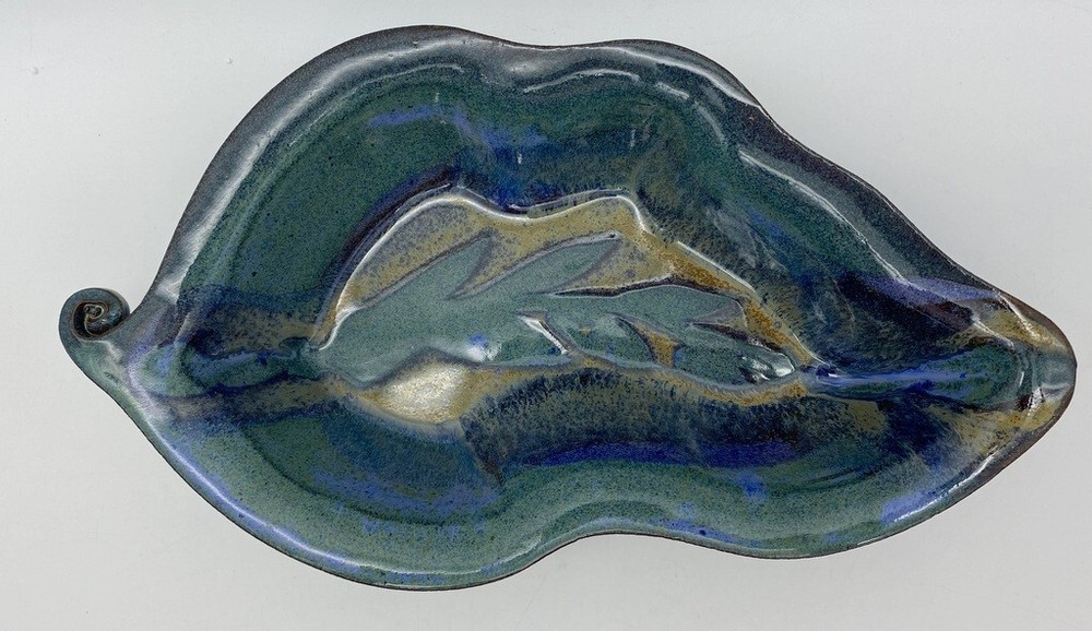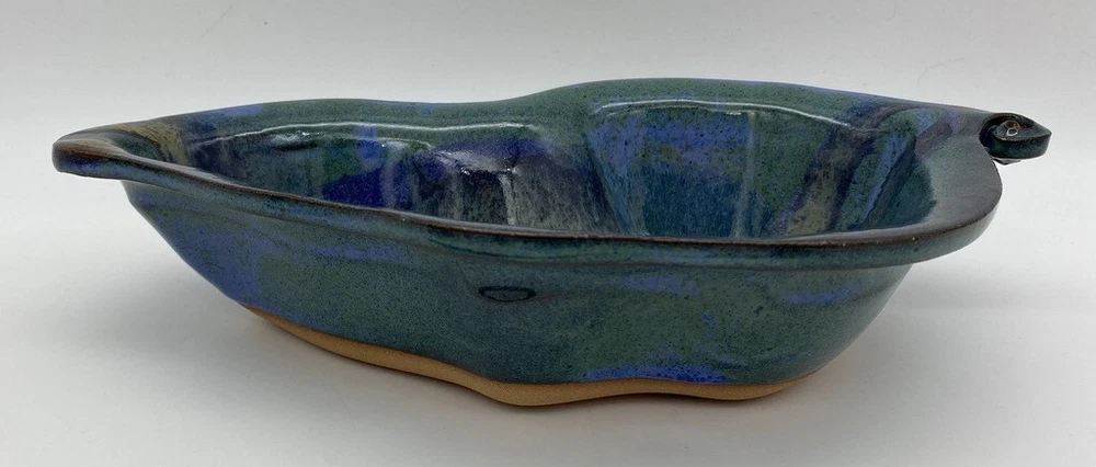 Beautiful drip glaze Detailed handles Center Painted design 10 1/2" long and 6" wide and 2" high Great Artist Piece impressed potters mark Box 96...