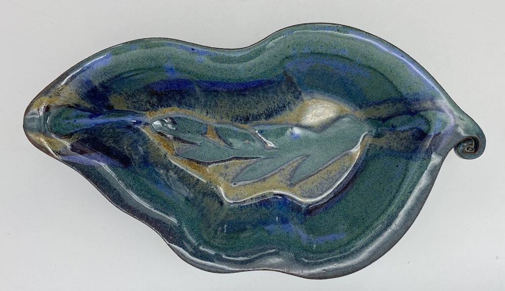 Beautiful drip glaze Detailed handles Center Painted design 10 1/2" long and 6" wide and 2" high Great Artist Piece impressed potters mark Box 96