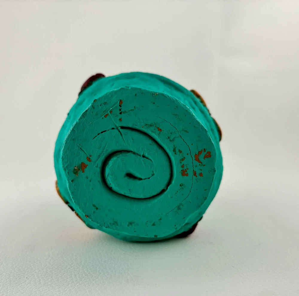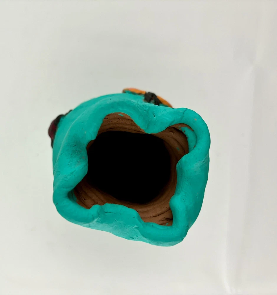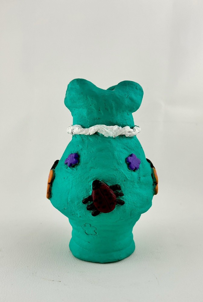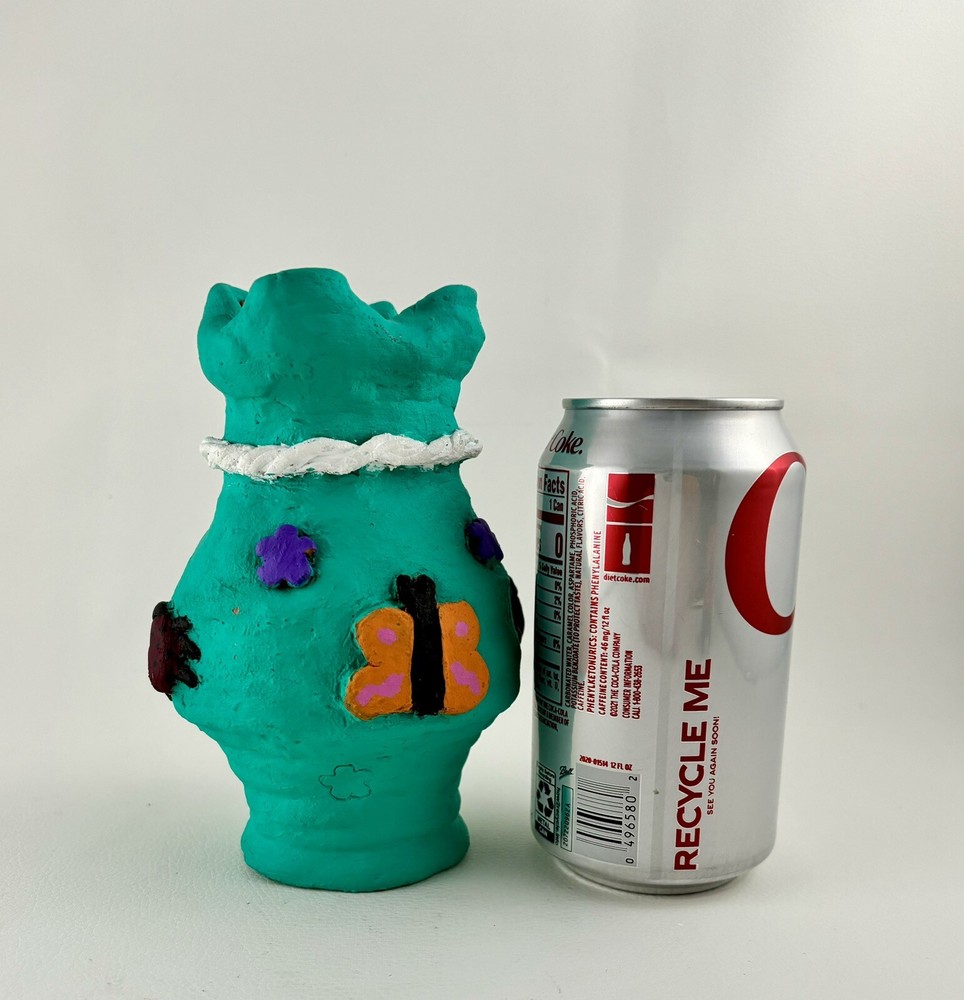 This bright fun studio vase is 6” tall and has butterflies, ladybugs, and purple flowers applied over a bright teal background and will brighten any area. Perfect for child’s room, play area, or schoolroom.
