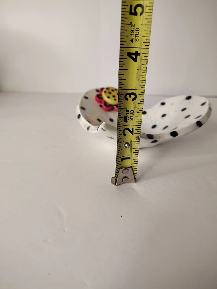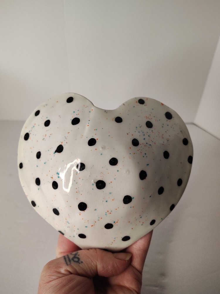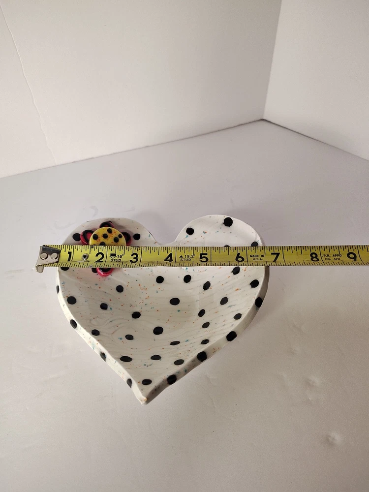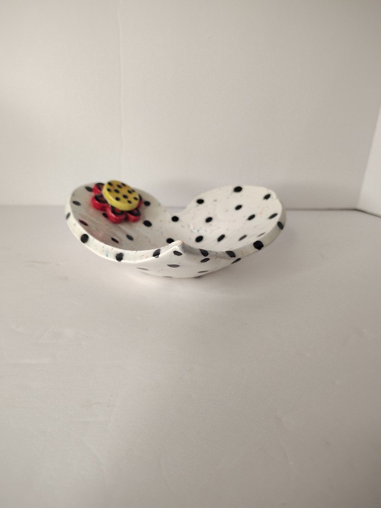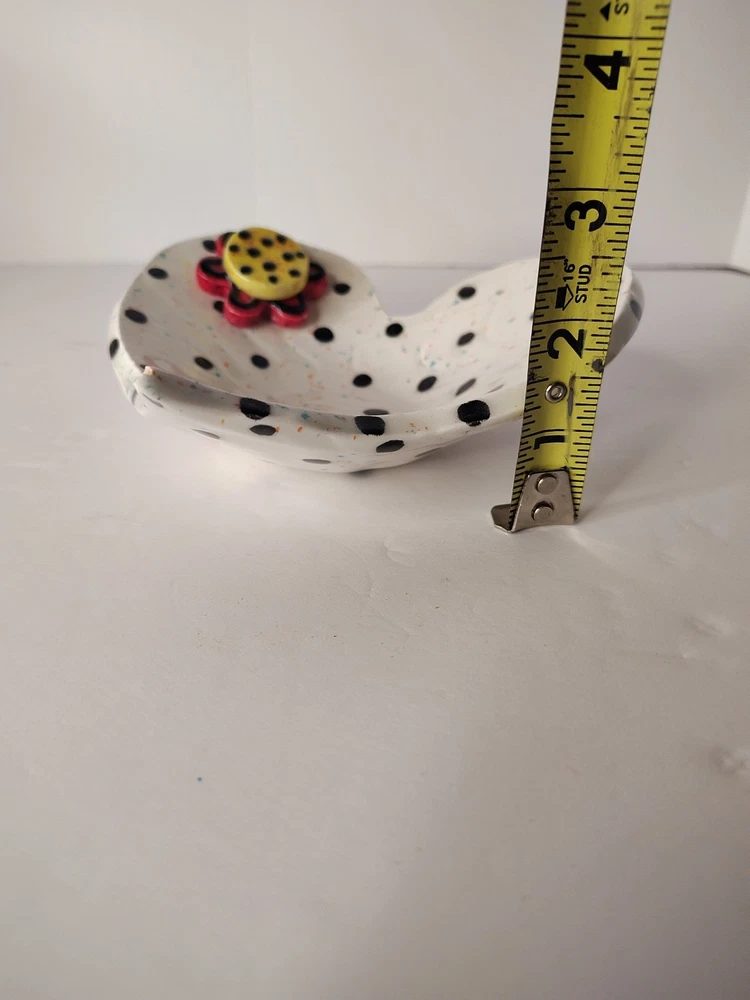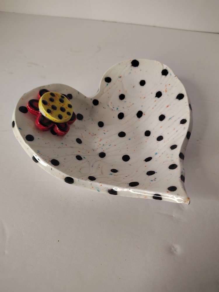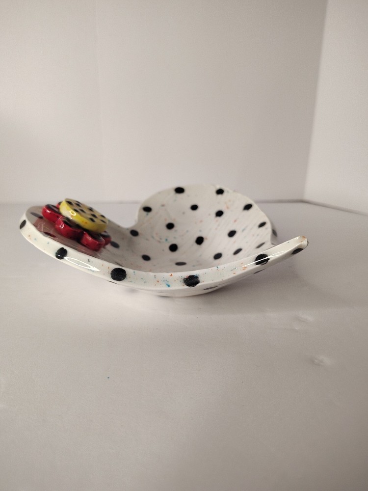 Studio PotteryPolka Dotted Heart-shaped Ceramic Trinket Dish With Applied Flower. Condition is Used. Shipped with USPS Ground Advantage....