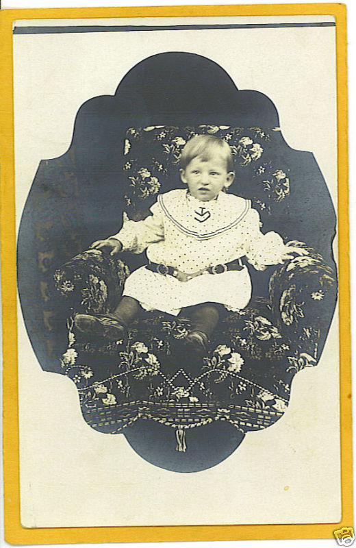 Real Photo Postcard RPPC - Baby in beautiful printed chair. Shaped border. Corner bumps, otherwise excellent condition. Postally unused. Cyko stampbox.