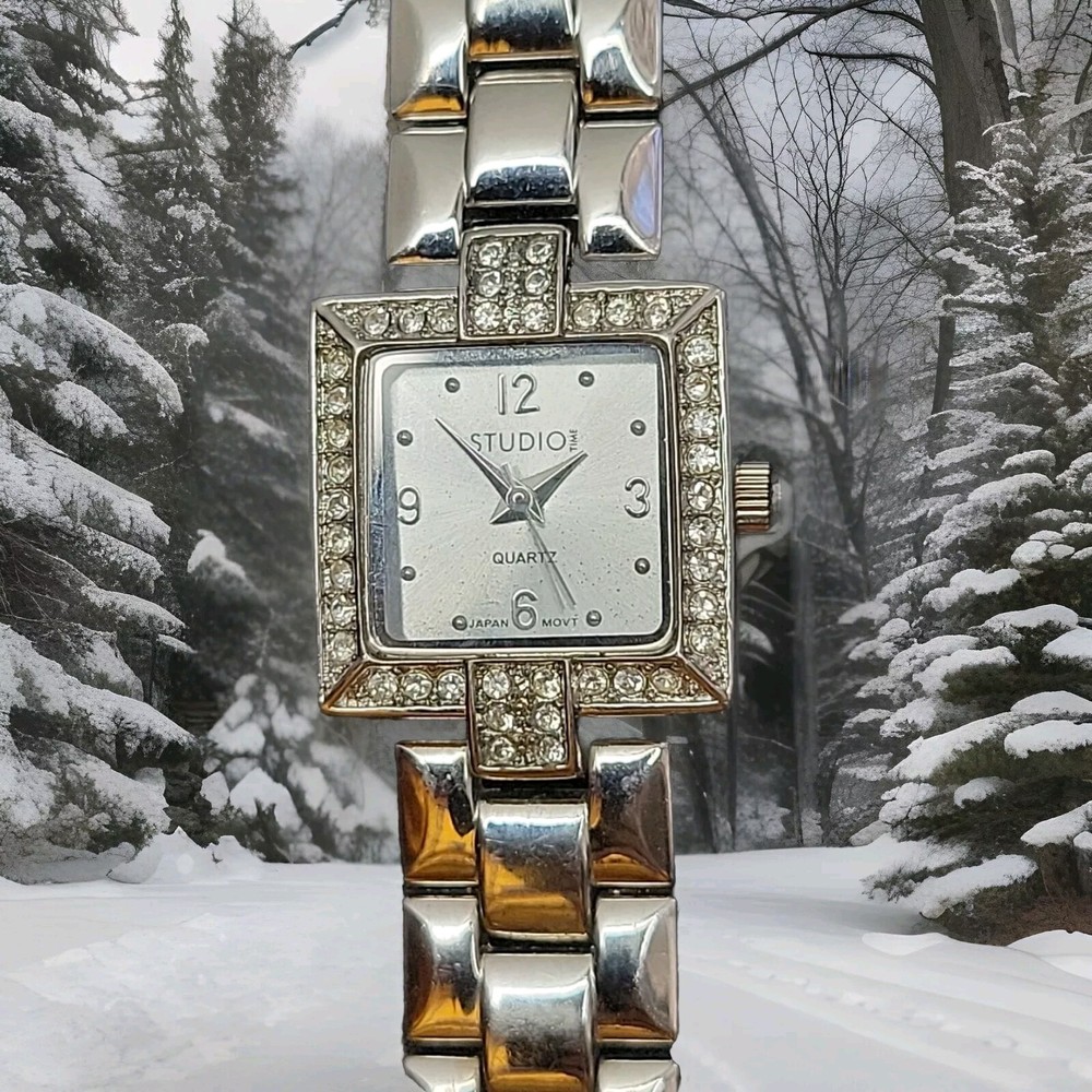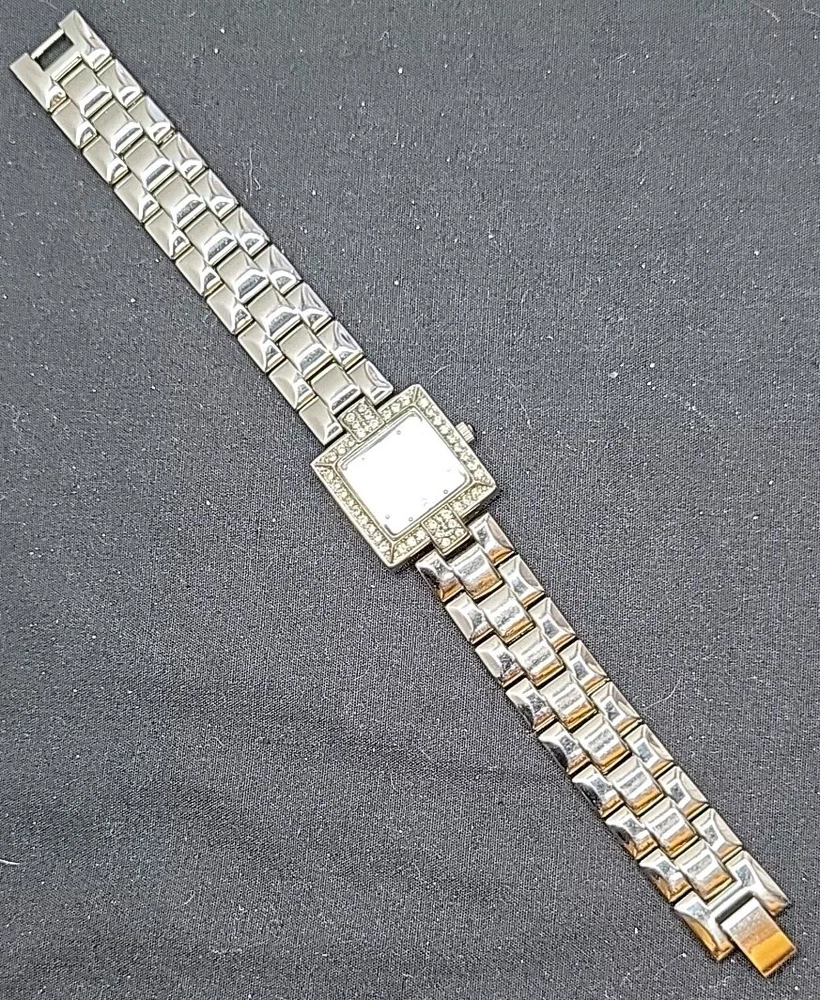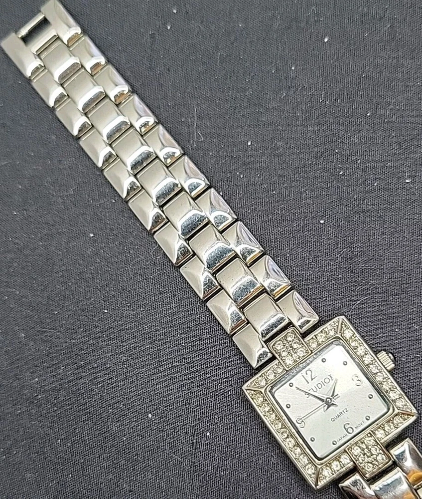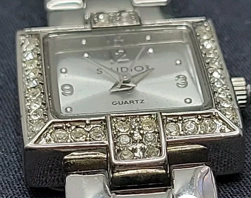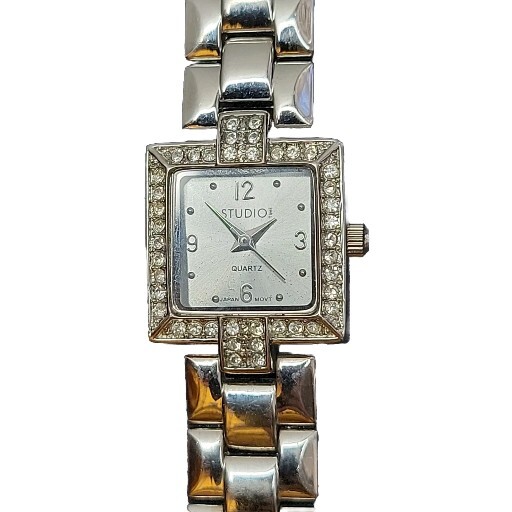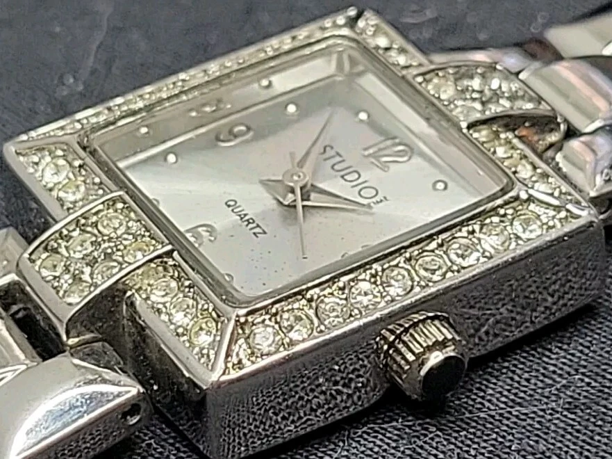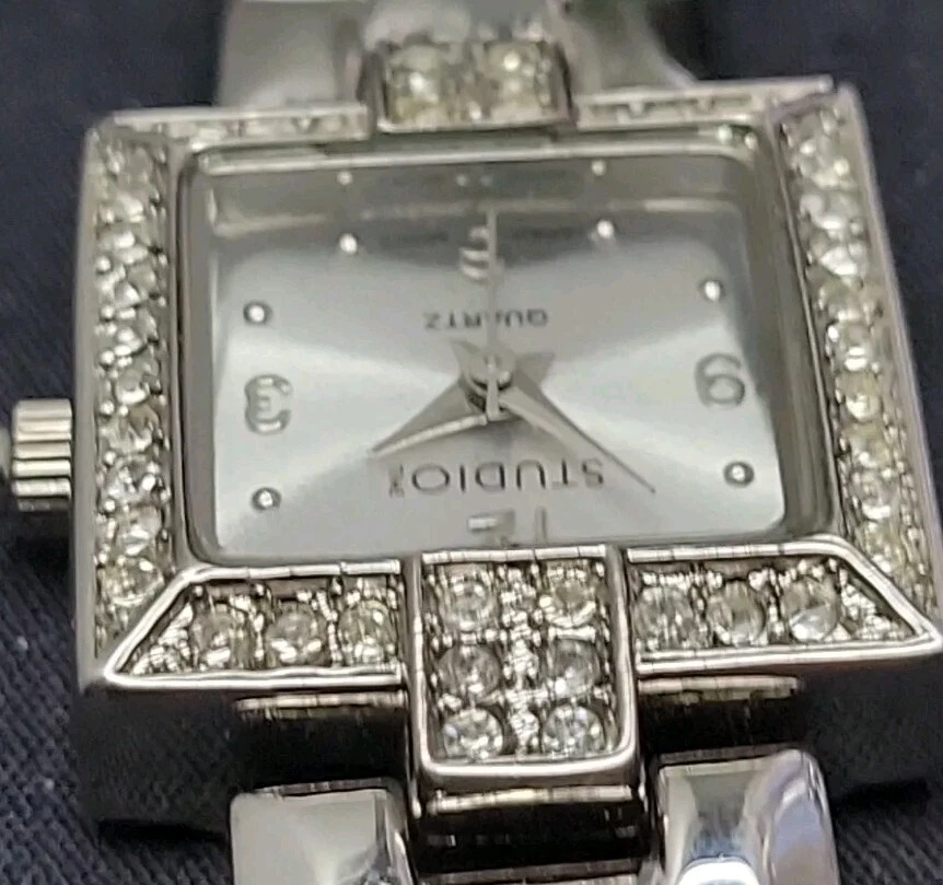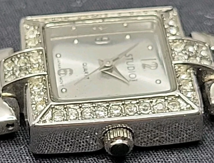 In very good condition. New Battery Runs Great. Some scuffing from use. Look at the pictures closely. Check out my other watch clock listings in my store. This Studio Silver Tone Square Dial Rhinestones Bezel Quartz Watch features a stylish design with a silver dial adorned with rhinestones on the bezel. The bangle-style stainless steel bracelet has a double-locking fold-over clasp for secure closure. The watch has a logo dial pattern with numbers and dots as indices, and it is powered by a Japan Quartz movement. With a case size of 22mm and a slim 8mm case thickness, this watch is suitable for women and can be worn for both formal and casual occasions.
