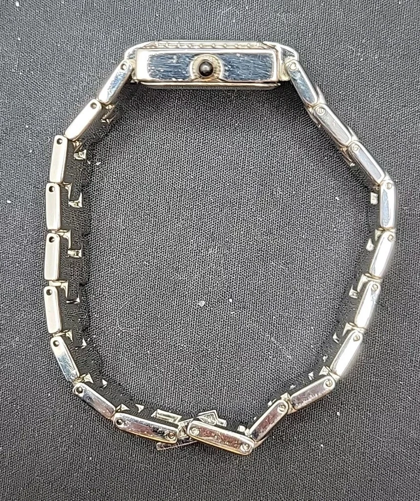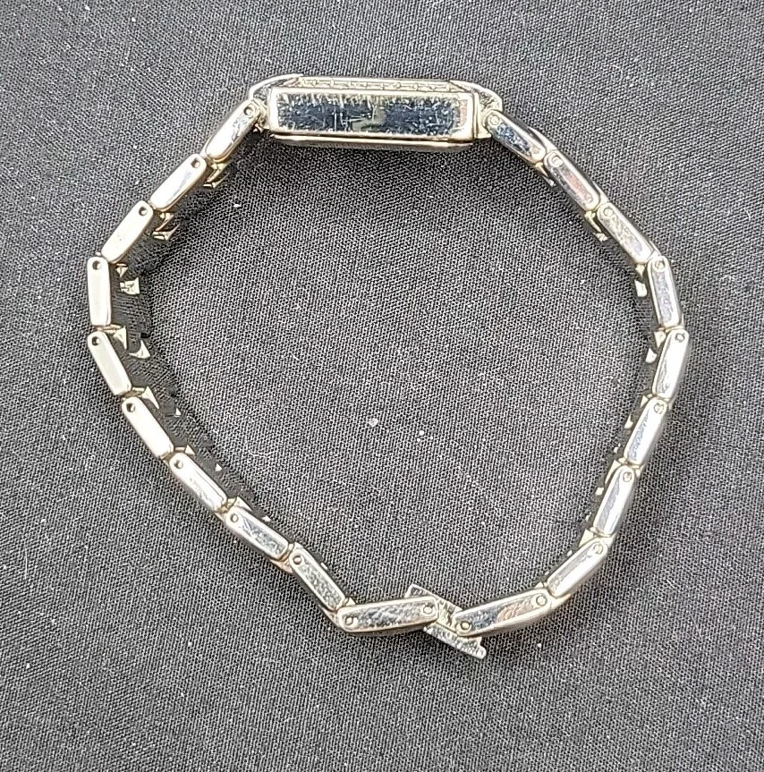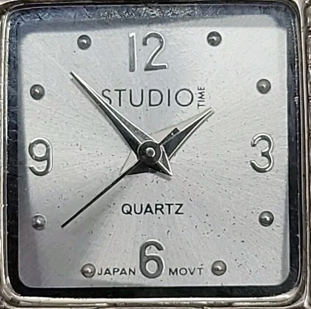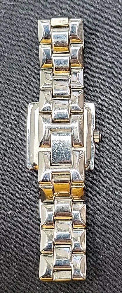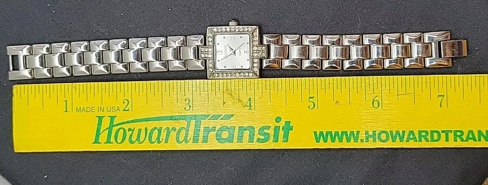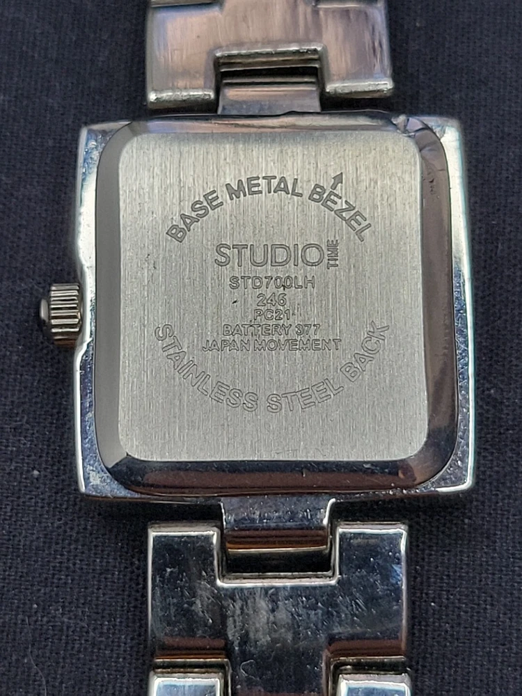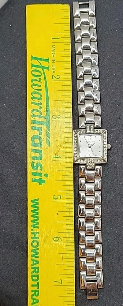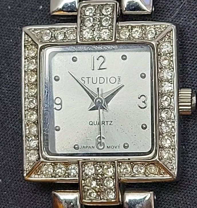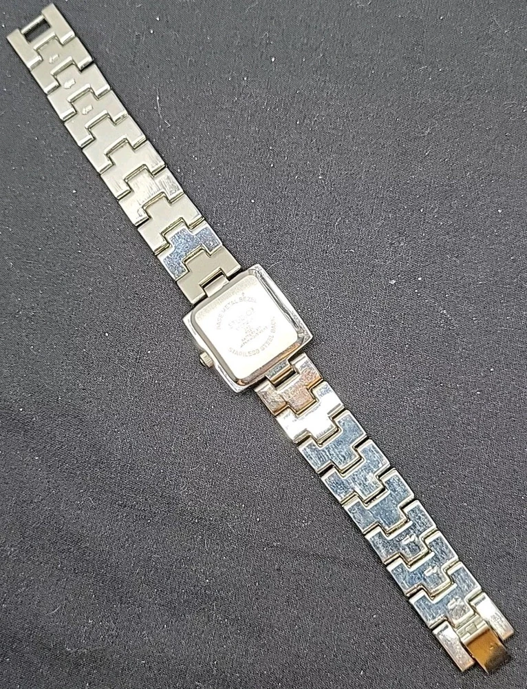 In very good condition. New Battery Runs Great. Some scuffing from use. Look at the pictures closely. Check out my other watch clock listings in my store. This Studio Silver Tone Square Dial Rhinestones Bezel Quartz Watch features a stylish design with a silver dial adorned with rhinestones on the bezel. The bangle-style stainless steel bracelet has a double-locking fold-over clasp for secure closure. The watch has a logo dial pattern with numbers and dots as indices, and it is powered by a Japan Quartz movement. With a case size of 22mm and a slim 8mm case thickness, this watch is suitable for women and can be worn for both formal and casual occasions.