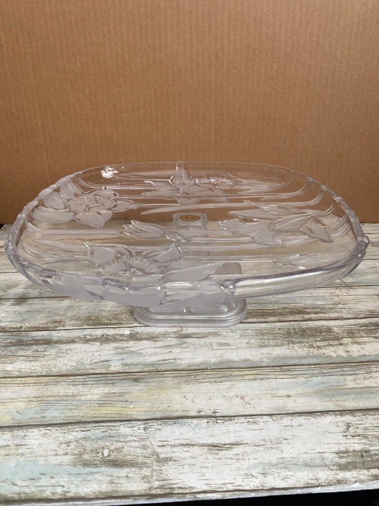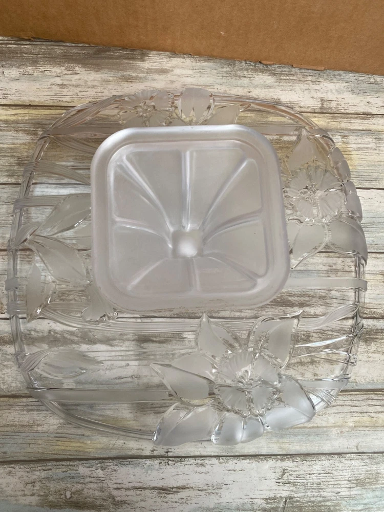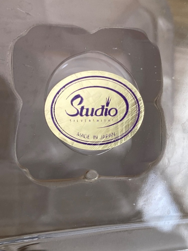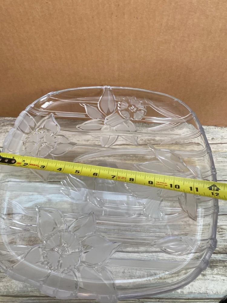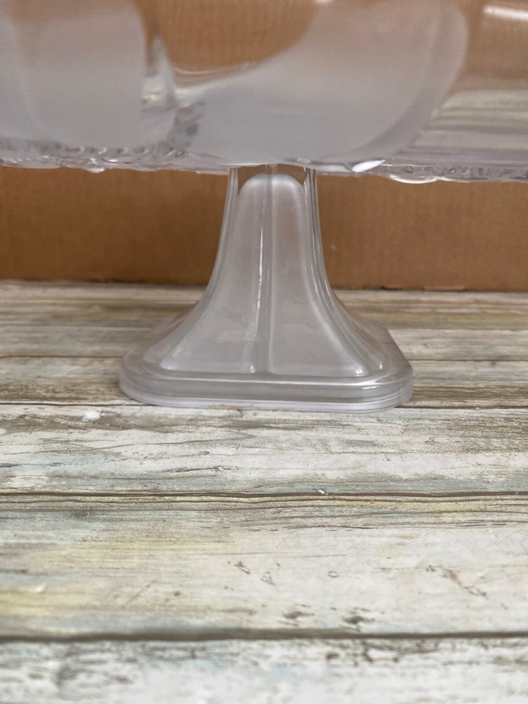 Elegant square glass cake stand with intricate lily etching, perfect for showcasing desserts at any occasion. Its pedestal design adds a touch of sophistication to your table setting. • Brand Studio Silversmith • Square shape • Glass material • Lily etched design • Pedestal base • Made in Japan Measures approx 12" diameter x 4.5" H Pre-owned No visible flaws. 6 lbs *storage*