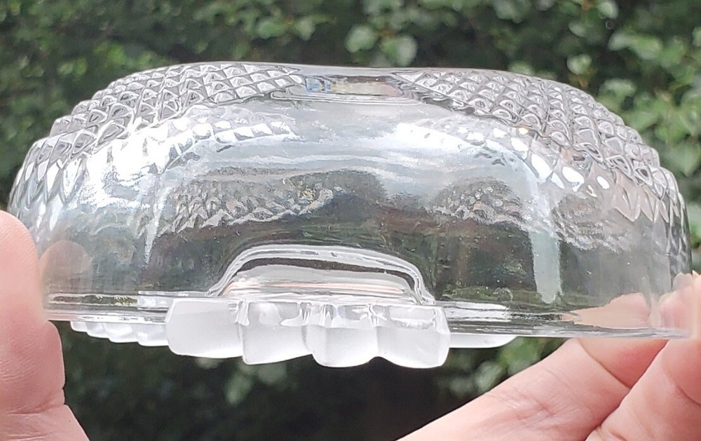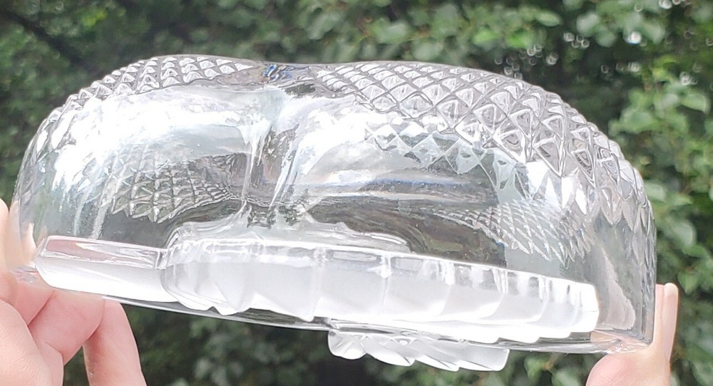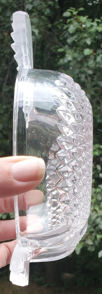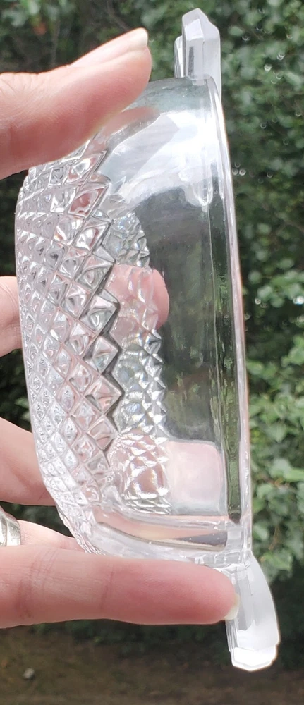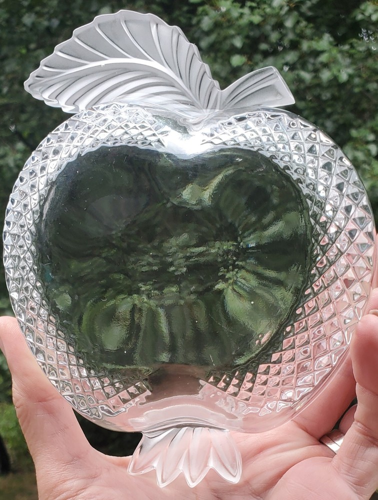 This beautiful Studio Silversmiths candy bowl dish is the perfect addition to any collection. Its unique apple shape and etched crystal design make it a stunning piece that is sure to impress. Measuring 5 inches in length, 4 inches in width, and 1.75 inches in height, this bowl is perfect for any occasion and is sure to hold your favorite candies or other small treats. No noticed imperfections. Please see all pics as they are part of the description. It really is a pretty piece of glass.