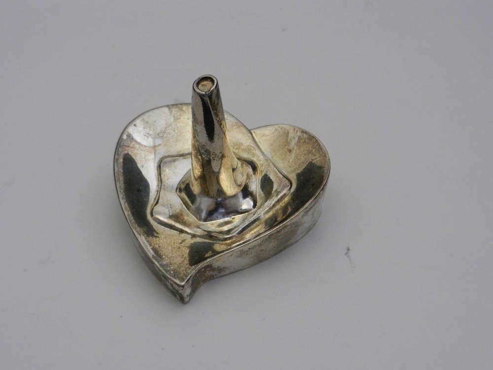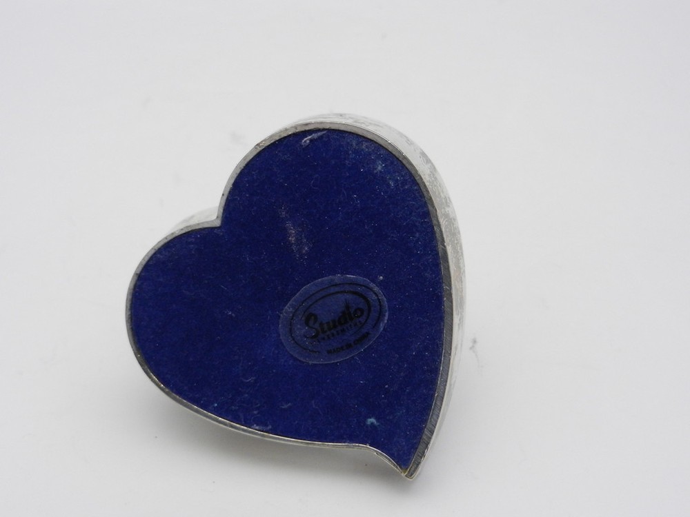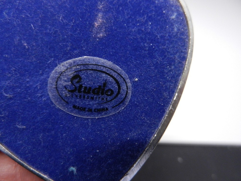 Studio Silversmiths Silver Plate Ring Holder Heart Shaped 2 1/2" x 2 3/4". Production date not known, but contenporary. Original Made in China label on bottom. Condition - excellent (see 2 below) - no dents, cracks. 1.) Mint- Like New or New; 2.) Excellent- Used but near new with very minor wear, if any (small scratches or abrasions which are not very noticeable) 3.) Very Good- Used shows wear (scratches and/or abrasions) consistent with age of item; 4.) Fair - Shows considerable wear (many scratches or abrasions) and/or chips and/or cloudiness; 5.) Poor- Considerable wear and/or minor to severe damage Powered by eBay Turbo Lister The free listing tool. List your items fast and easy and manage your active items.
