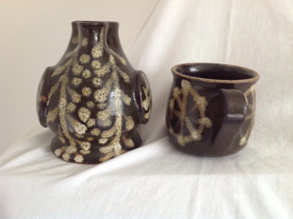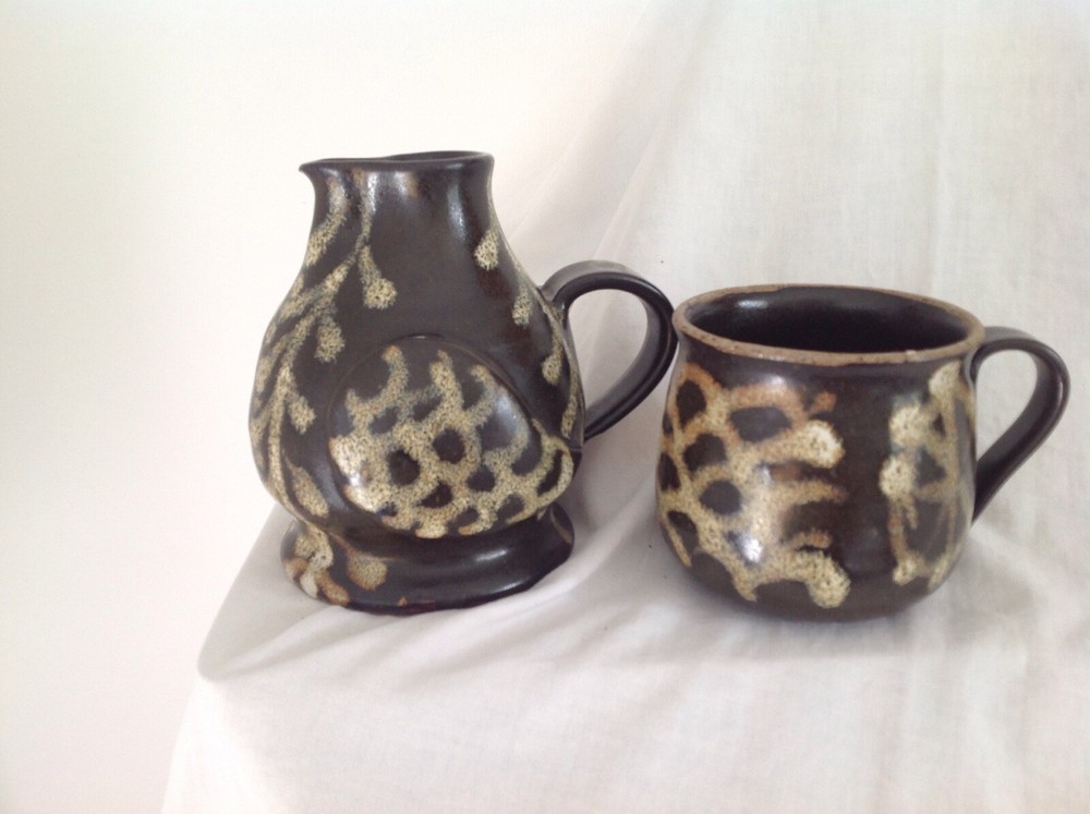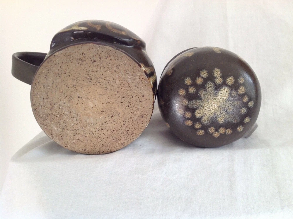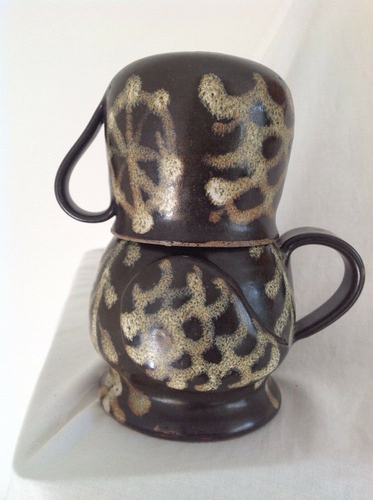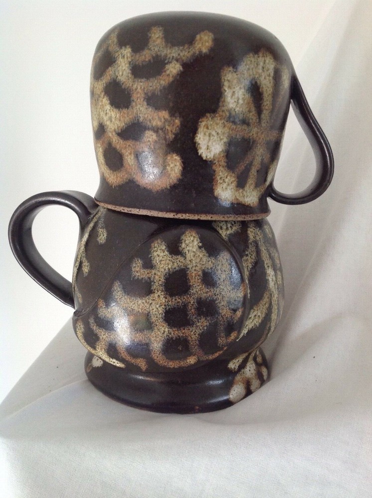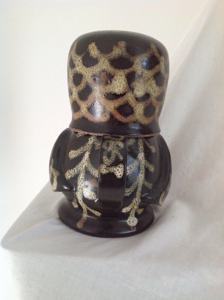 This is a lovely handmade Studio Pottery jug and cup set made to look like an owl when stacked together with the cup handle forming the beak. The set has a dark brown background glaze and a slipware like pattern applied in speckled shades of brown, the body seems to be a form of stoneware so is hardwearing. This was commissioned by my mother and was designed to sit on a bedside table for pouring water during the night. The jug measures 5" (13cm) high, the cup is 3" (8cm) high and the total combined height is 6.5" (16.5cm). The set is not marked and is in very good condition with no chips, cracks or crazing and is a lovely fun item.
