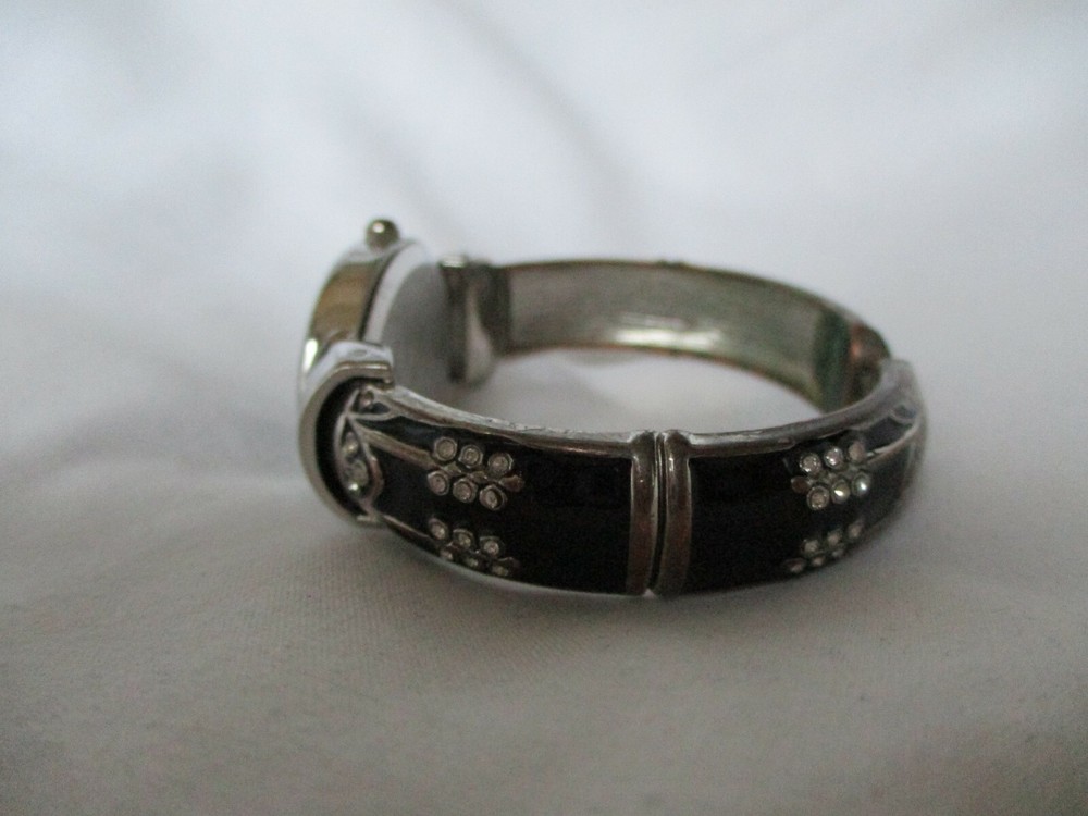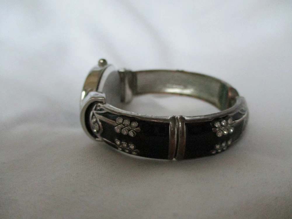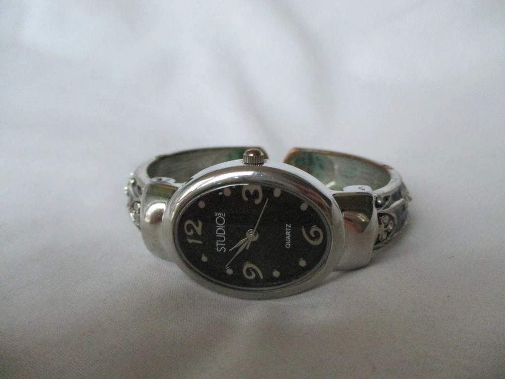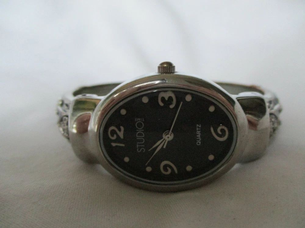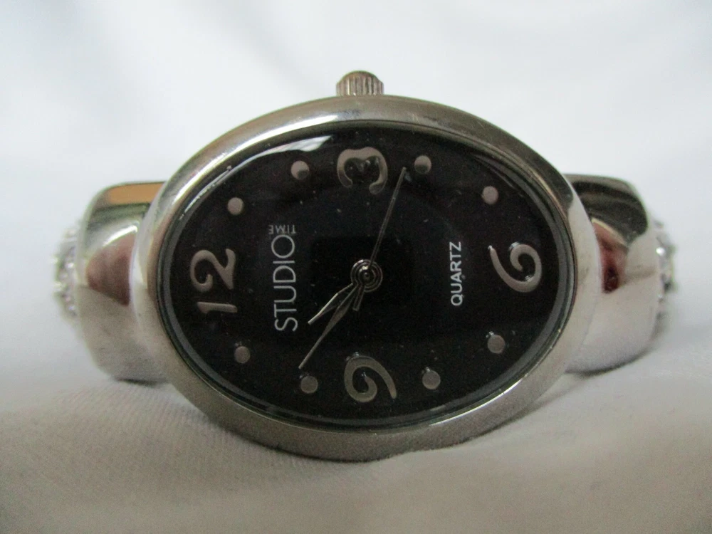 Brand: Studio TIME Display: Oval Shaped Black Analog Face Band: Silver Tone & Black Cuff Band Other: Sparkly Pre-Owned 30 day unconditional money back guarantee. We do ship worldwide. International buyers pay any and all customs, expenses, and fees when and where due. Thanks! A great choice, and it's yours! This item is 100% guaranteed and, if needed, a free return shipping label. In order to serve you best, we welcome your emails. Thegothicdragon wants to provide you with quality clothing items at fair prices with unbelievable service. This can be achieved through good communication. Our buyers have years of combined experience. If there is anything on your wishlist, please let us know. -thegothicdragon Please make us an eBay favorite.