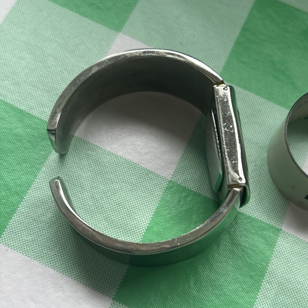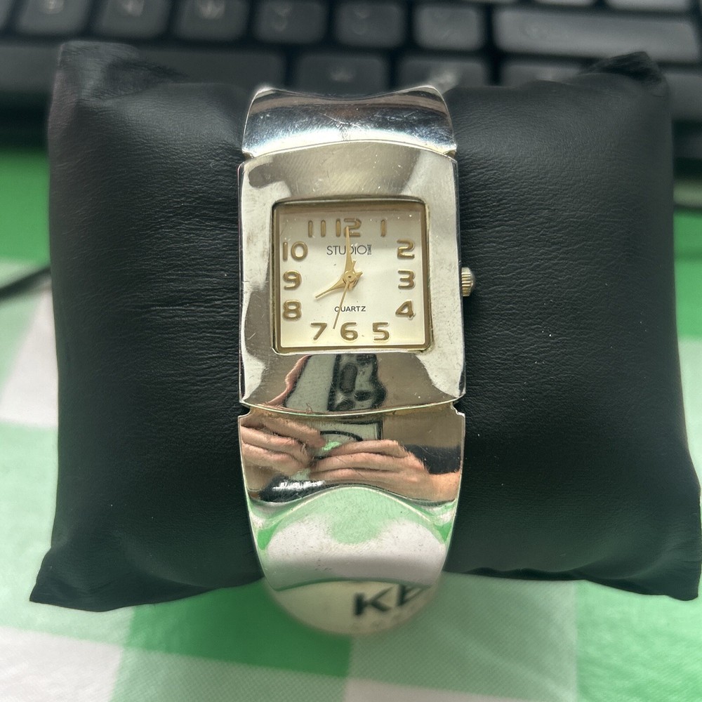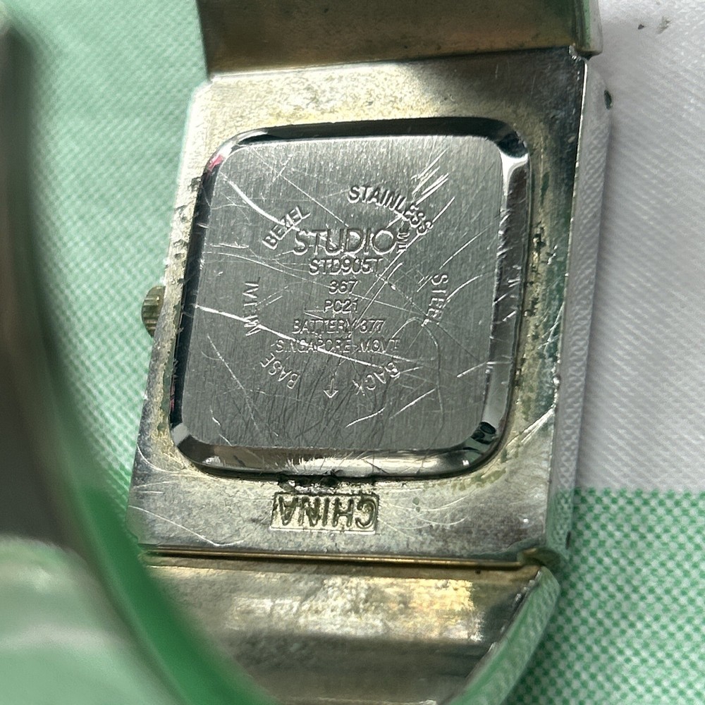 This Studio Time wristwatch features a square gold case with an analog display and a silver tone cuff band. The watch has a quartz movement and is perfect for casual wear. It does not come with papers, service records, or the original box/packaging. The watch size is 27 mm and it does not include a manual/booklet. Battery installed upon purchase 1