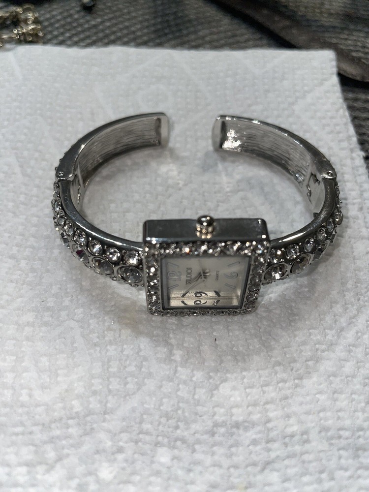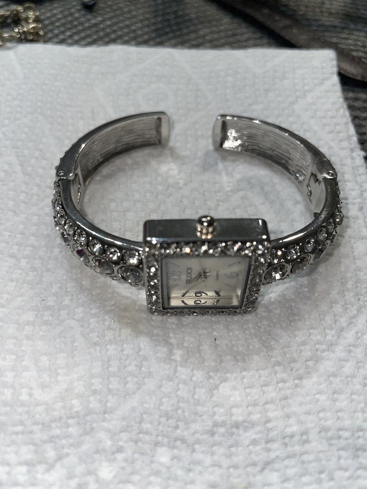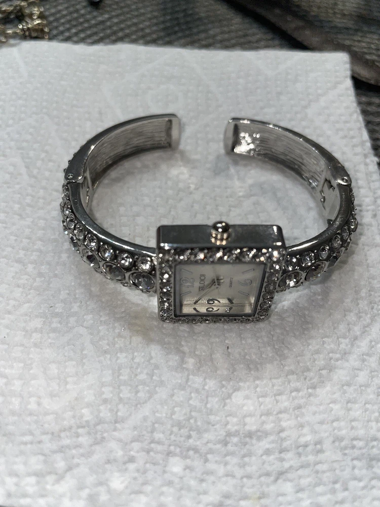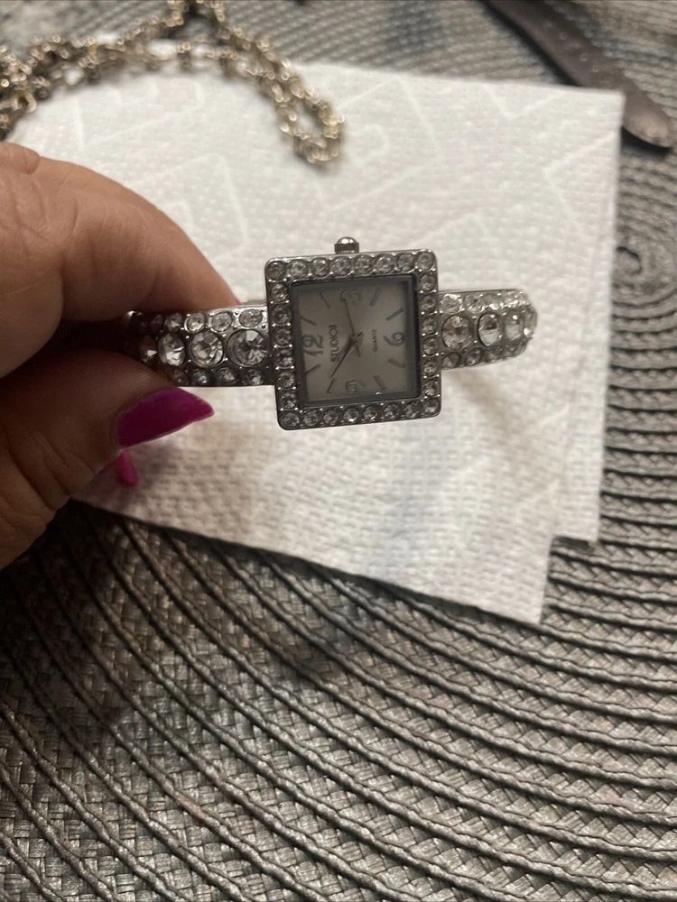 This Studio Time wristwatch features a square-shaped face with analog display, enclosed in a silver-colored case with a snap caseback. The watch is designed for women and has a cuff band with a buckle closure. The watch is not customized and has a classic style, perfect for any occasion. The watch is ideal for those who prefer a simple and elegant accessory. The silver color of the case and band gives it a timeless appeal. This wristwatch is a great addition to any collection and can be worn alone or paired with other jewelry pieces for a complete look.great working condition