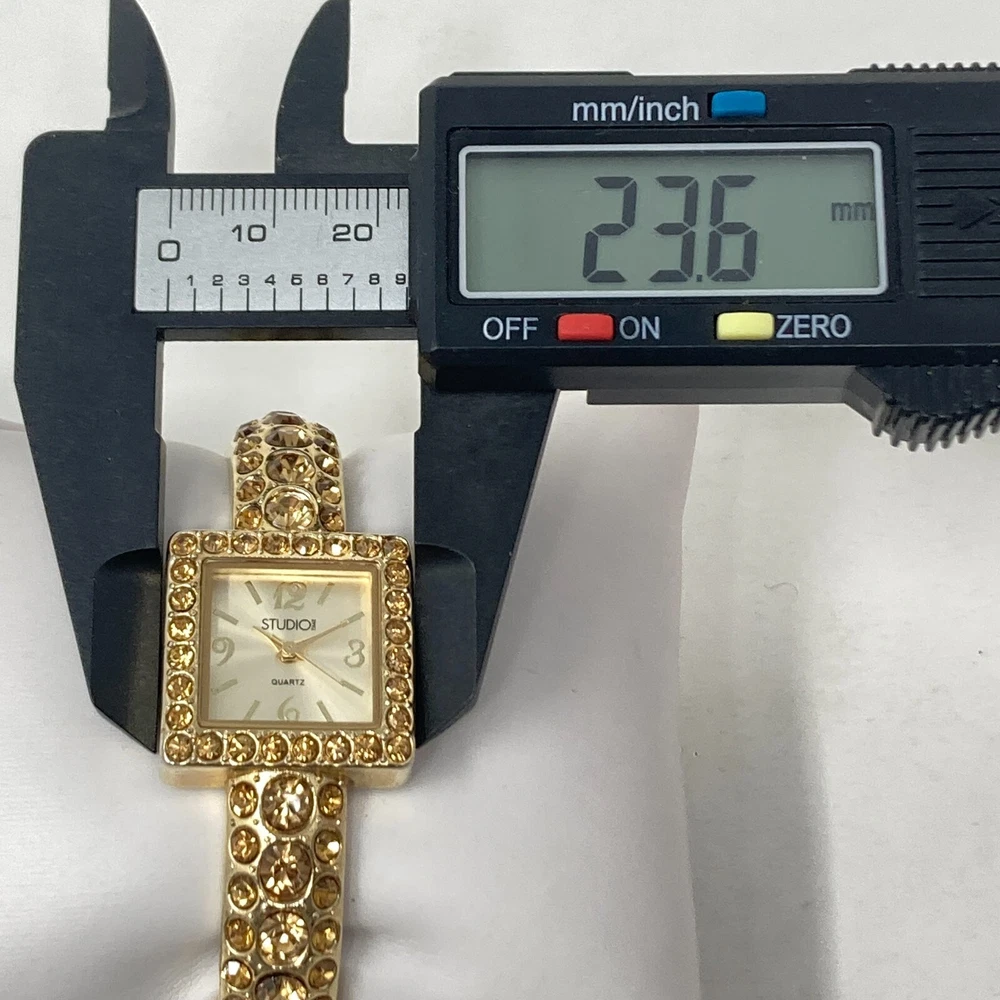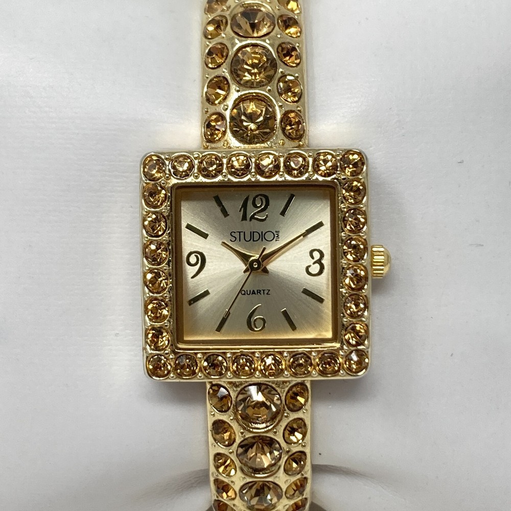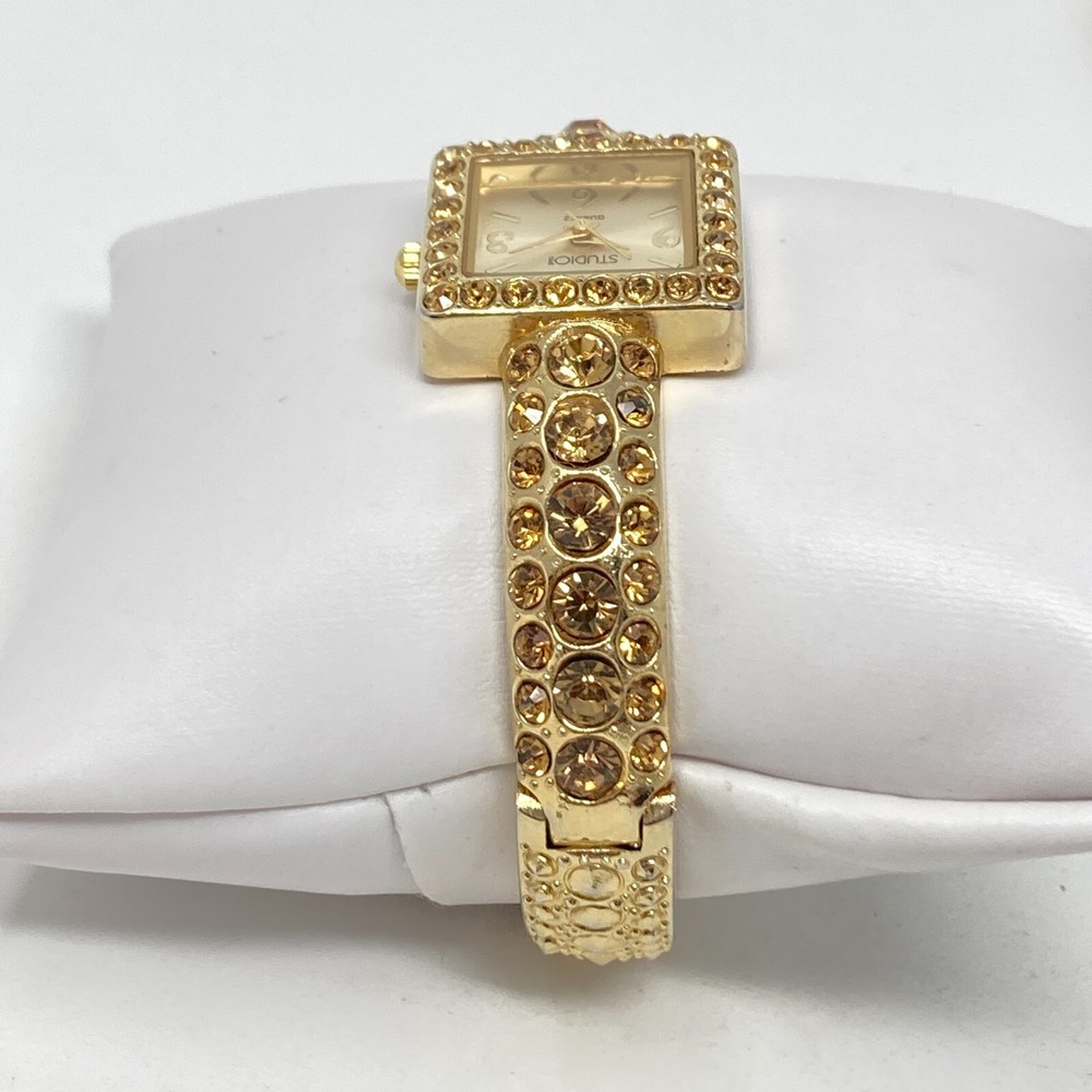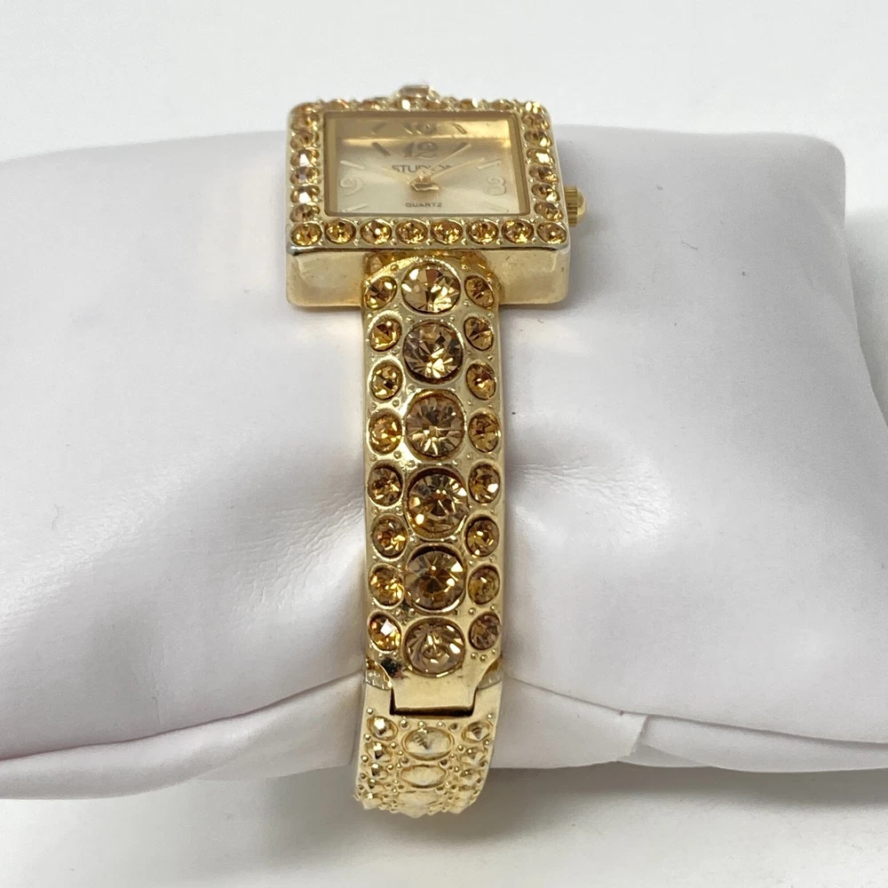 This watch is absolutely stunning! The gold tone and orange crystals give it a glamorous yet fun look. It keeps perfect time with the new battery, and the slight wear on the band adds character. Love that it ships fast and comes with a hassle-free return policy—great deal for such a stylish piece!
