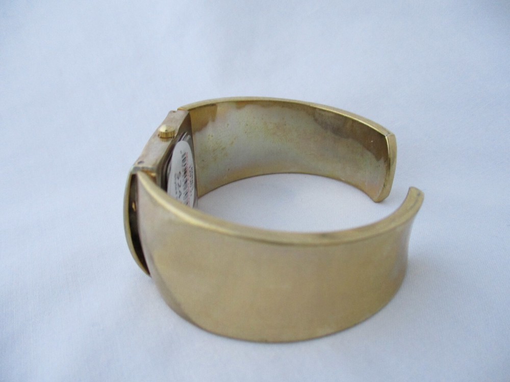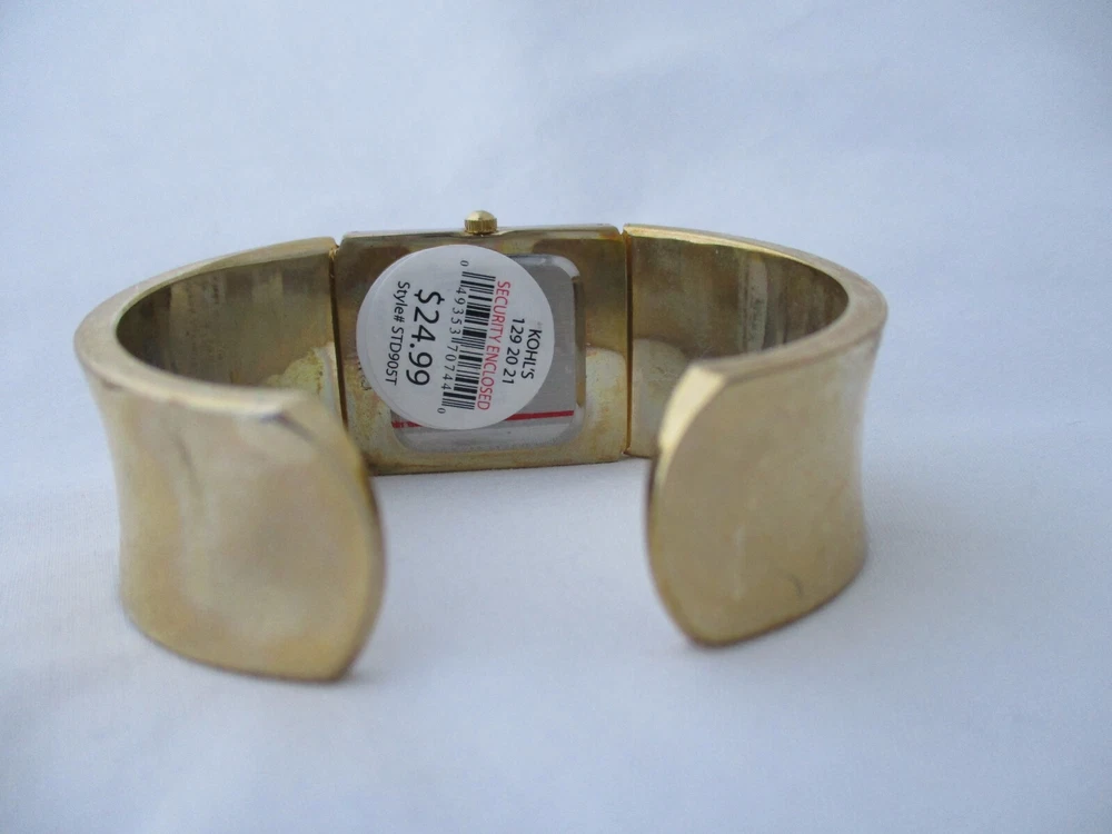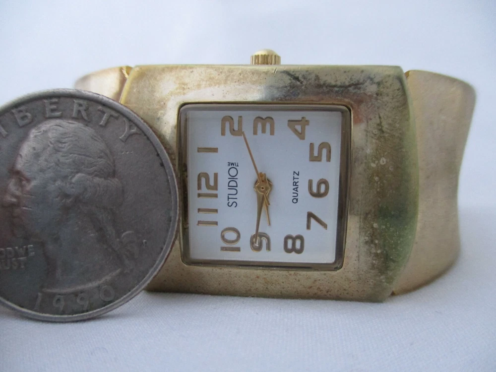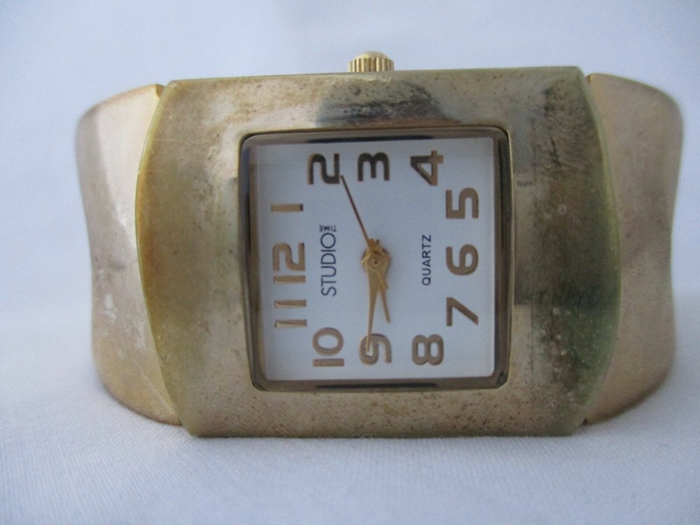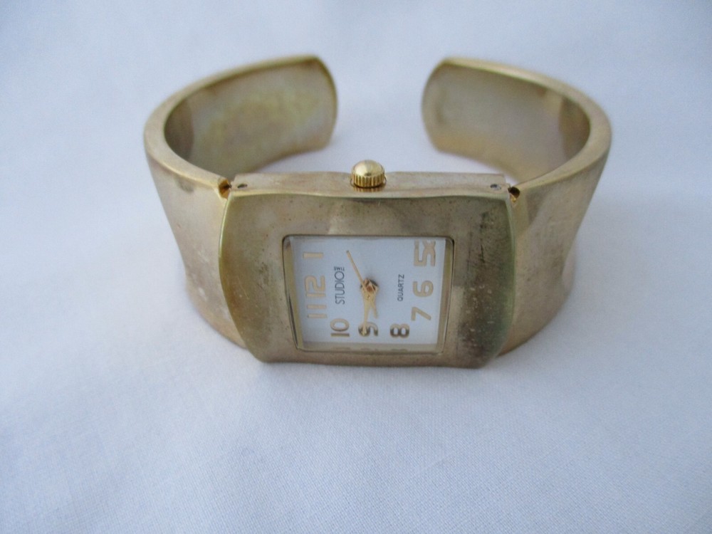Brand : Studio Time Display : Analog Band : Gold Toned Cuff Band Item : 11-9-21WV5 Good used condition Please see photos Your watch may require a new battery installation upon arrival 30 day unconditional money back guarantee. We do ship worldwide. International buyers pay any and all customs, expenses, and fees when and where due. Thanks! A great choice, and it's yours! This item is 100% guaranteed and, if needed, a free return shipping label. In order to serve you best, we welcome your emails. Thegothicdragon wants to provide you with quality clothing items at fair prices with unbelievable service. This can be achieved through good communication. Our buyers have years of combined experience. If there is anything on your wishlist, please let us know. -thegothicdragon Please make us an eBay favorite.