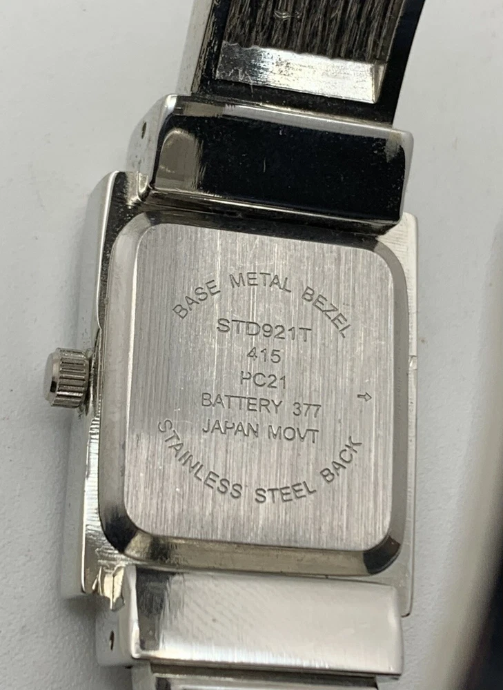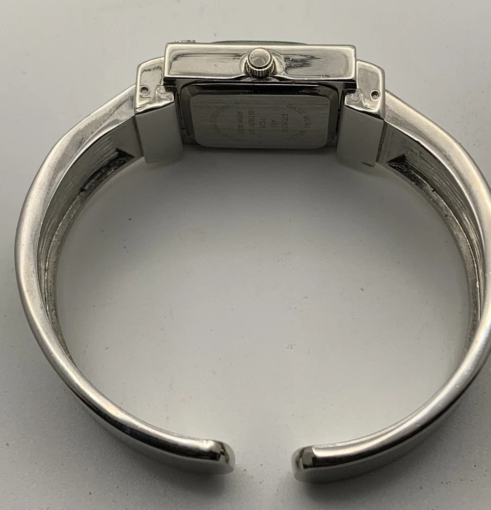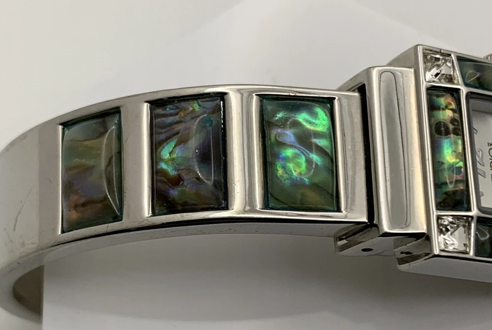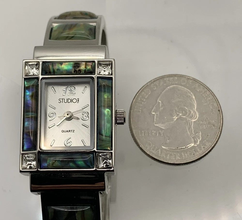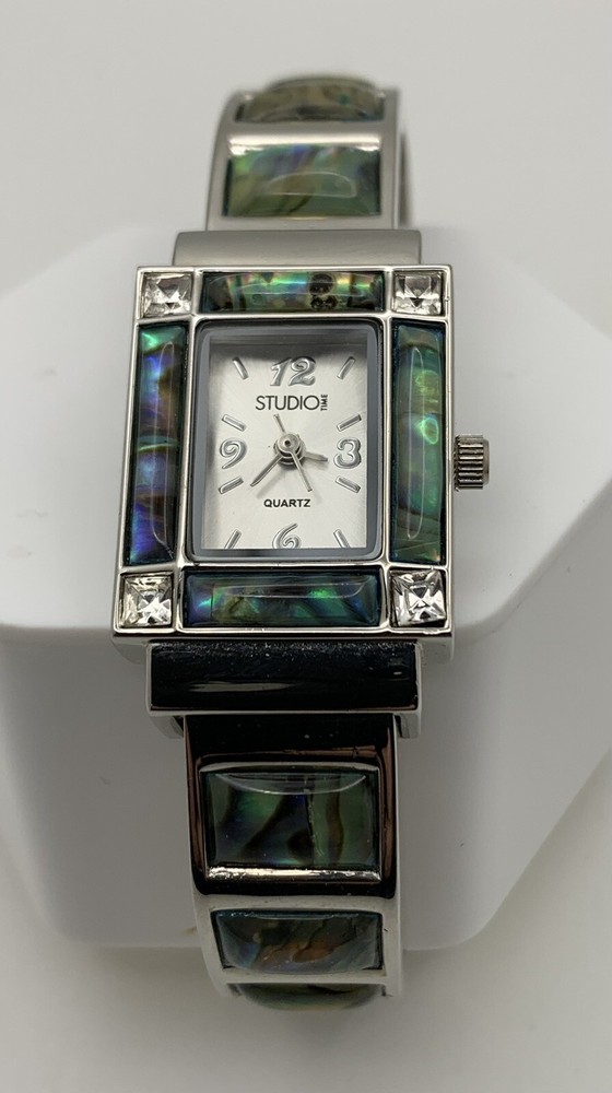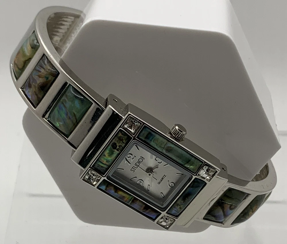 Elevate your style with this stunning ladies cuff watch from Studio Time. The silver tone band is made of high-quality stainless steel, with a rhinestone and abalone accented bezel that adds a touch of elegance to your look. This watch features an analog display with Arabic numerals and baton indexes, along with a 12-hour dial and seconds hand. The push/pull crown ensures easy time setting, while the cuff closure provides a comfortable fit for wrist sizes ranging from 7-9 inches. With a case size of 21mm and a slim profile of only 7mm, this watch is perfect for both dressy occasions and casual wear. Very good pre-owned condition. Please view the item specifics and photos; email me any questions. Thank you for visiting.