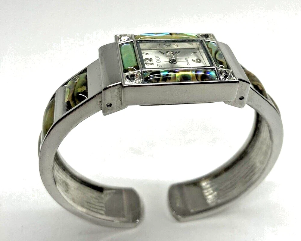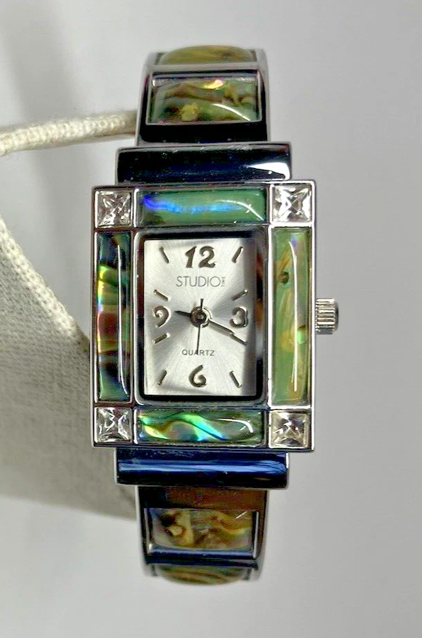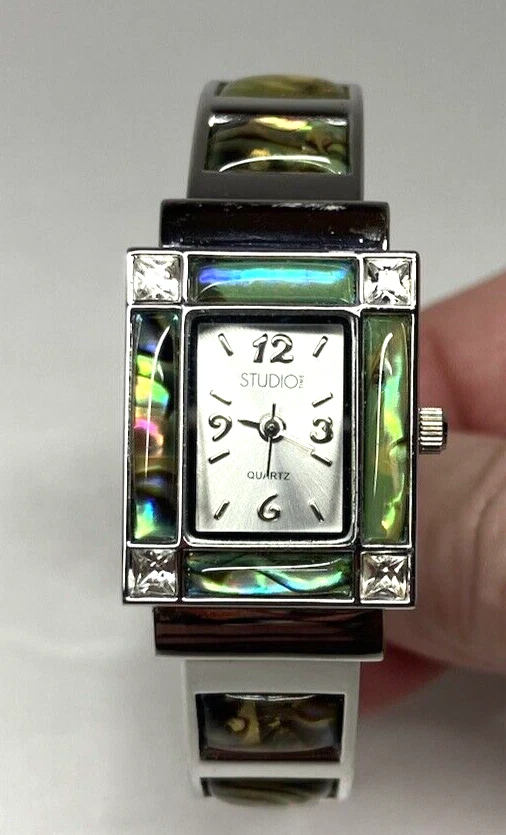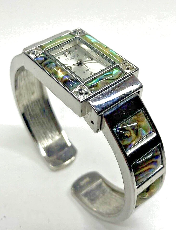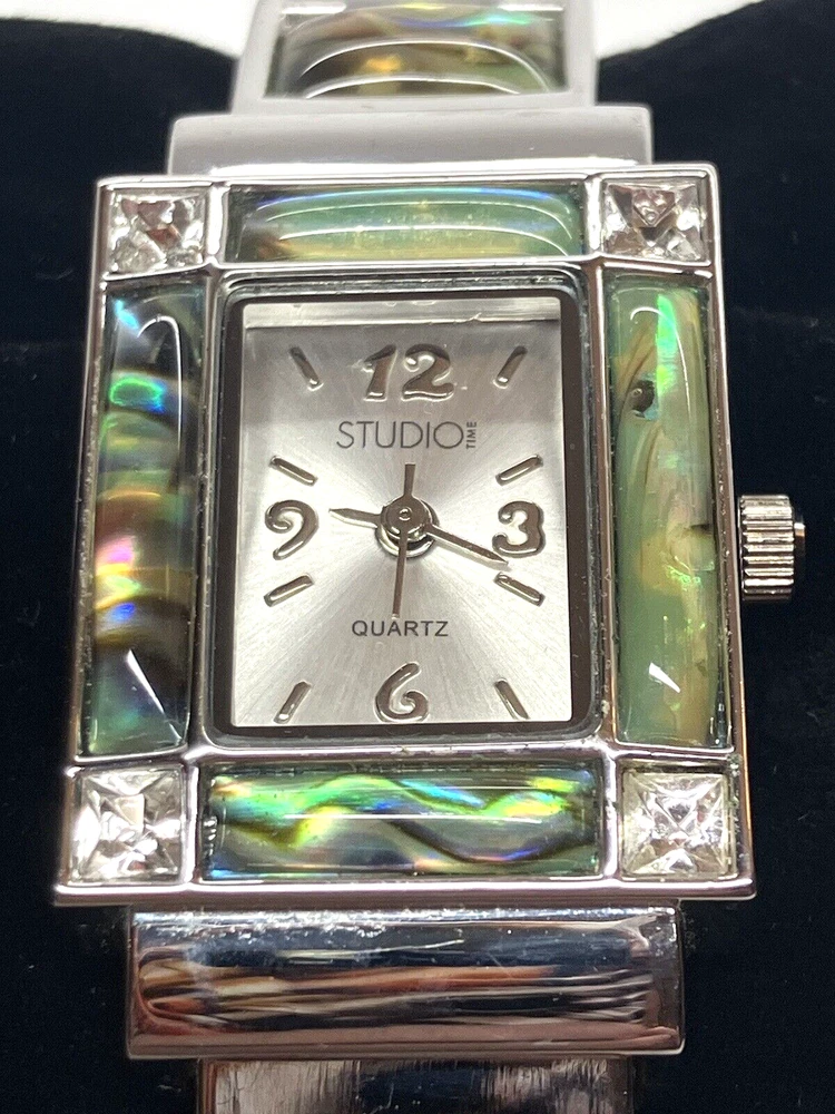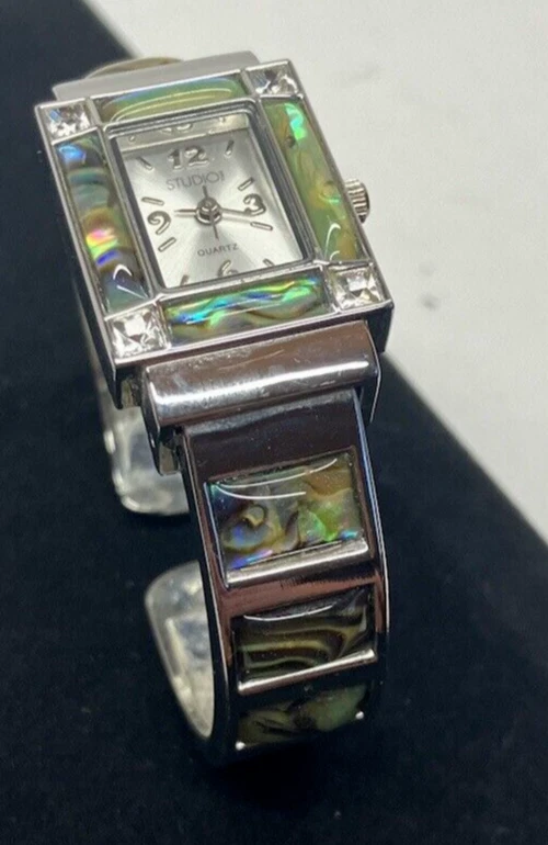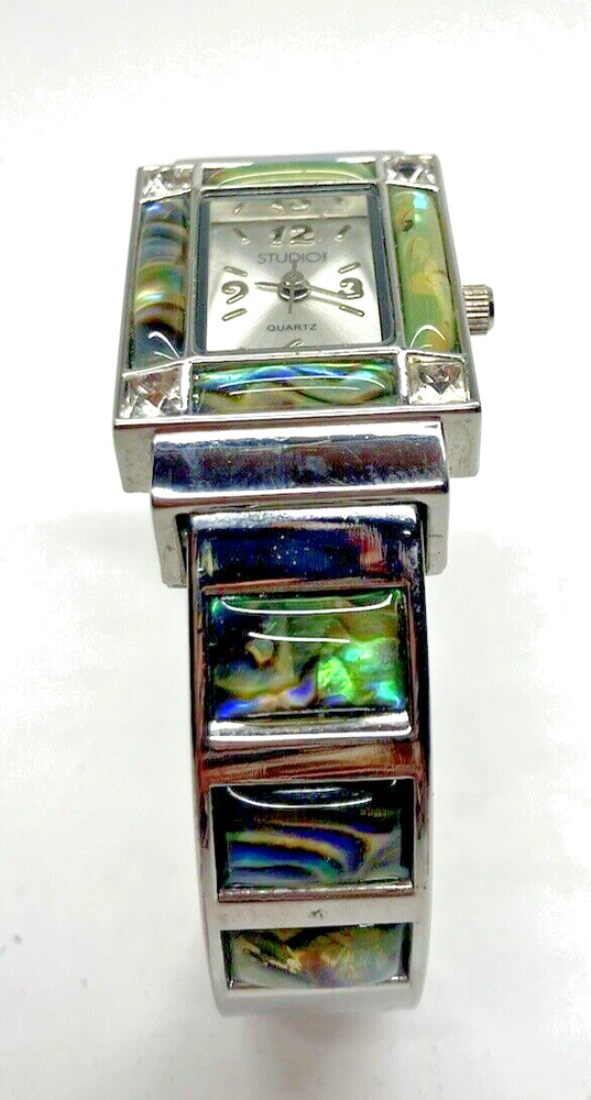 Studio Time Ladies Cuff Watch Silver Tone W/Rhinestones & Abalone - battery not included. Please see pictures for more details. Fast shipping! If you have any questions, feel free to reach out to us. We appreciate your interest! Check out our other listings and store for more items!