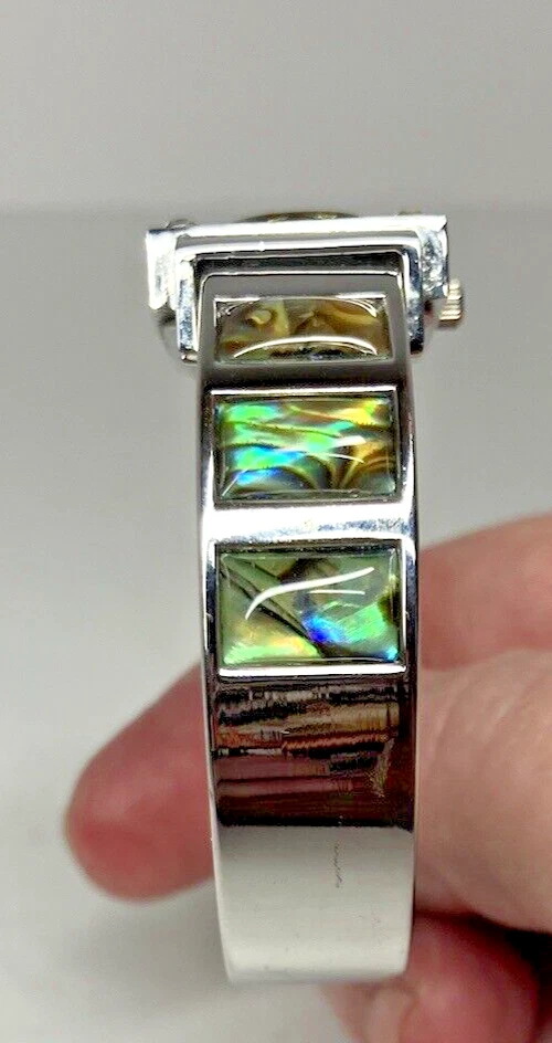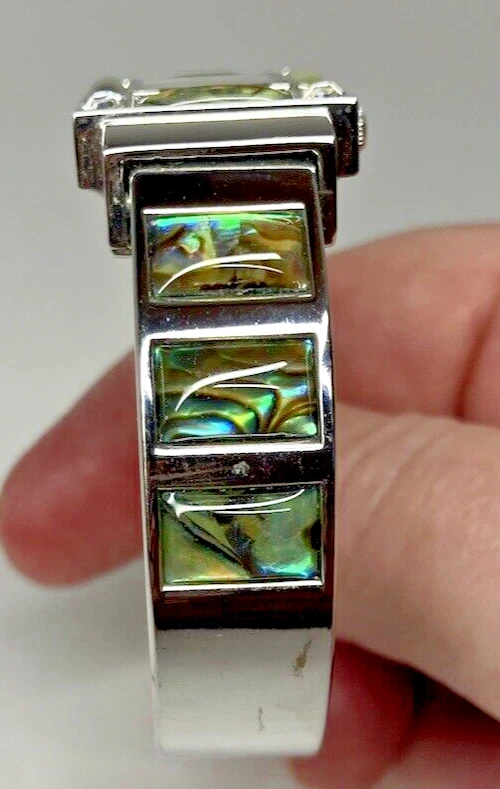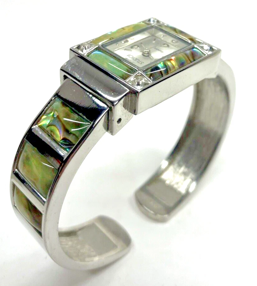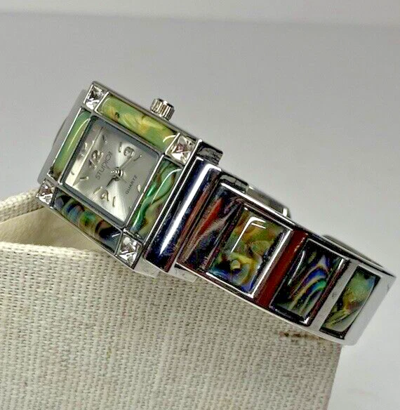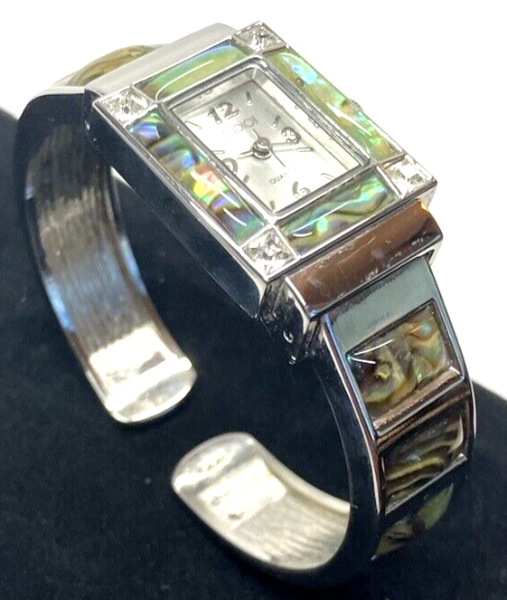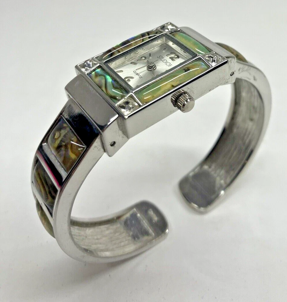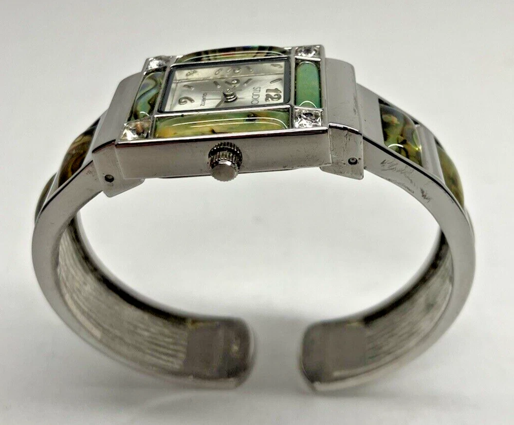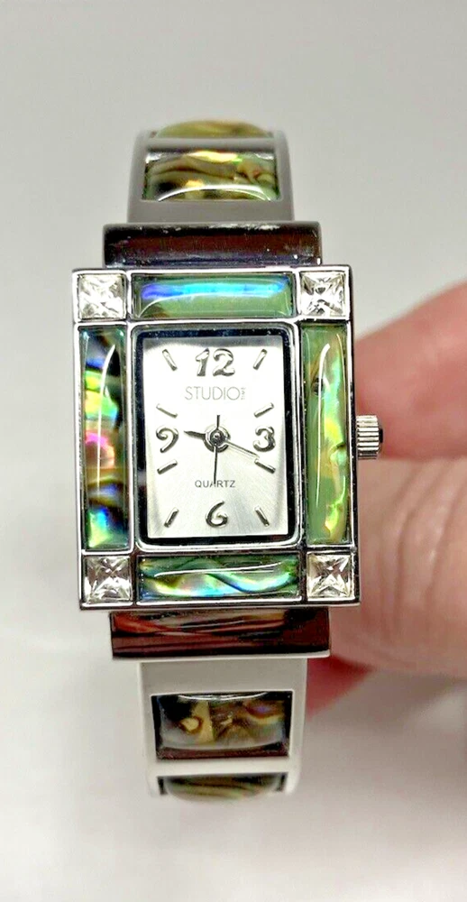 Studio Time Ladies Cuff Watch Silver Tone W/Rhinestones & Abalone - battery not included. Please see pictures for more details. Fast shipping! If you have any questions, feel free to reach out to us. We appreciate your interest! Check out our other listings and store for more items!
