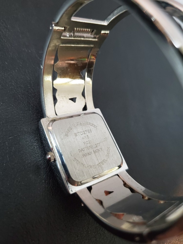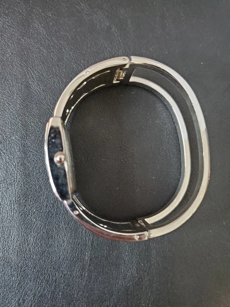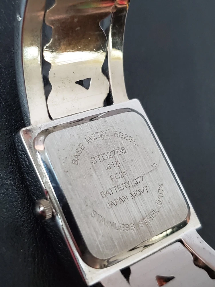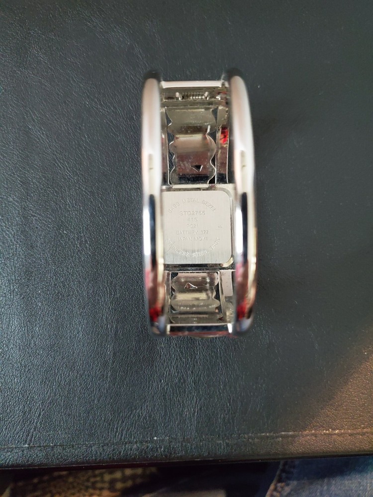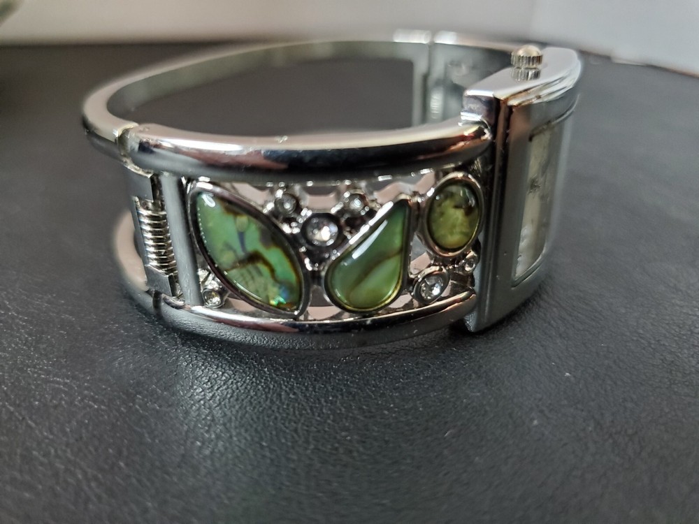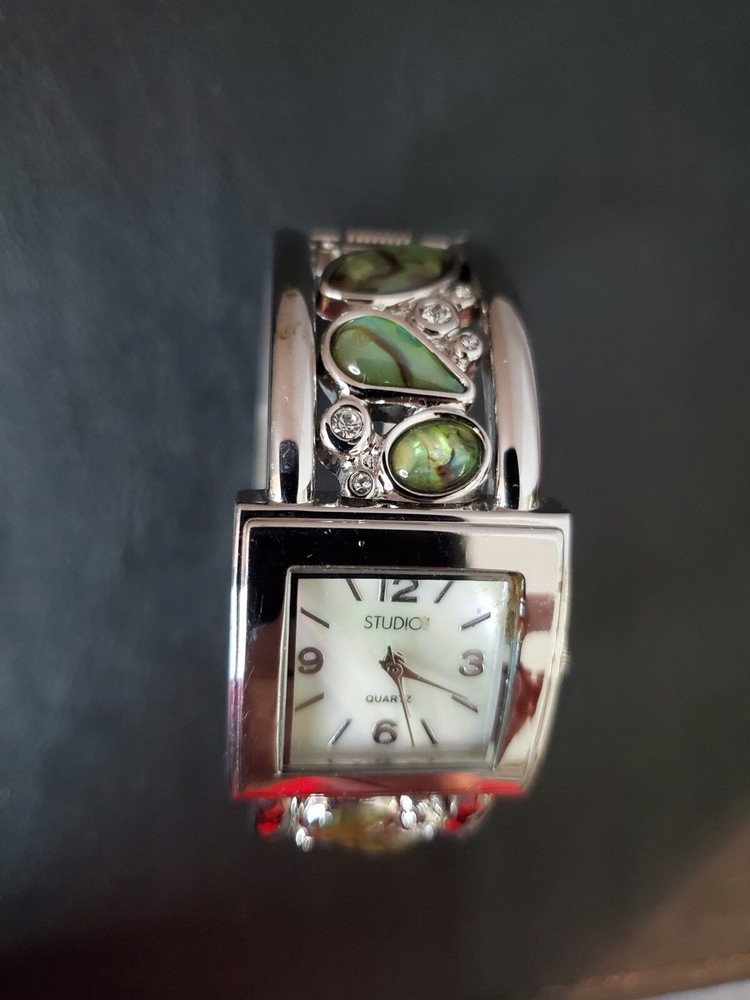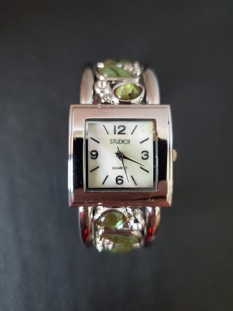 This silver toned Studio Time Quartz watch is designed for women and has a stylish cuff bangle metal hinged band accented on the sides with green gems. The square shaped watch has a silver colored bezel and silver toned Arabic numerals with stick indexes against a silver dial. The watch is pre-owned but in good condition, with a smooth bezel type and a push/pull crown with features such as seconds hand, 12-hour dial. Not RUNNING and may just need a new battery, you are buying as is. Review details as shown in the photos. NOTE: *** PLEASE READ EVERYTHING BEFORE PURCHASE *** CONDITION: Being sold as is. Pre-owned, Unknown history. I rely heavily on pictures to show condition and details. *** See all the photos and use the "zoom" feature for the best detail, especially on condition, and ask any questions you may have prior to bidding. The photos are of the exact item you will receive. *** PAYMENTS: Payments follow Ebay guidelines or are asked for within 48 hours from the end of the auction. (Unpaid items cases are automatically opened.) SHIPPING: All items will be shipped via USPS as indicated. COMBINED SHIPPING: Combined shipping is available for all items! All items MUST be paid for together for combined shipping. Please email for combined shipping price. RETURNS: No returns unless the wrong item is sent. Happy Bidding!