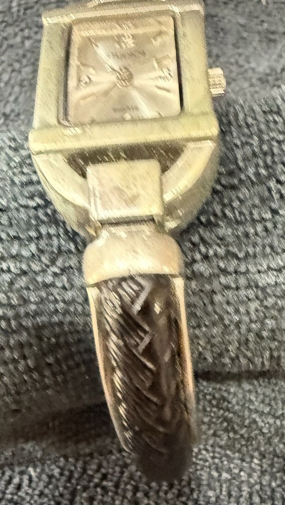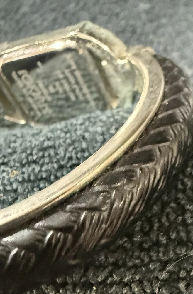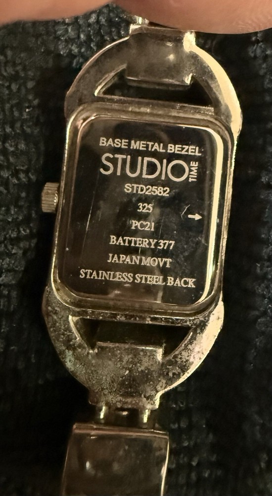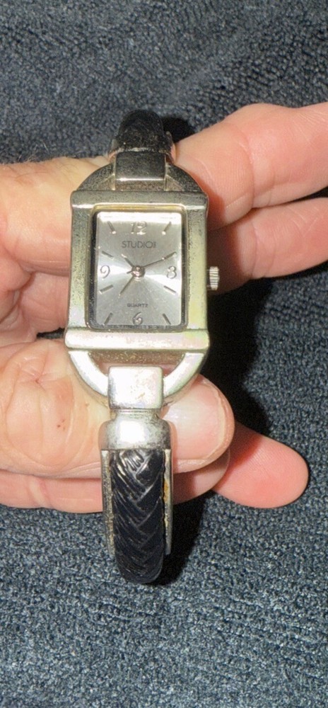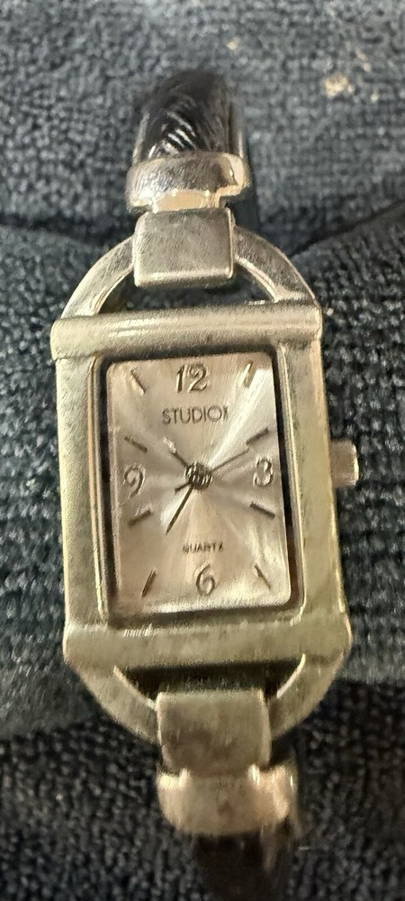 The Studio Time STD2582 Women's Silver Toned Black Faux Leather Hinge Cuff Watch features a silver bezel and case with a silver dial, complemented by a silver and black metal/faux leather bracelet. This quartz-powered wristwatch is designed for women, offering a versatile style suitable for dressy, casual, or classic occasions. It includes a seconds hand for precise timekeeping and has an analog display. The unique hinge cuff design adds a touch of elegance to this timepiece. NOT TESTED lot of watches & jewelry purchase