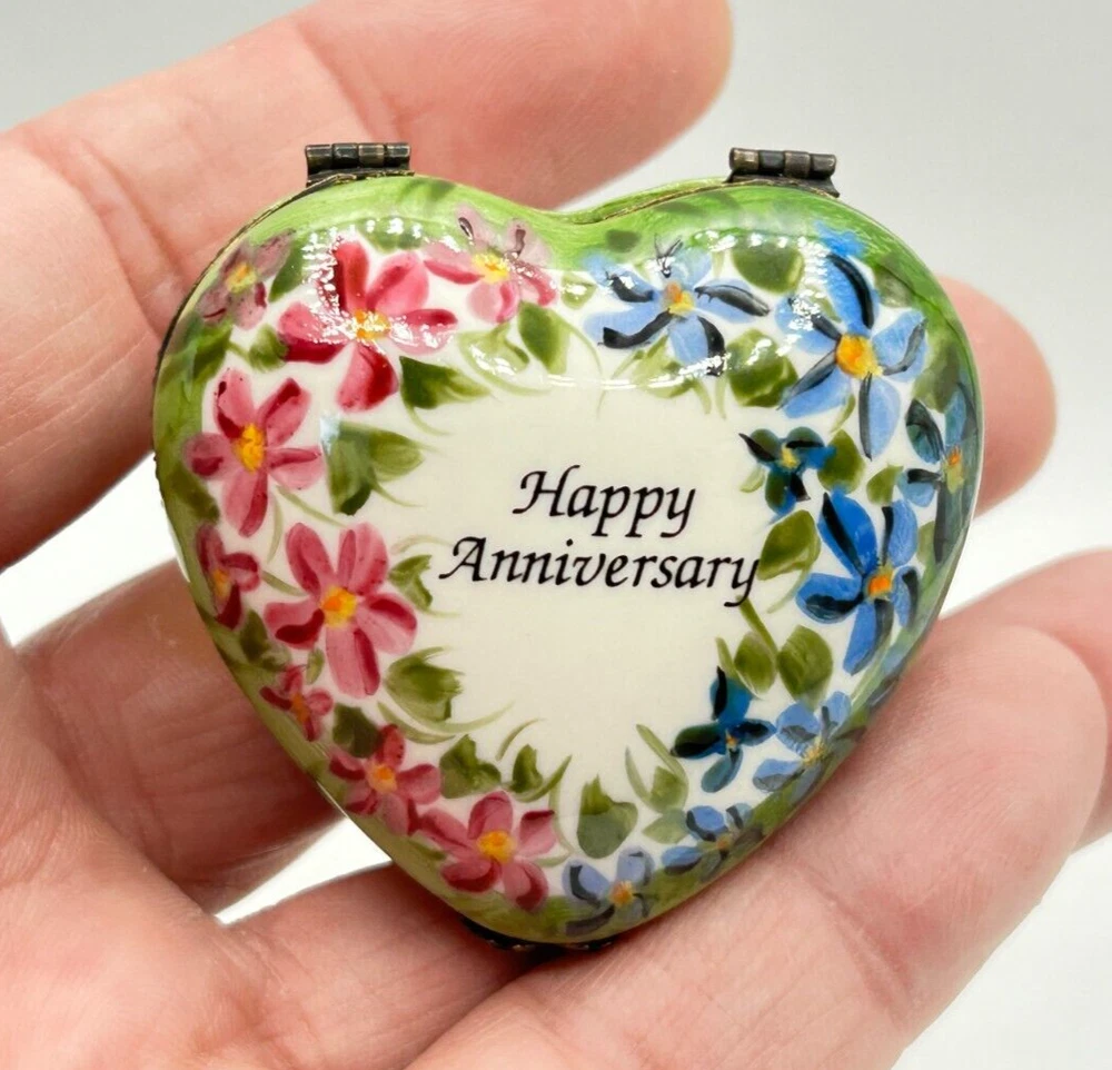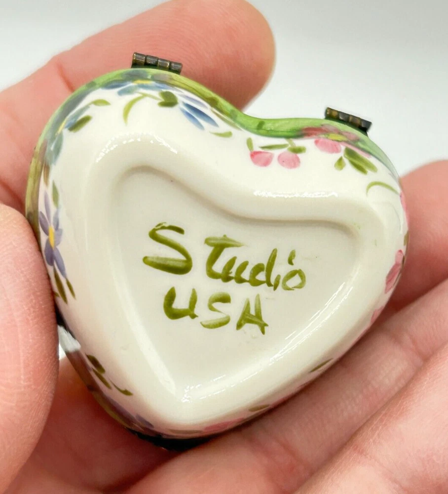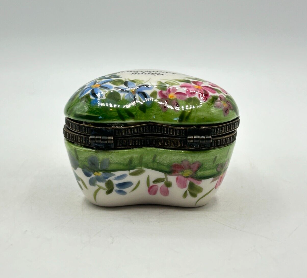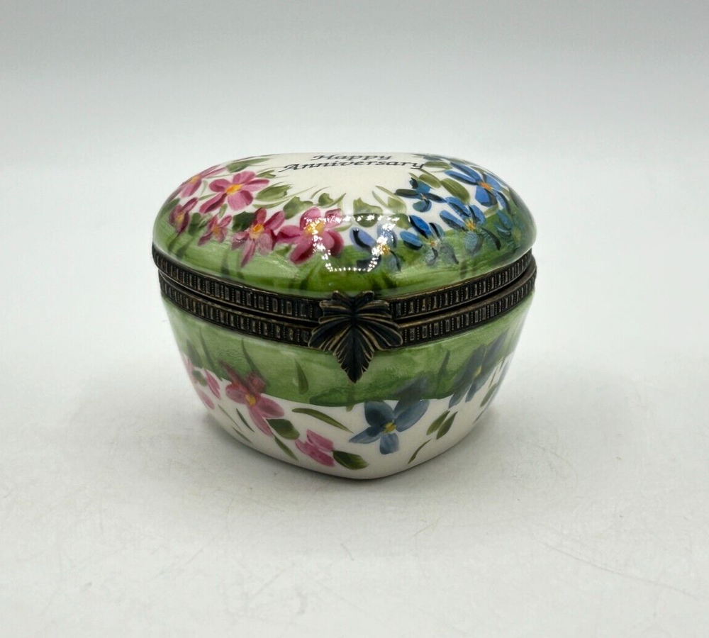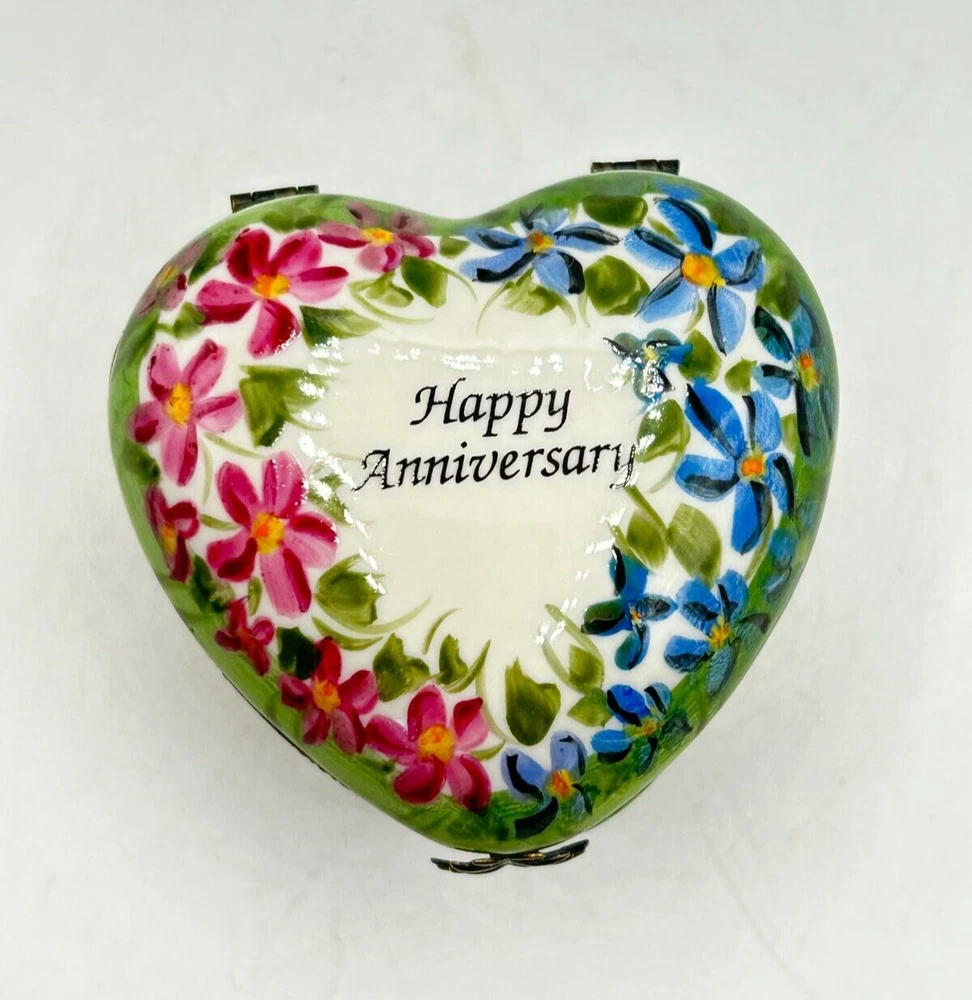 Studio USA Heart Shaped Happy Anniversary Hinged Lidded Porcelain Trinket Box. Very nice used condition. Beautiful blue and pink flowers on top and blue flowers on one side and pink on the other side. Top has Happy Anniversary. Has a nice leaf closure and hinges. Bottom is marked Studio USA. Inside there is a cute single blue flower on the bottom. Small heart box measures approx. 1 1/2"H x 2"L x 2 1/8"W. Comes as seen in the pictures.