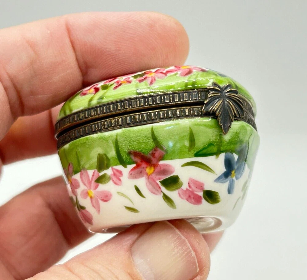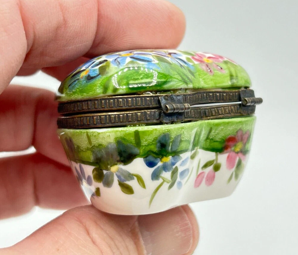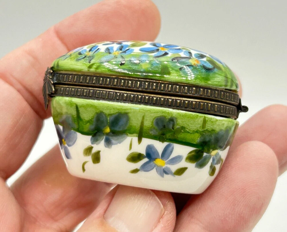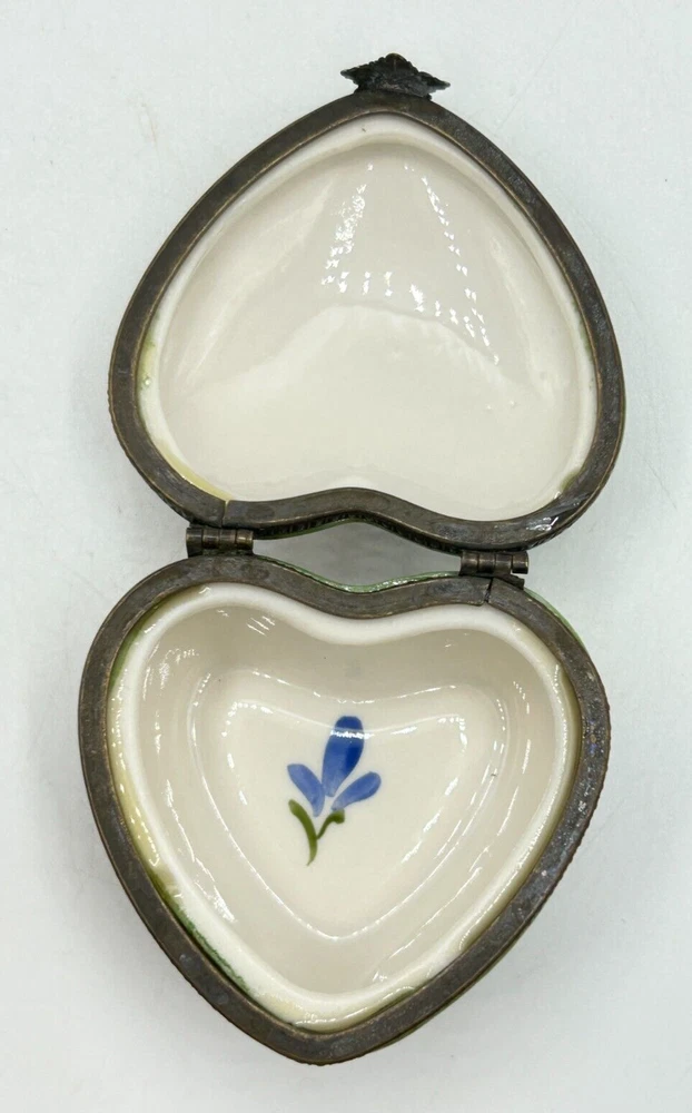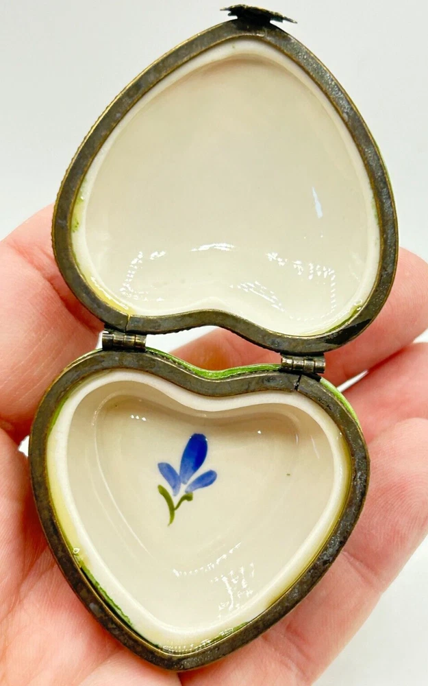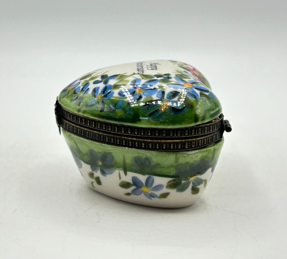 Studio USA Heart Shaped Happy Anniversary Hinged Lidded Porcelain Trinket Box. Very nice used condition. Beautiful blue and pink flowers on top and blue flowers on one side and pink on the other side. Top has Happy Anniversary. Has a nice leaf closure and hinges. Bottom is marked Studio USA. Inside there is a cute single blue flower on the bottom. Small heart box measures approx. 1 1/2"H x 2"L x 2 1/8"W. Comes as seen in the pictures.