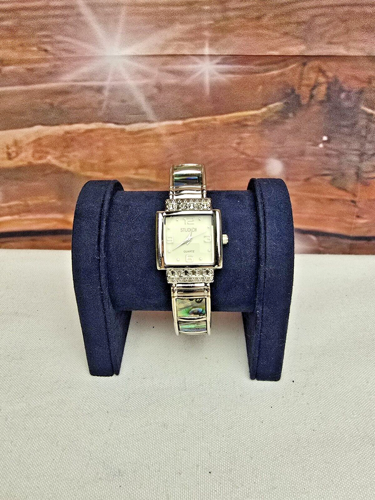 This Studio watch is a stunning blend of elegance and charm! The silvertone square case and abalone inlay bracelet add a touch of sophistication, while the white dial keeps it clean and classic. The quartz movement ensures reliable timekeeping, and the hinged band fits comfortably on most wrists. Perfect for everyday wear, it effortlessly elevates any outfit. A must-have for anyone who loves timeless style with a hint of shimmer!