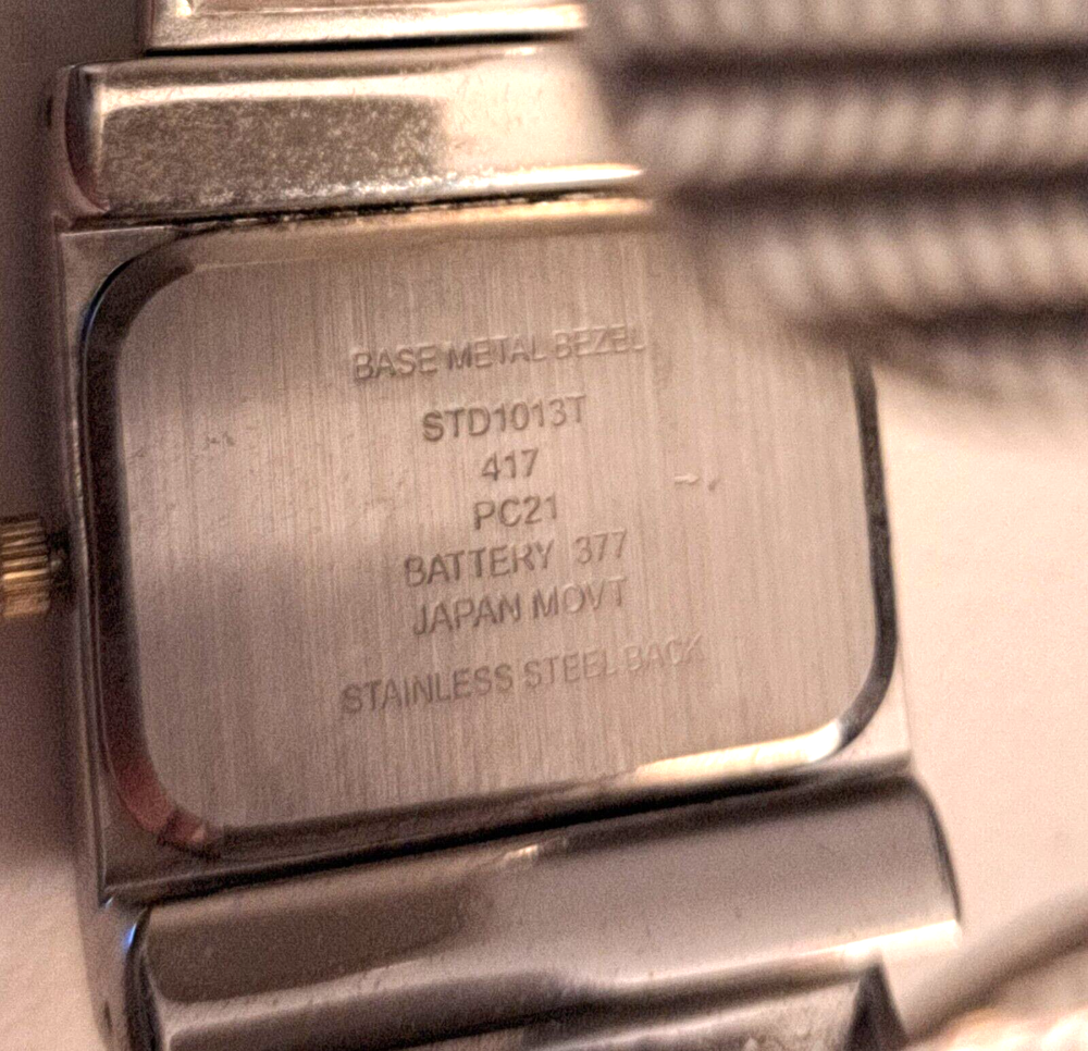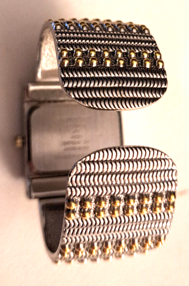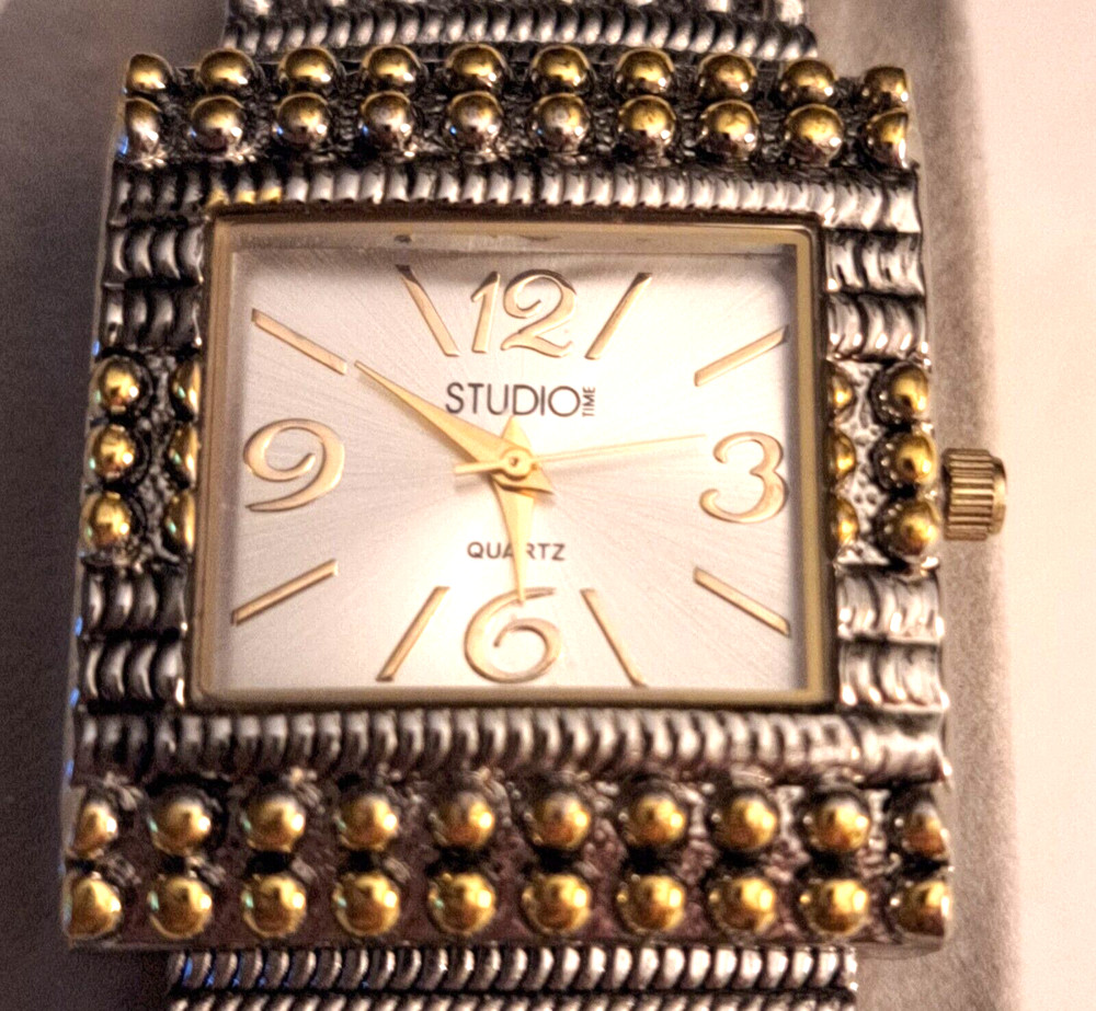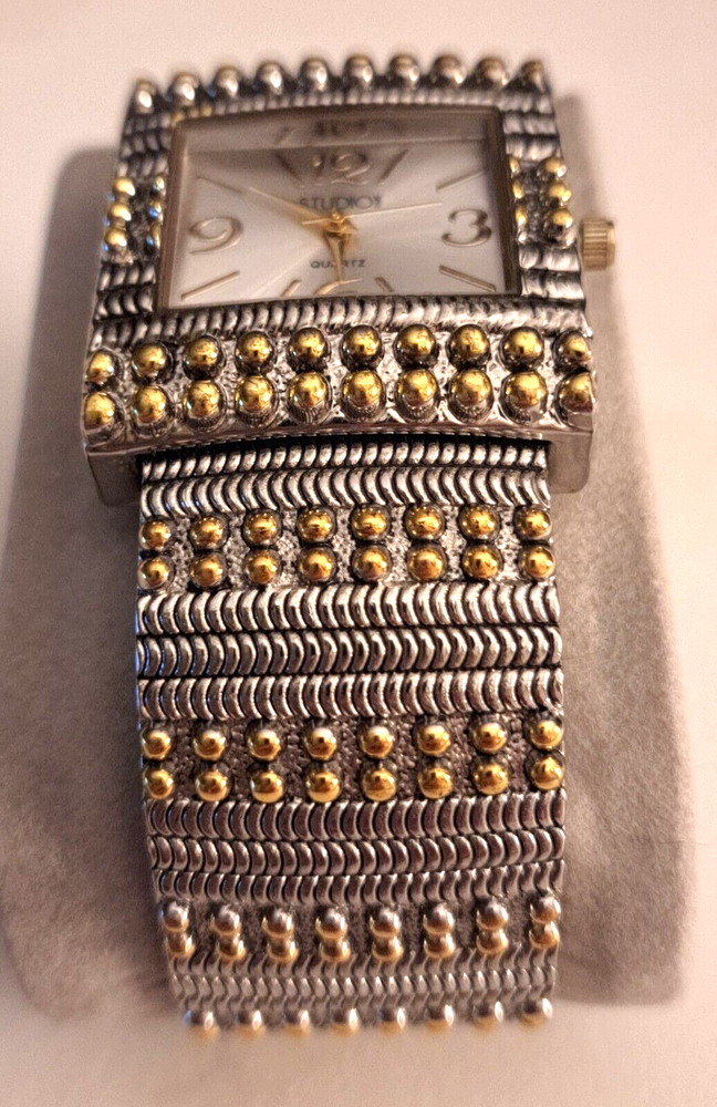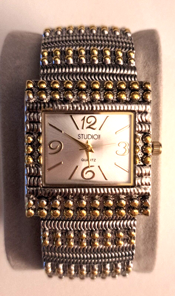 Elevate your style with this stunning Studio Women's Two Toned Cuff Watch. With a sleek silver or gold square-shaped case and a white dial, this dress/casual watch features Arabic numerals and stick indexes, a quartz movement, and a bangle band. The watch also boasts a 12-hour dial and a seconds hand, making it both functional and fashionable. This wristwatch is perfect for women who are looking for a timeless accessory that can be worn for any occasion. Whether you're attending a formal event or just running errands, this watch will complement any outfit. Don't miss out on the chance to own this beautiful timepiece.