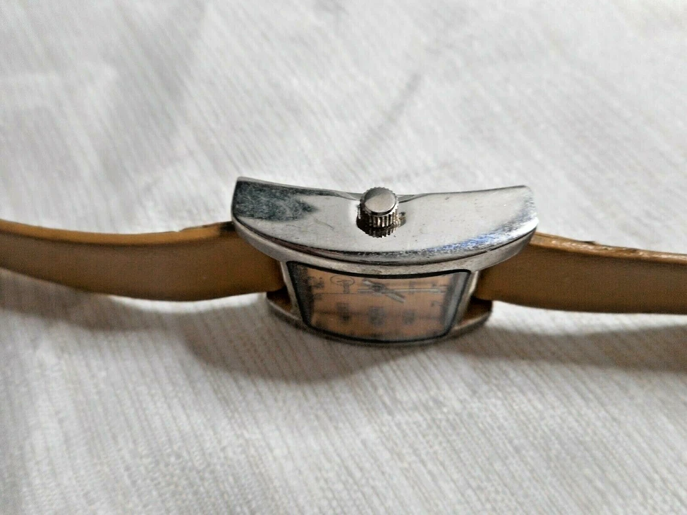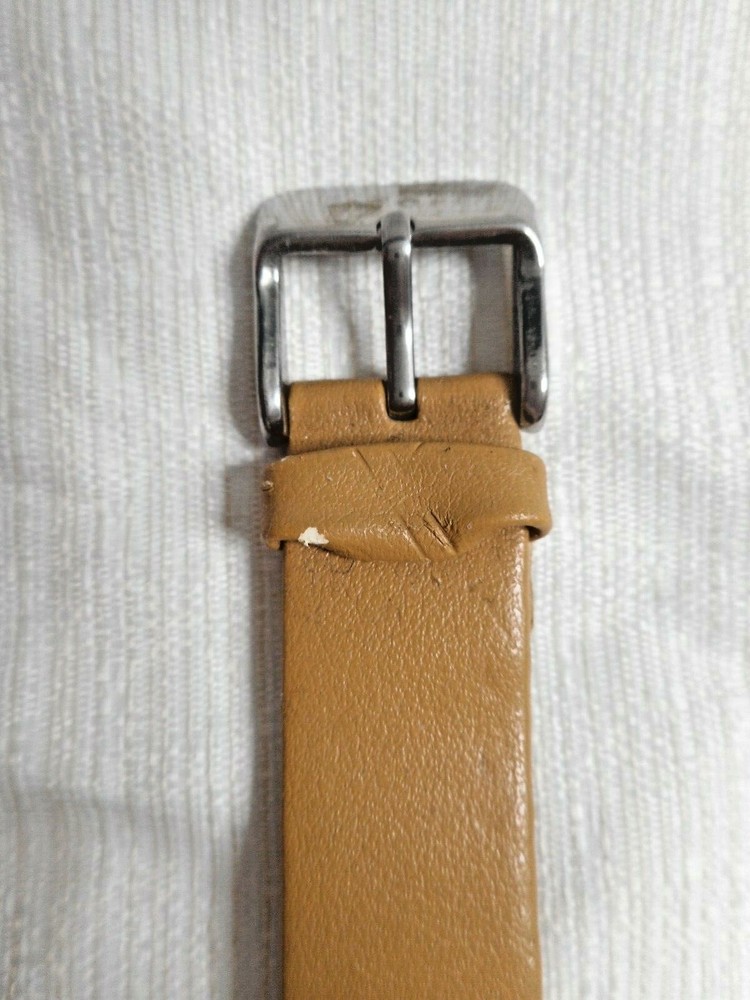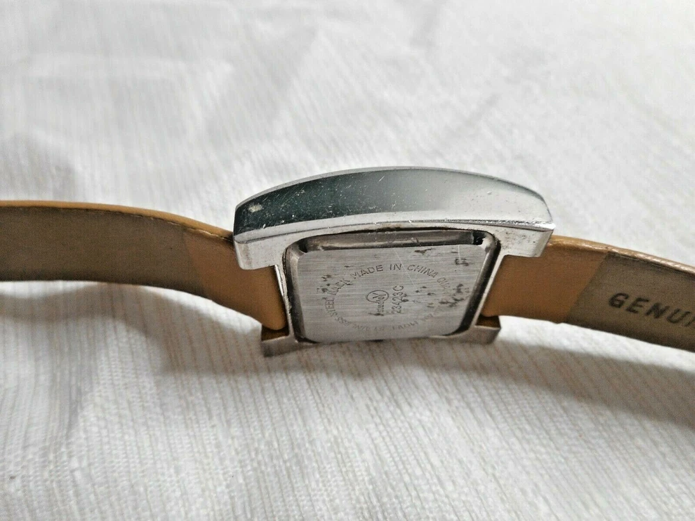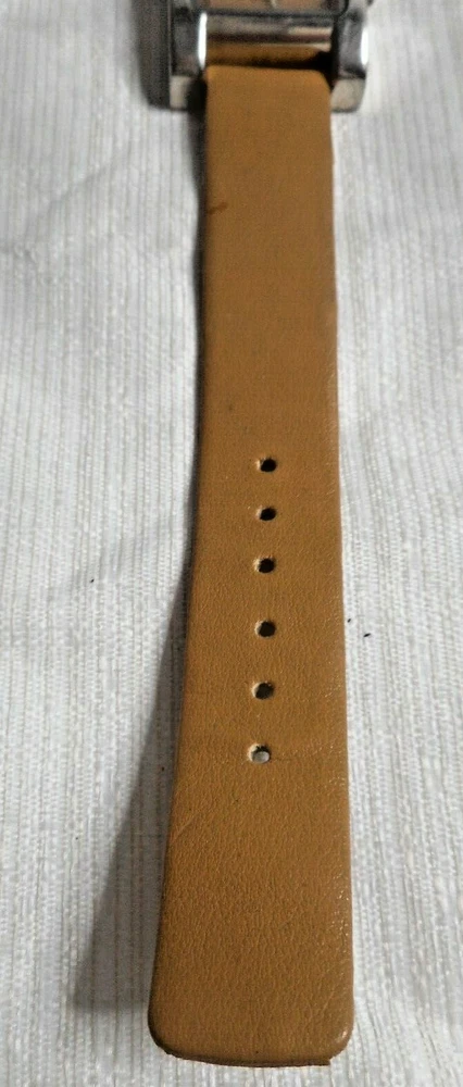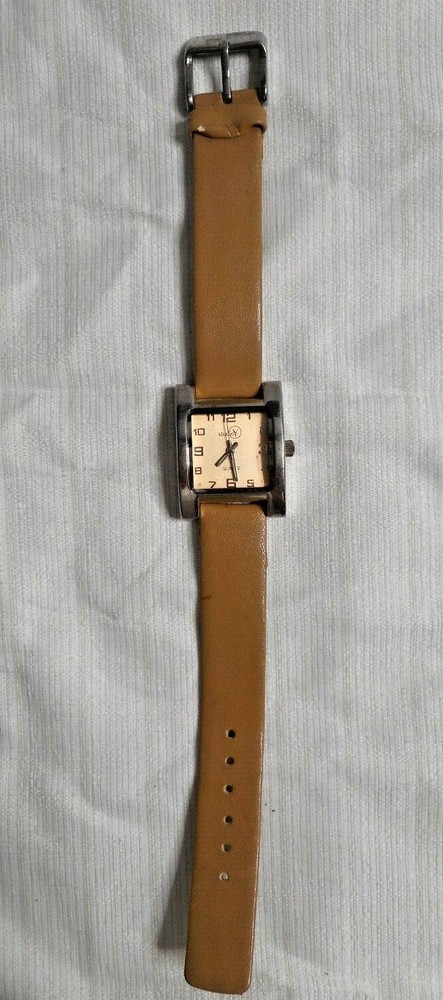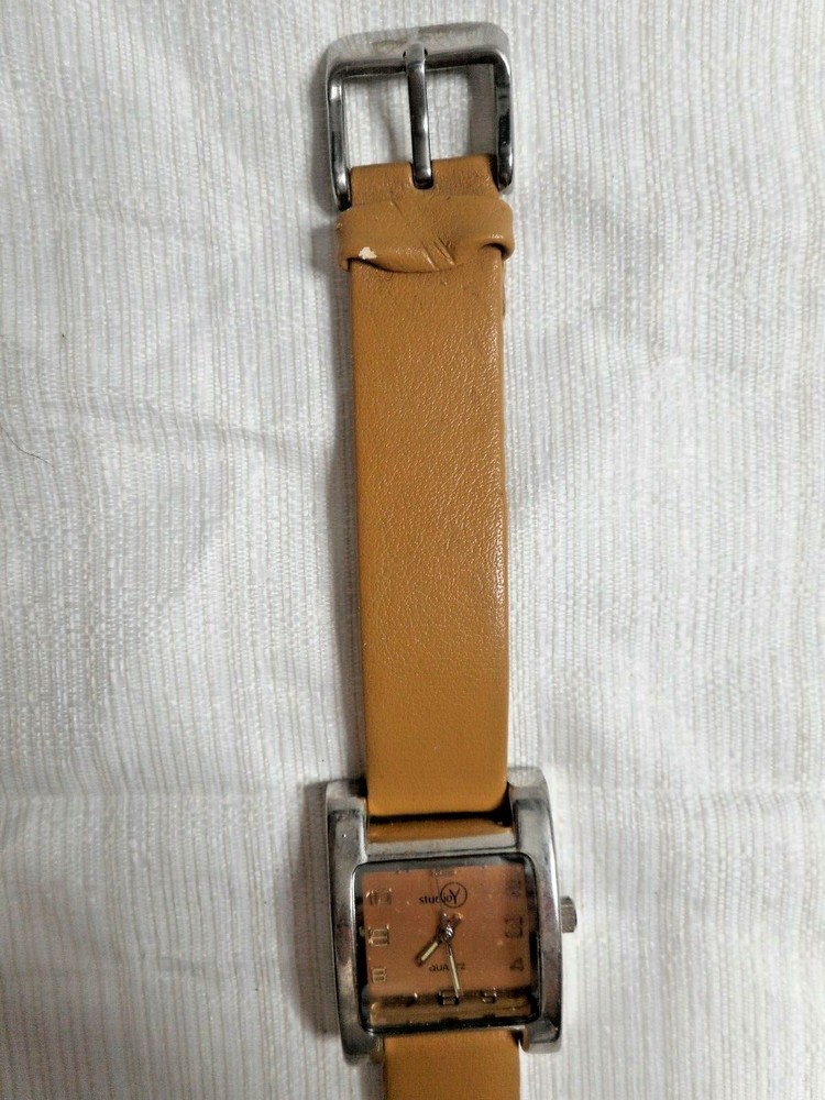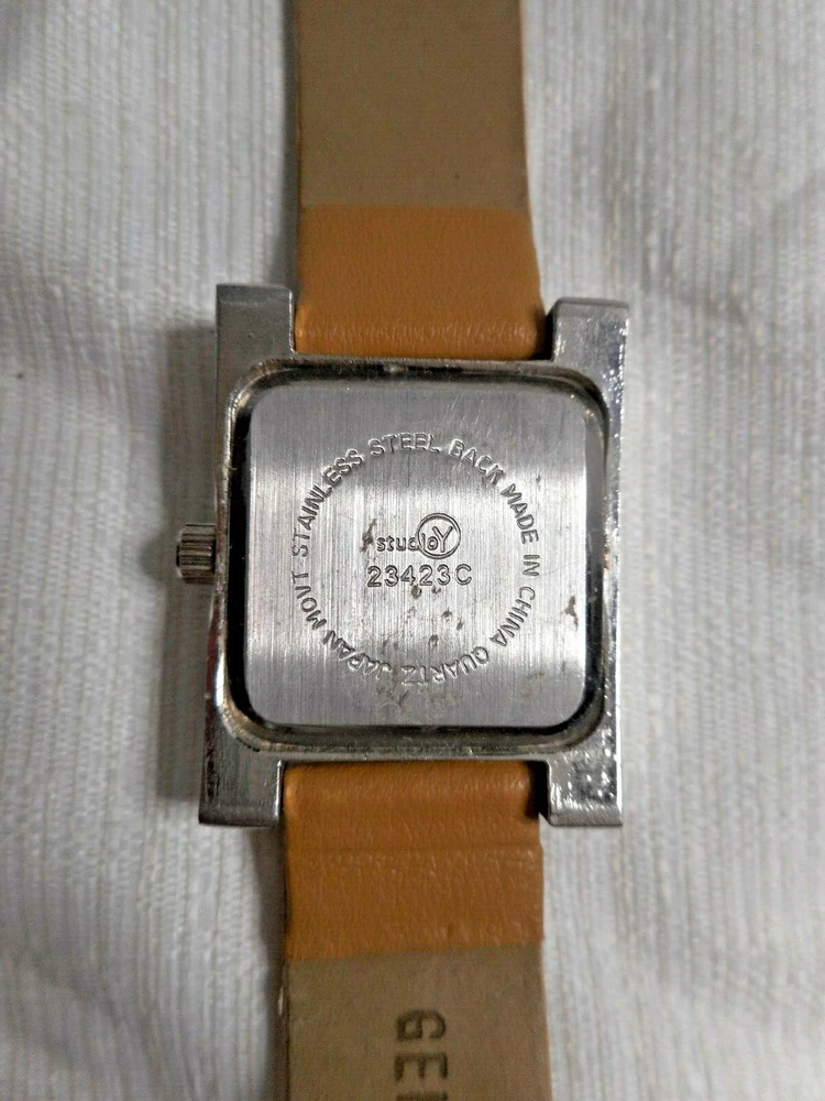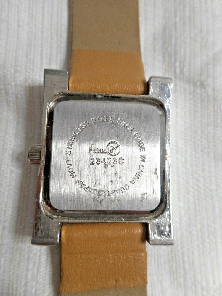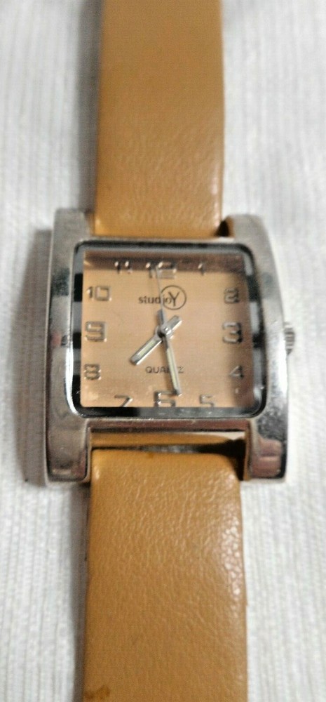 Studio Y Ladies Quartz Stainless Steel 23423C Tan w Tan Leather Band Japan Movement Watch is not working ...might just need a new battery ... purchased 8-9 years ago to give to one of my grandchildren. Parents already bought them one so this was put in my jewelry box all these years Pre-owned used condition ... selling AS IS Watch measures 8 3/4 inches long ... face measures 1 1/4" long x 1 inches wide x 3/8 inches thick