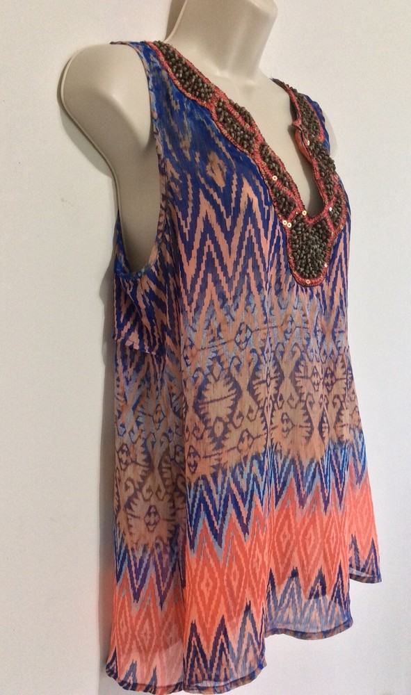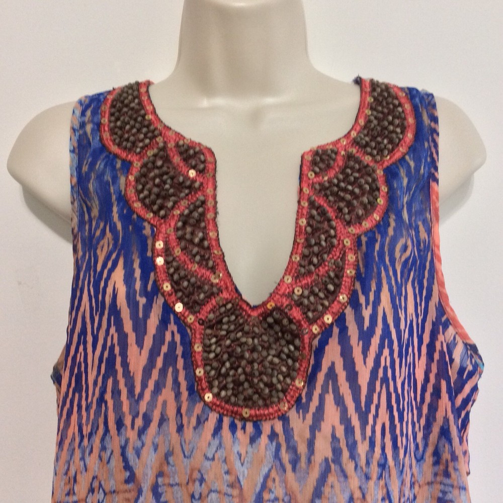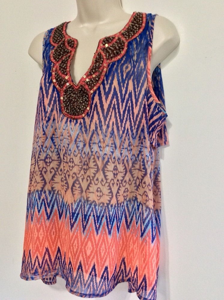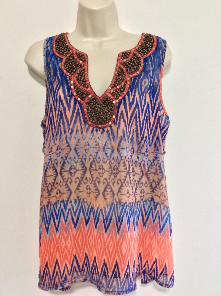 Studio Y Tank Top Blue Peach Aztec Embellished Neck Sheer Sweetheart Neck. No stains, rips or tears. p i t t o p i t 2 0 arms Sleeveless length 2 6 .