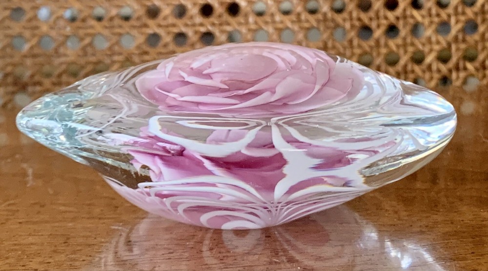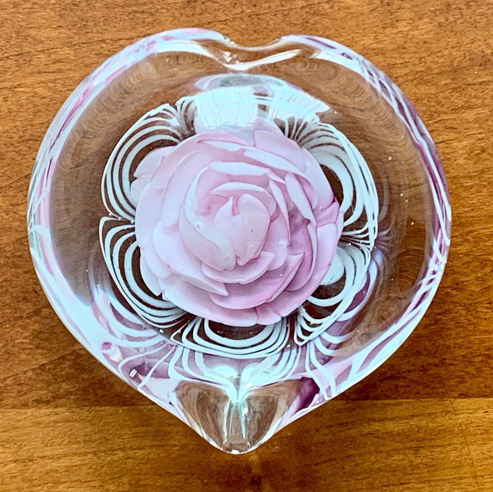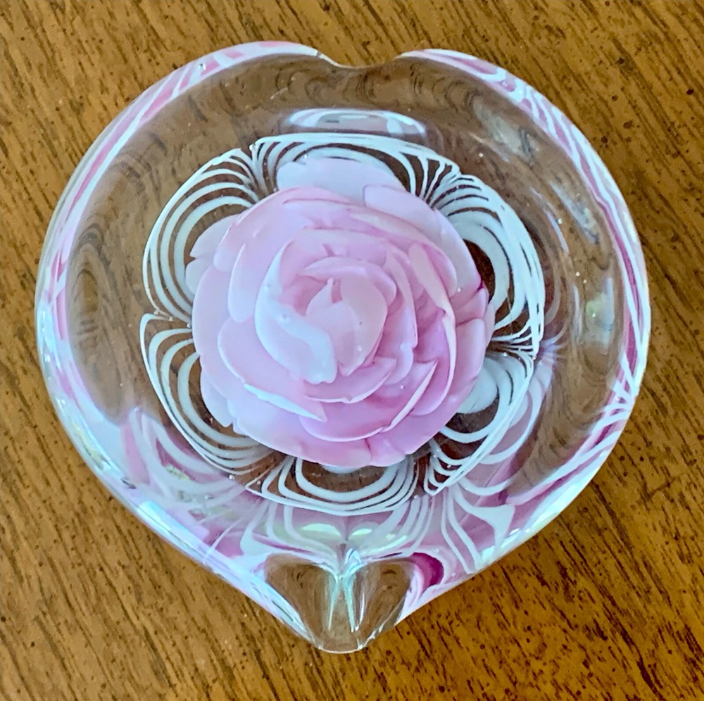 vintage art glass heart shaped paper weight w/pink rose & white swirls 3.75” x 4” in excellent condition.