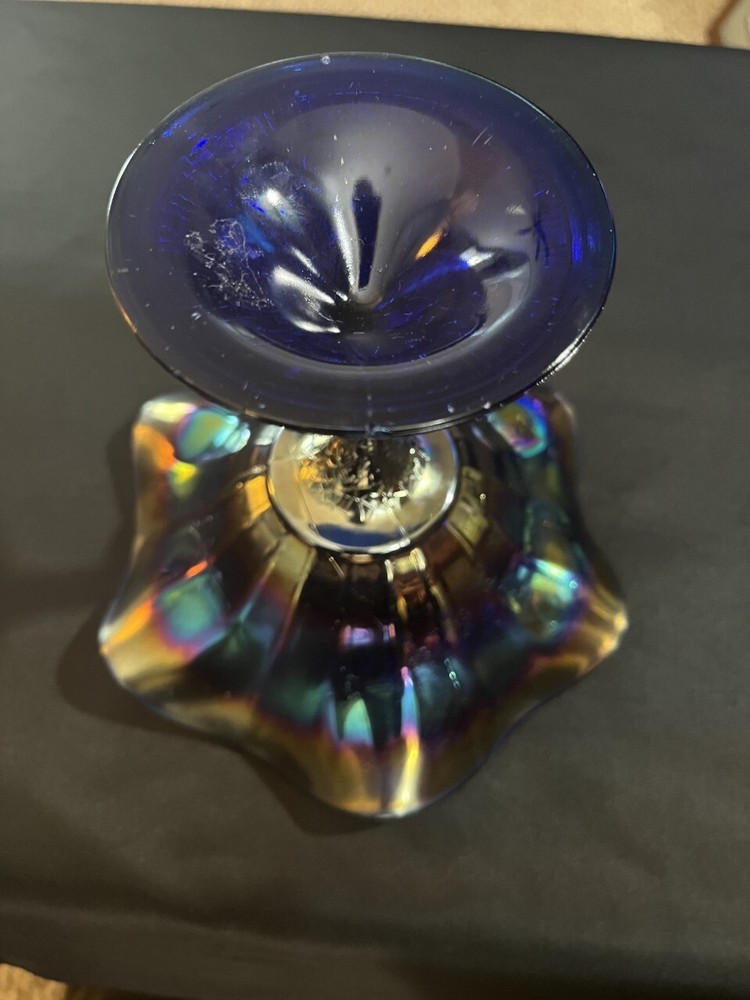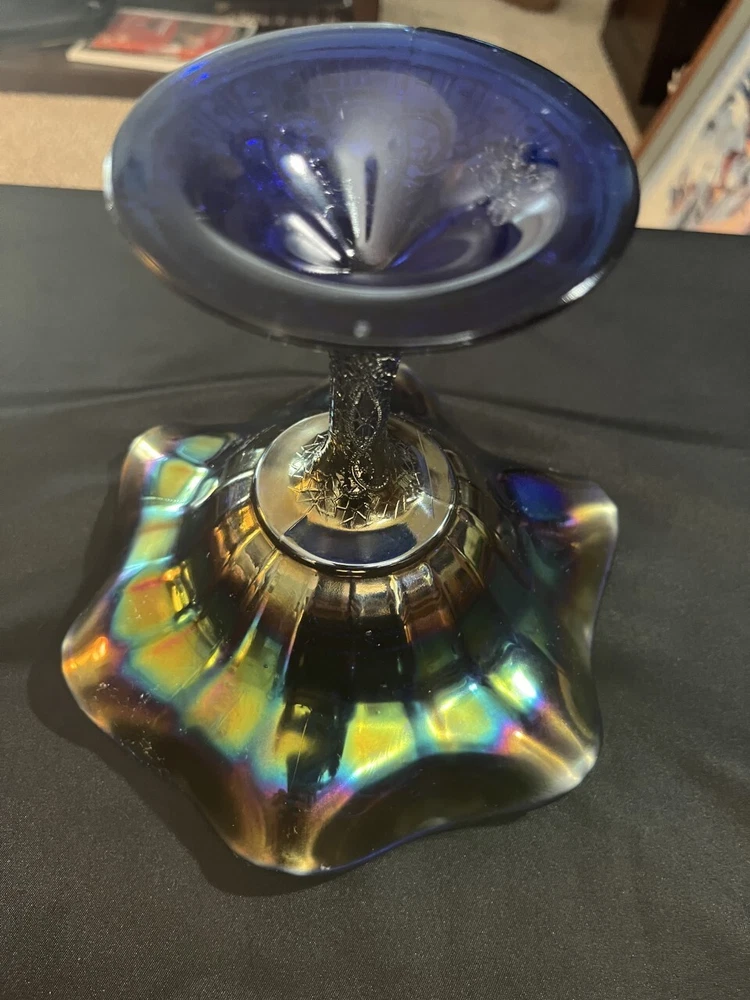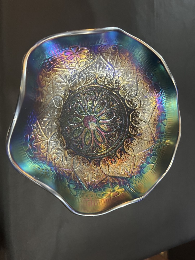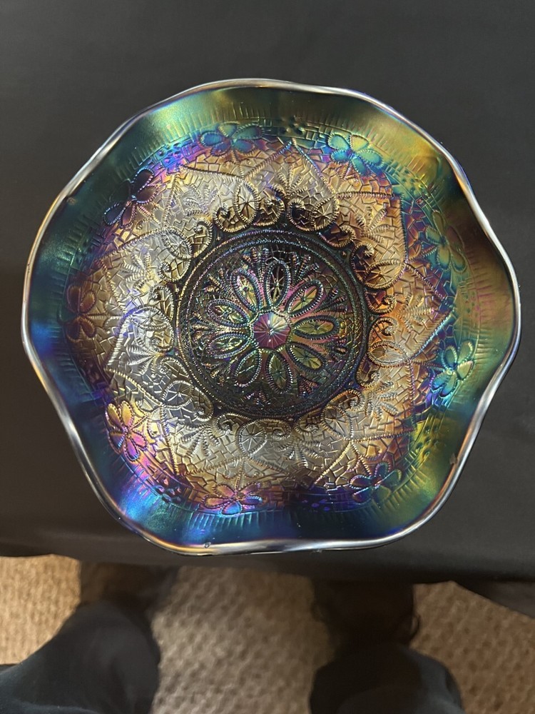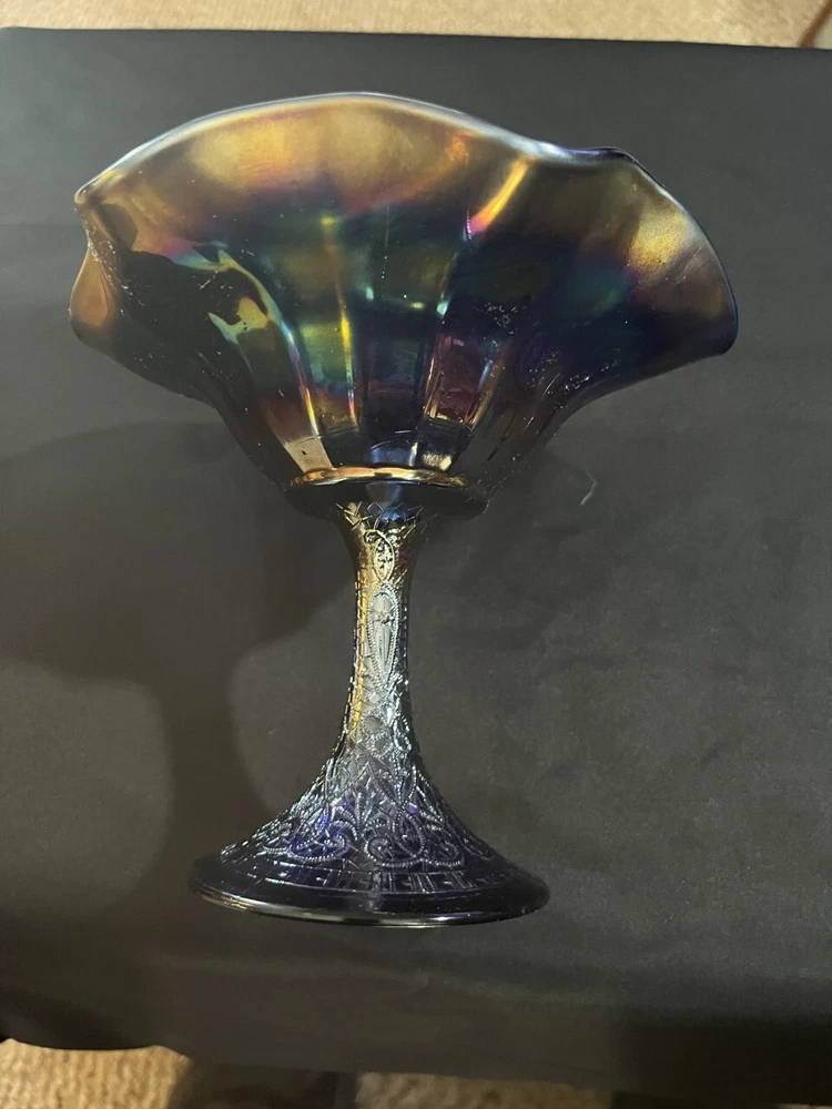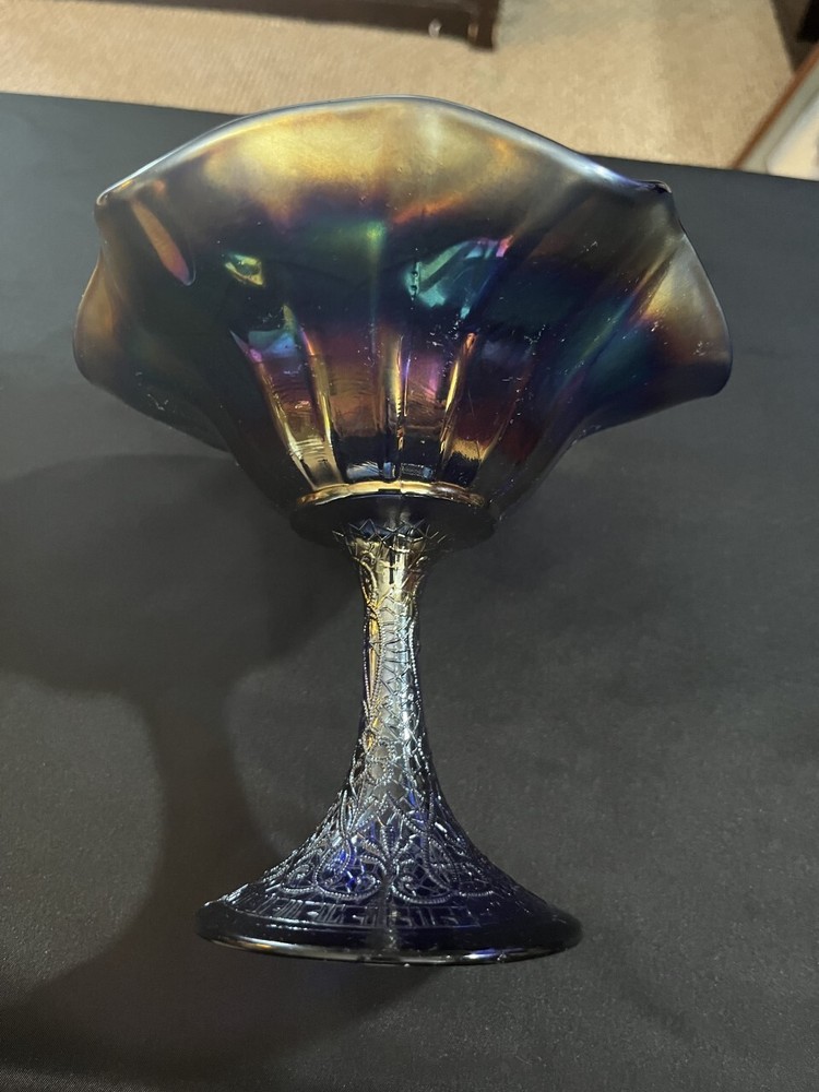K#13 M# 26A Here is a gorgeous Northwood Electric Blue Hearts and Flowers compote with gorgeous greens, blues, purples, pinks, and golds. Absolutely STUNNING. In outstanding condition with no chips cracks dings or wear. A top shelf piece as far as color and condition are concerned. Zoom in on this piece to see the real beauty. Carnival glass is priced and valued based on color and condition and this is at the top of the class. I will ship this out within 3 business days of receiving payment using USPS Priority. For continental US shipping only, all others please email for a shipping quote. Thank you for looking. Please follow me and glassguy1958 for we are both listing some stunning glass in the coming month.