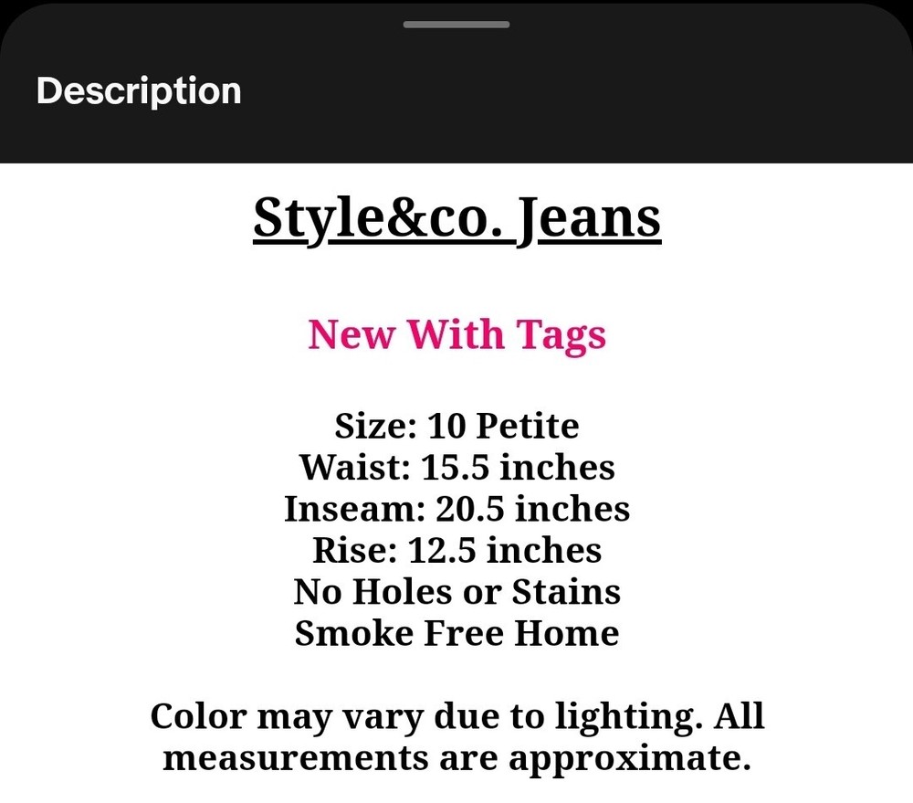Style&co. Jeans New With Tags Size: 10 Petite Waist: 15.5 inches Inseam: 20.5 inches Rise: 12.5 inches No Holes or Stains Smoke Free Home Color may vary due to lighting. All measurements are approximate. PAYMENT Payment is due within four days of purchase. eBay will automatically open an unpaid case if payment is not received by the fourth day. Please contact us if payment arrangements need to be made. We're always willing to work with our customers to ensure a pleasant transaction. SHIPPING We offer guaranteed one business day shipping. After payment is received, all items are shipped the following business day: Monday – Friday. Shipping confirmation and a tracking number will be automatically generated and uploaded. RETURNS Your complete satisfaction is our number one priority. We offer a no hassle thirty-day return policy. Refunds, minus the original shipping charge, are issued once the item has been received in the same condition as it was sent. Buy with confidence! CONTACT US Please don't hesitate to contact us if you have any questions.