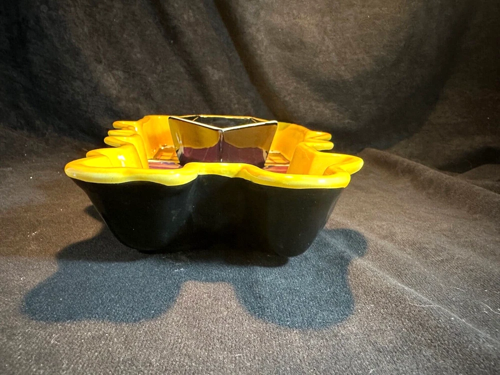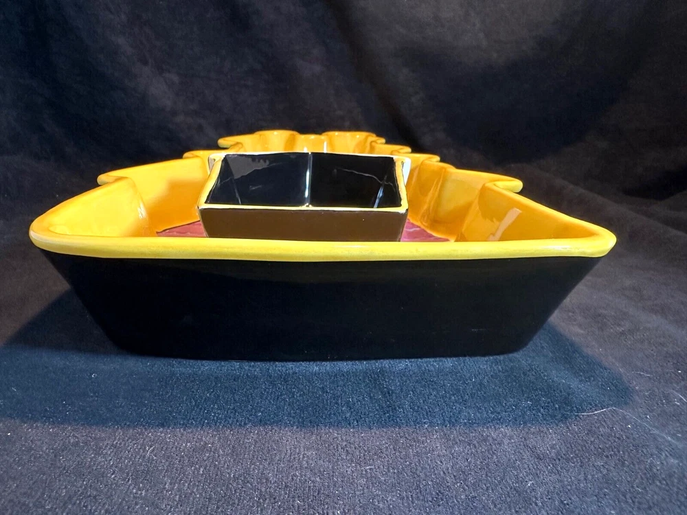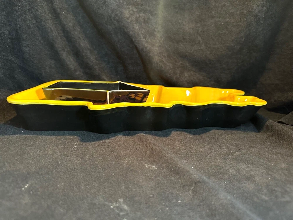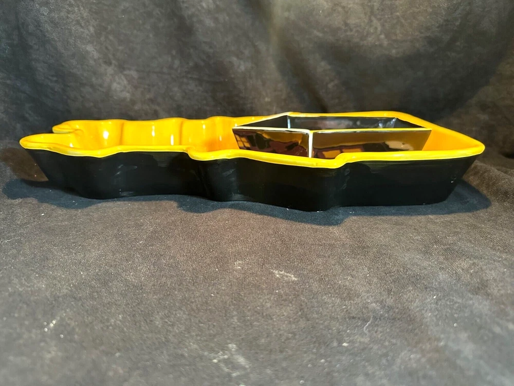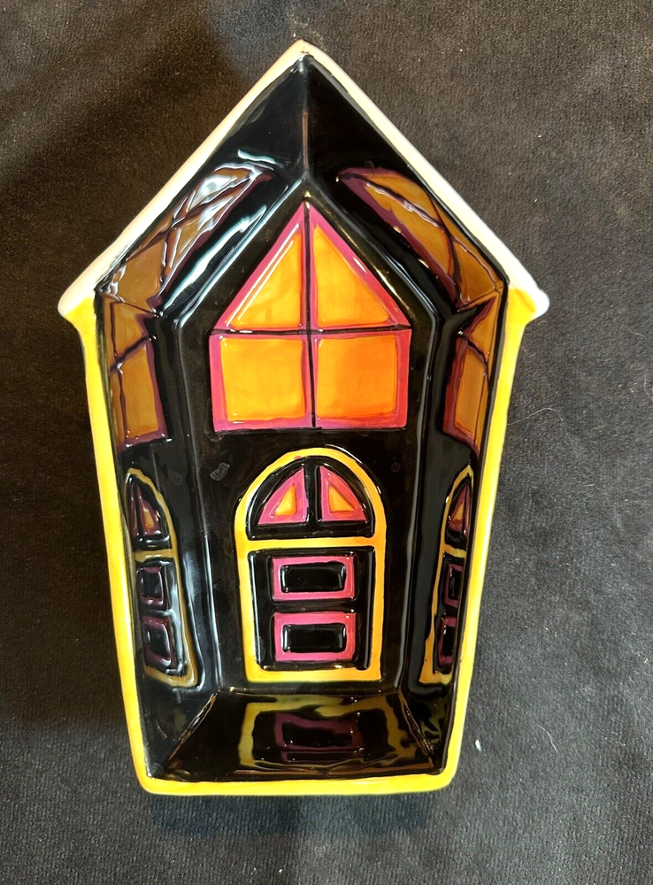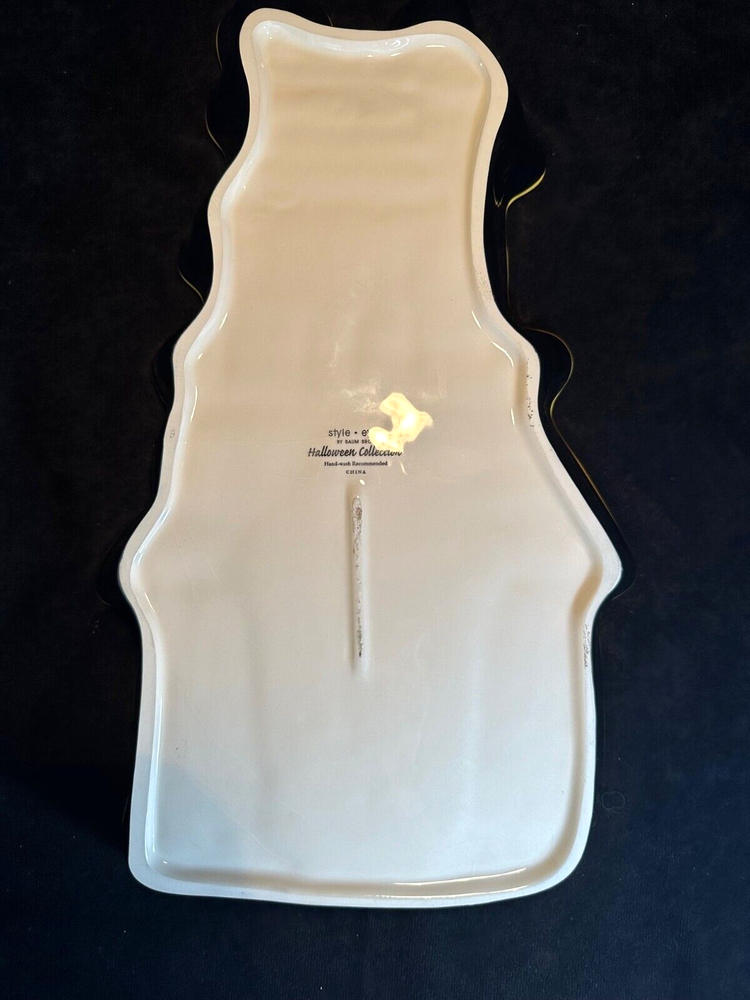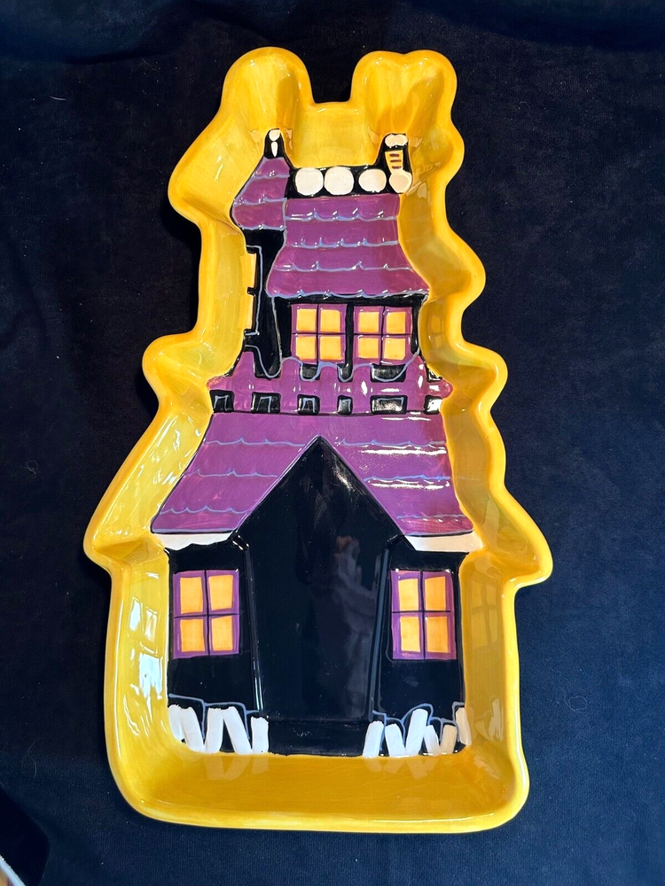 Style Eyes by Baum Bros. Halloween Collection Haunted House Chip & Dip Tray This is a unique set in excellent condition with no chips or cracks. The chip tray is shaped like a haunted house and is hand painted. It's about 14 1/2" long and 8 3/4" at it's widest. The sides are 2" high. The makers marks are on the bottom. The dipping bowl is shaped like the front door and sit in an impression in the tray. It's 6 3/4" long, 4 1/4" wide and 2" high. It weighs about 3 lbs. See Pics.