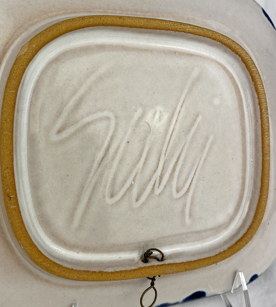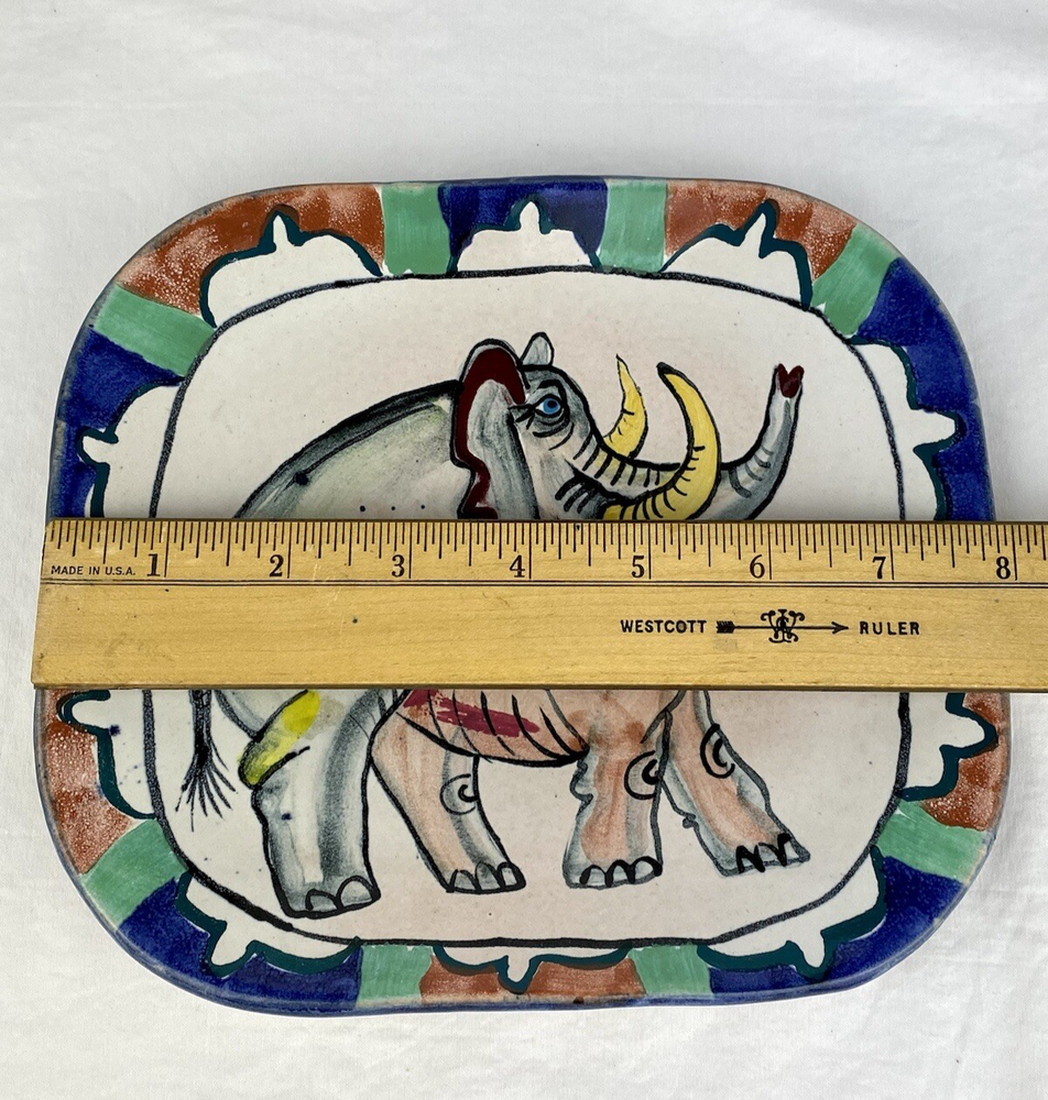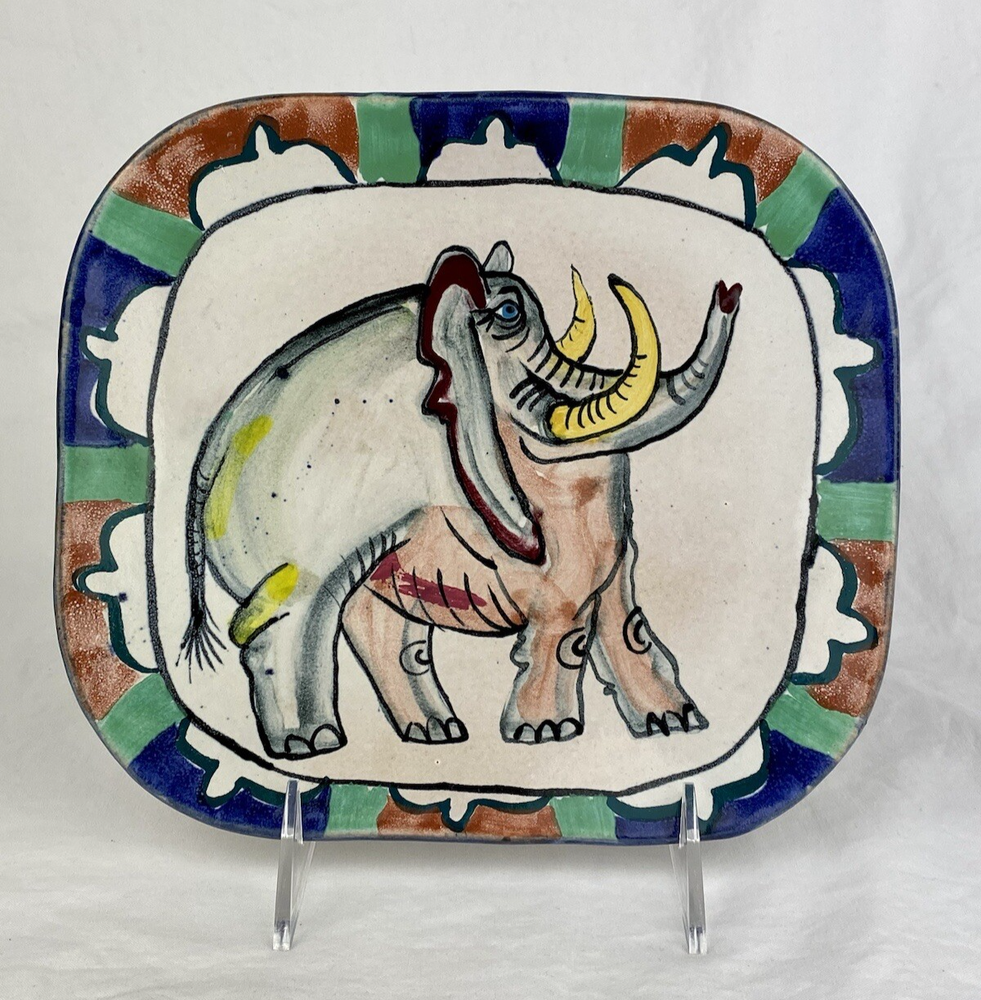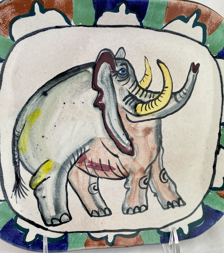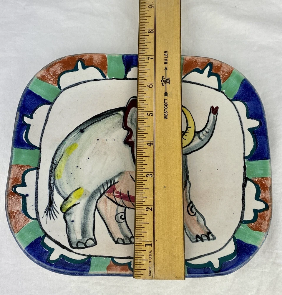 Suki Diamond Studio Artisan Pottery Plate Signed Hand Painted Colorful Elephant with Tusks Design. ~Suki Diamond makes her coveted majolica tableware collection by hand. She paints decorative patterns and animal themes in her distinctive style using stains and oxides. All table and serving ware is lead-free, dishwasher and microwave safe.~ Handmade in Sonoma County, USA Made to hang on the wall as art or display in a plate rack. In excellent condition. No chips or cracks. See photos as they are part of the description. Thank you for visiting!